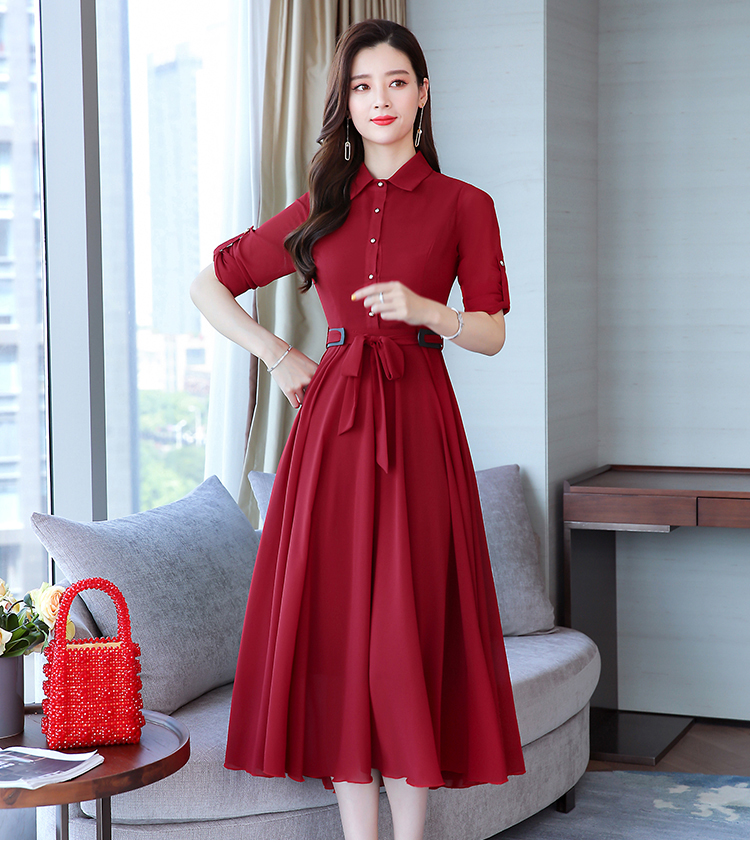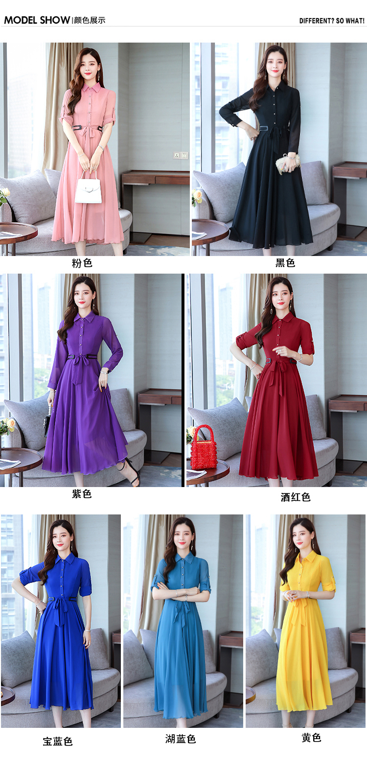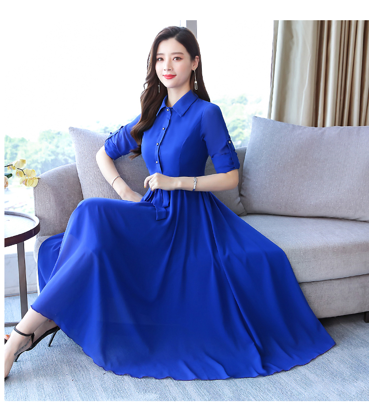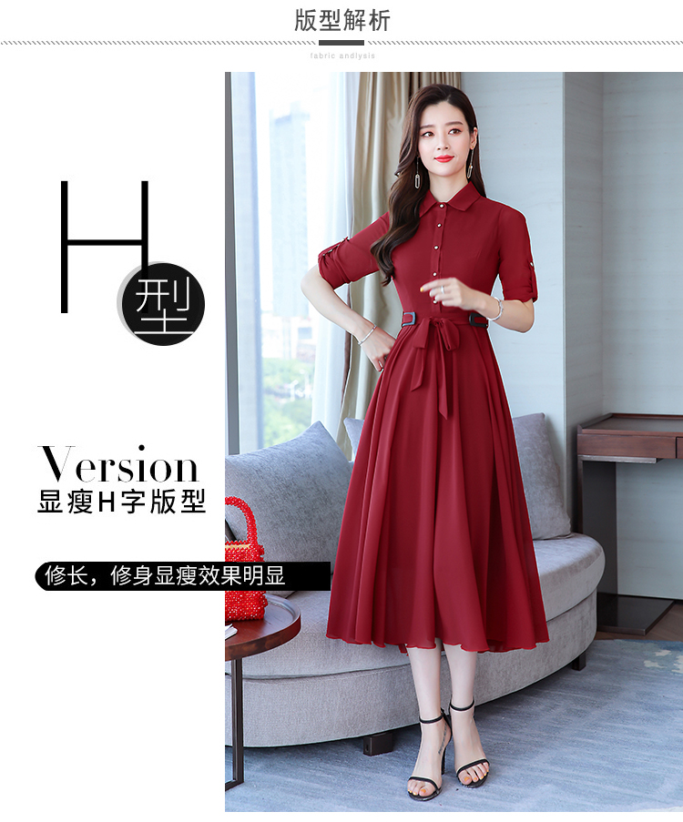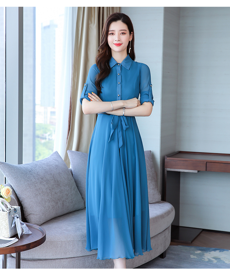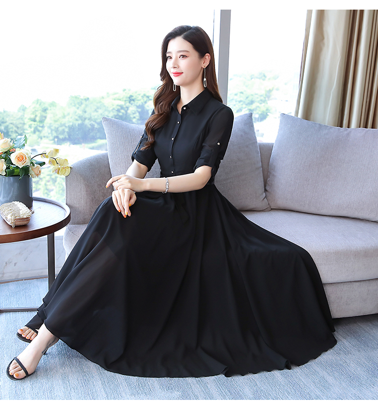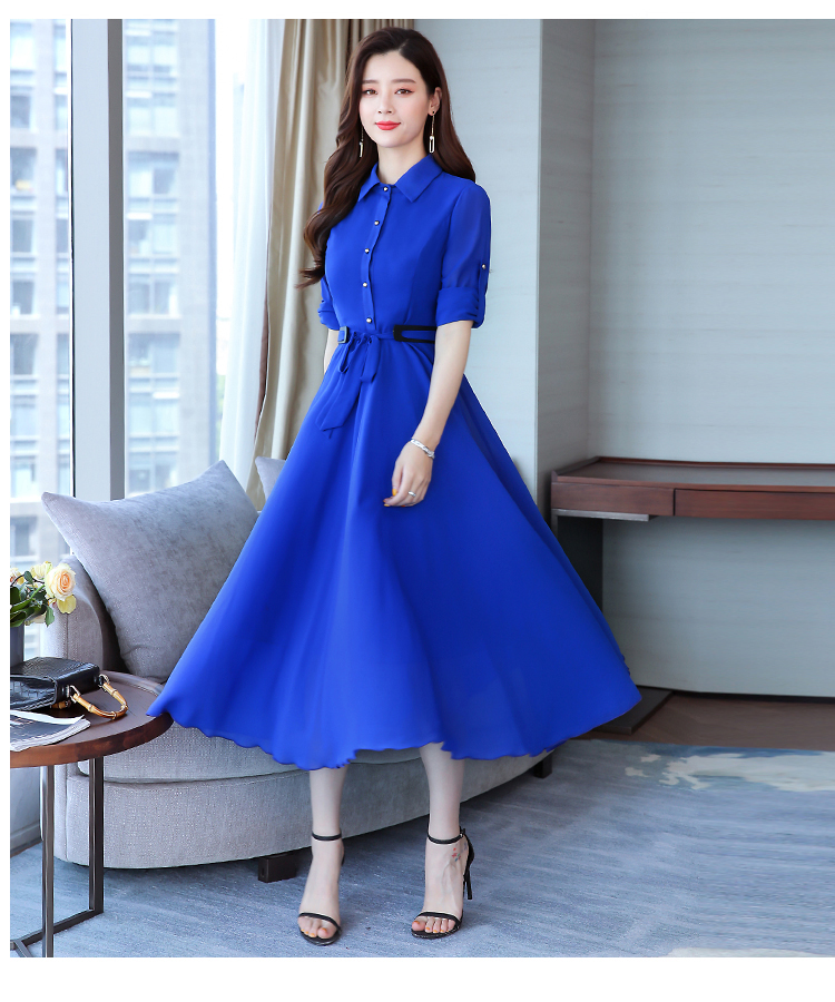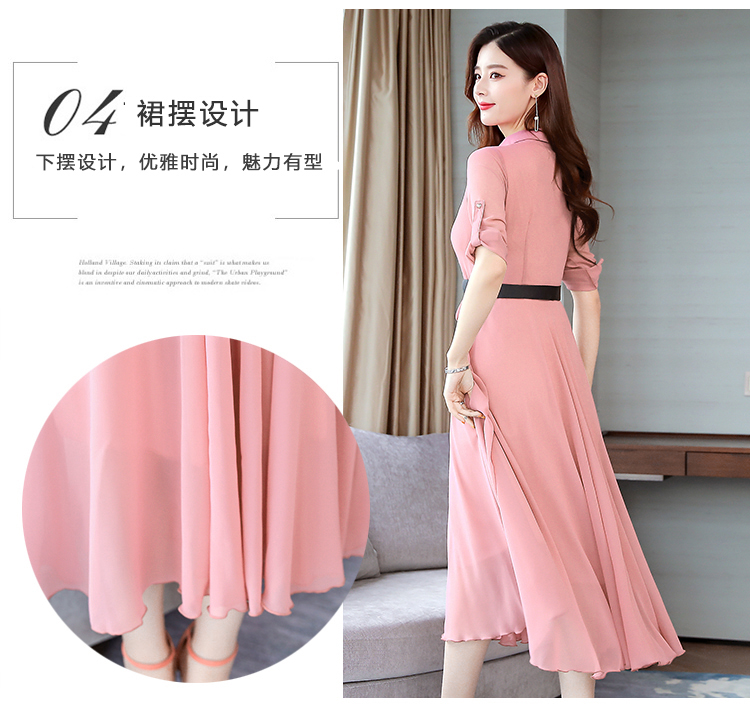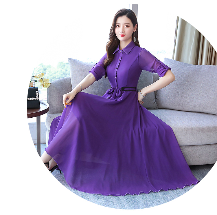 2019秋季新款韓版時尚優雅氣質通勤修身顯瘦中長款長袖雪紡連衣裙1入