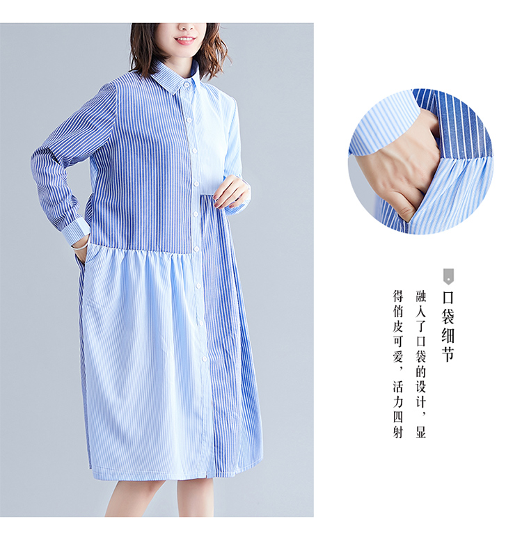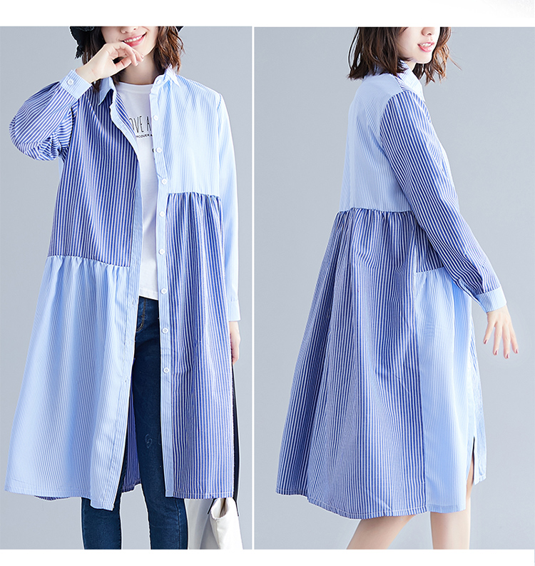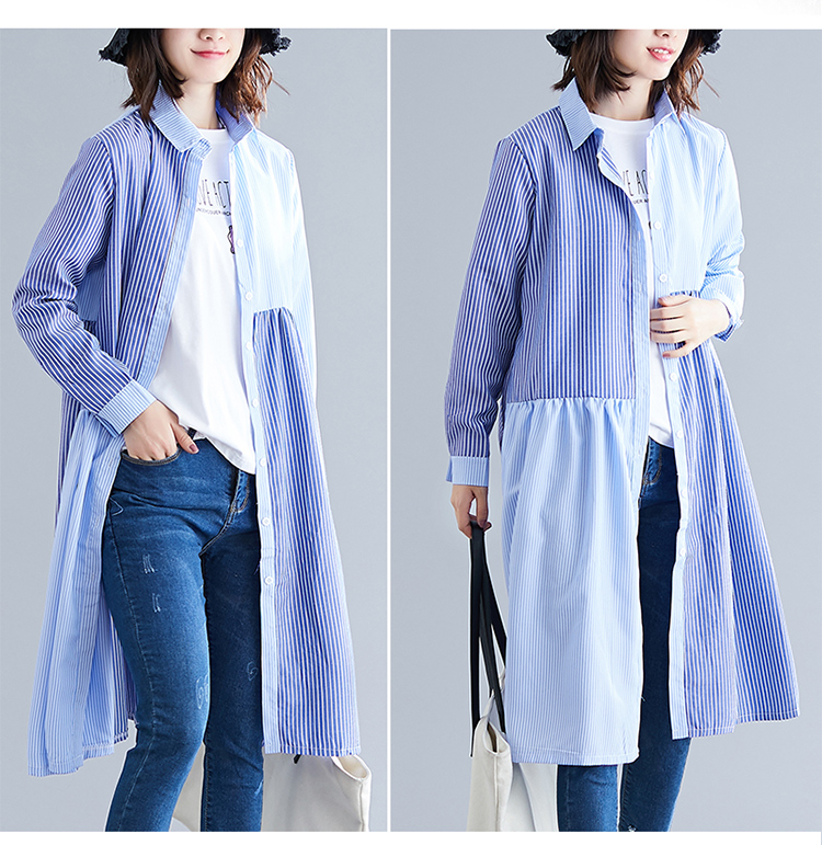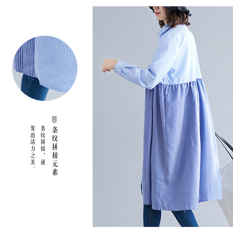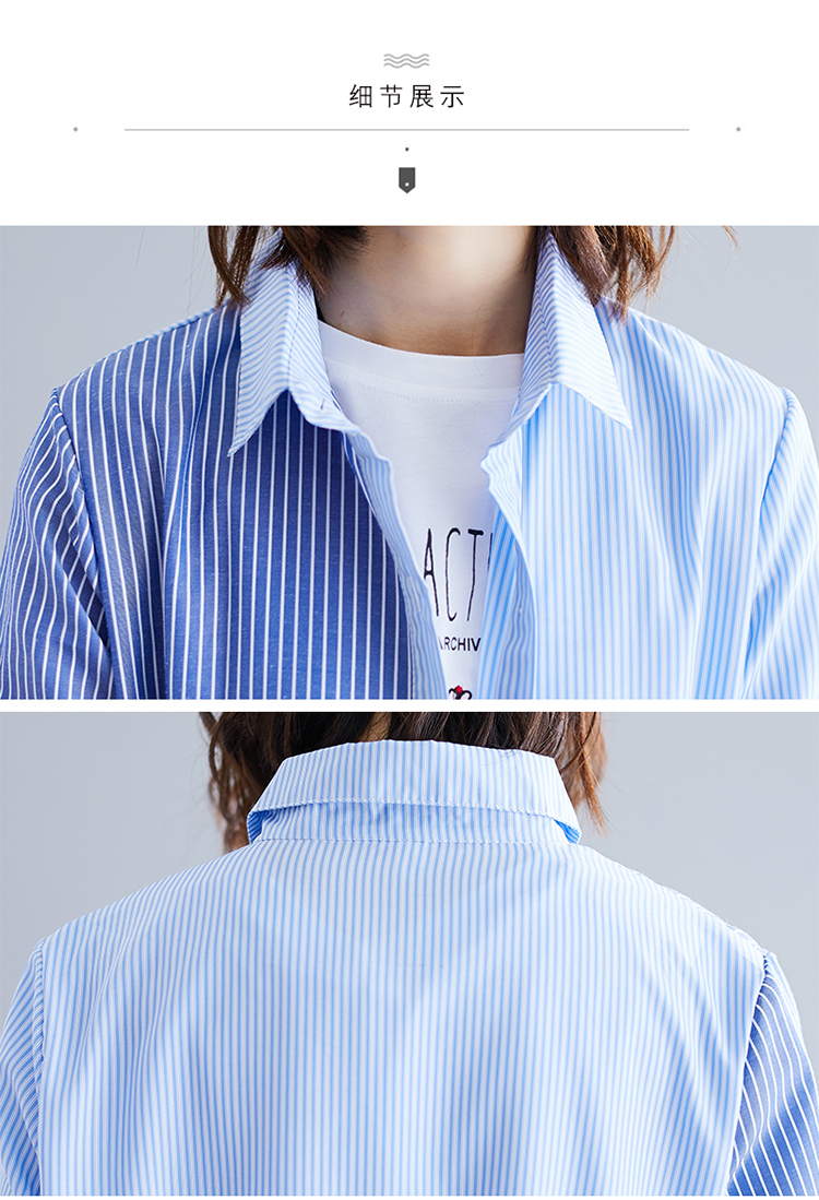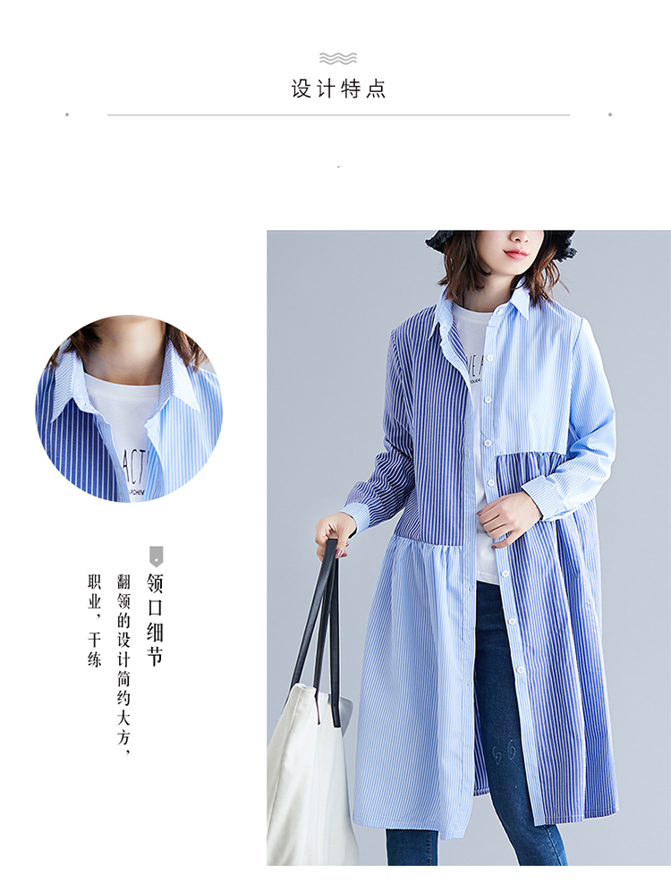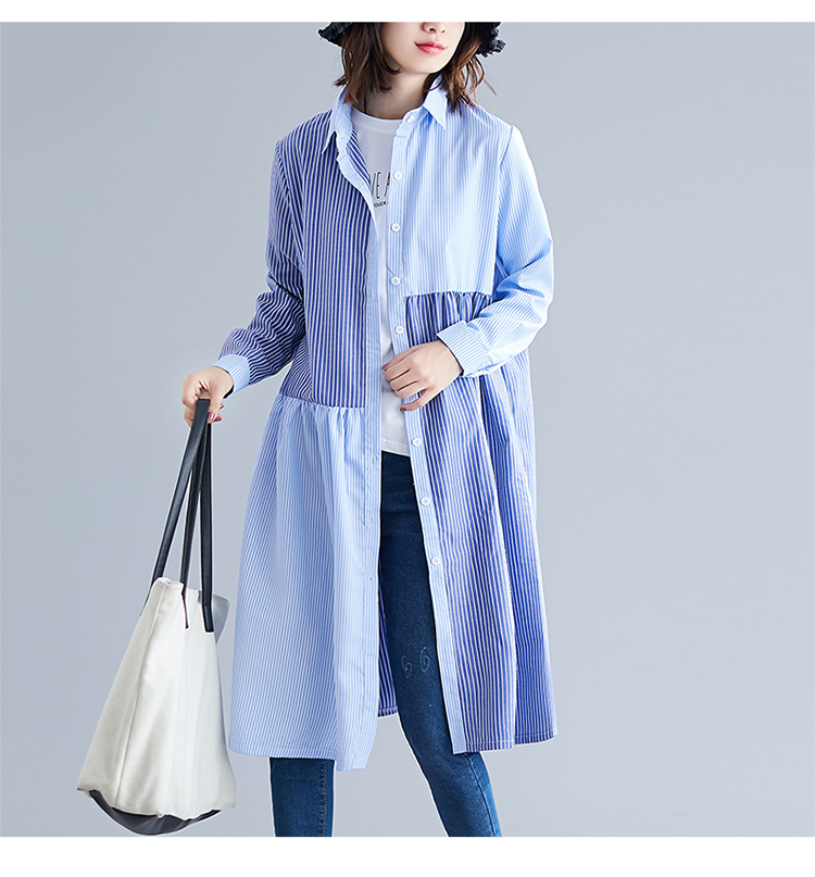 2019秋季新款韓版復古文藝大碼寬松中長款條紋拼接長袖百搭襯衫女1入