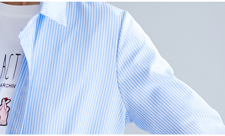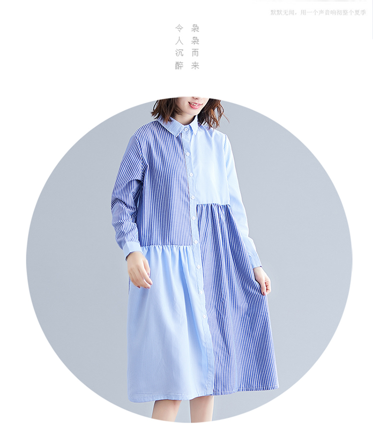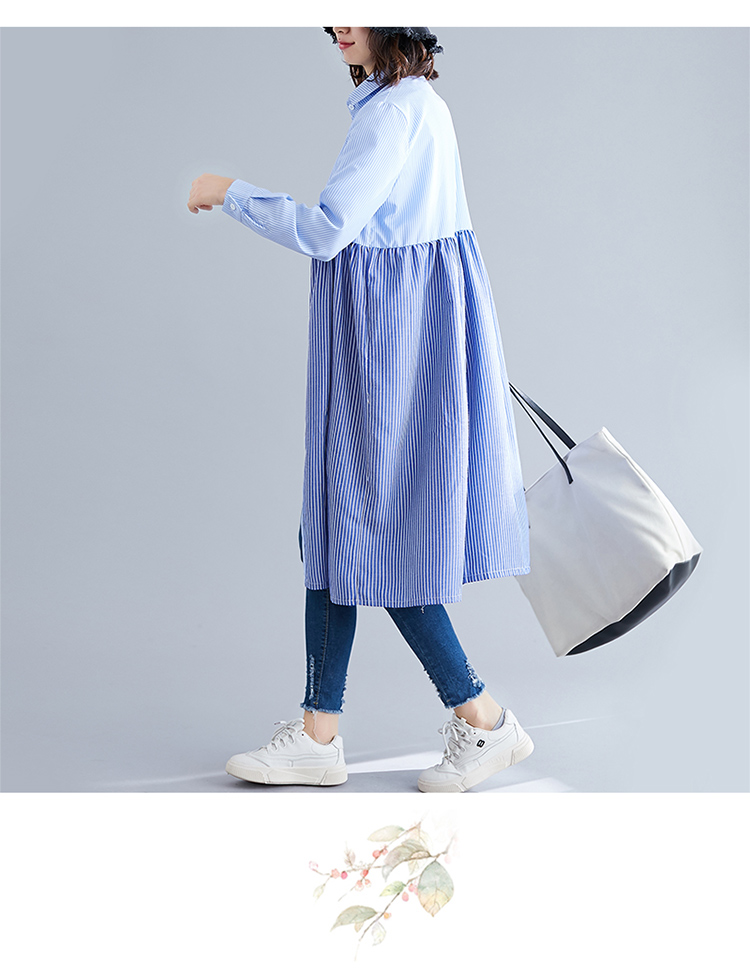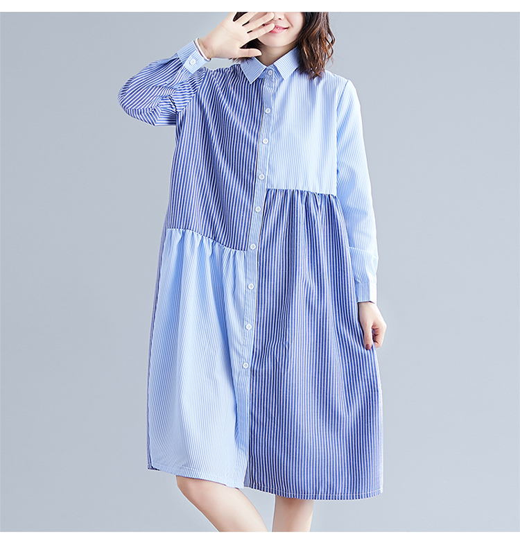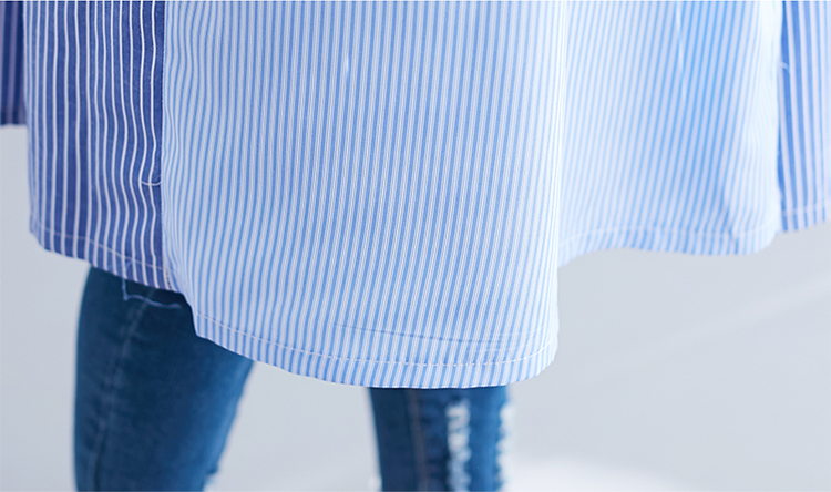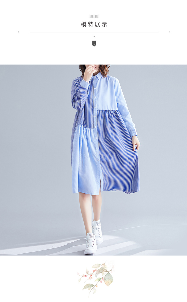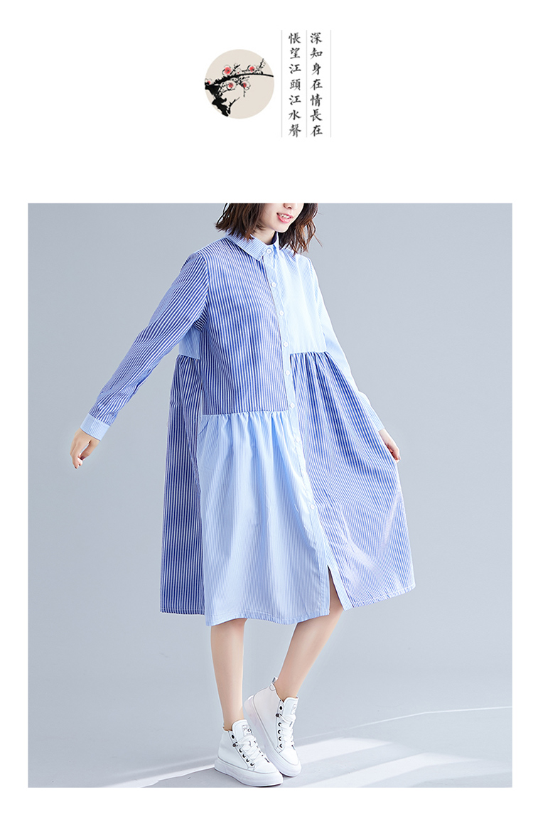 2019秋季新款韓版復古文藝大碼寬松中長款條紋拼接長袖百搭襯衫女1入