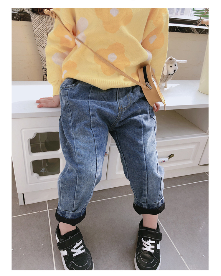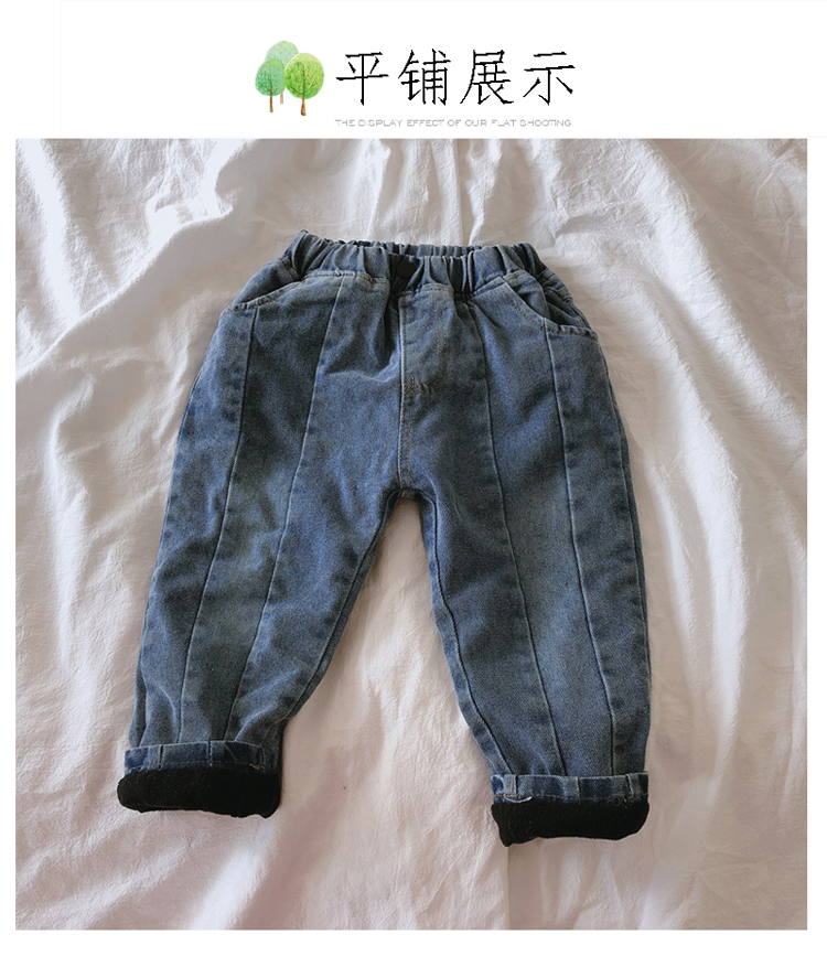 2019冬季中小童帥氣雙層加絨加厚牛仔褲 男女童舒適松緊腰休閑褲1入