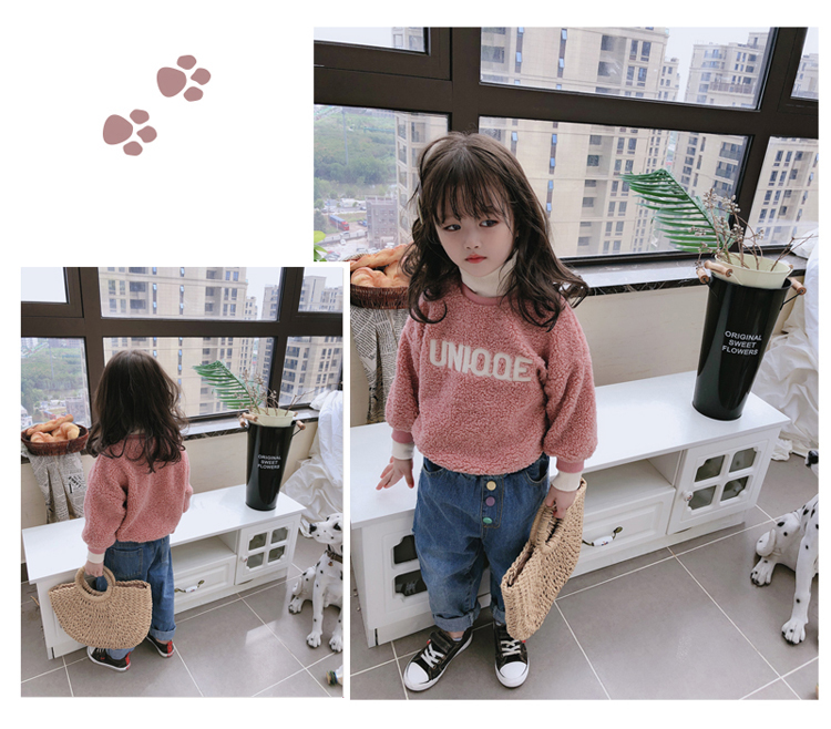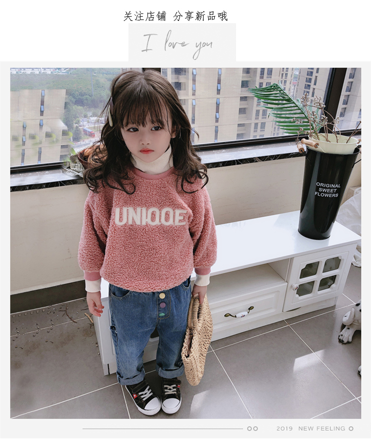 2019中小童冬季新款 女童甜美羊羔絨寬松衛衣 加厚保暖拼接領上衣1入