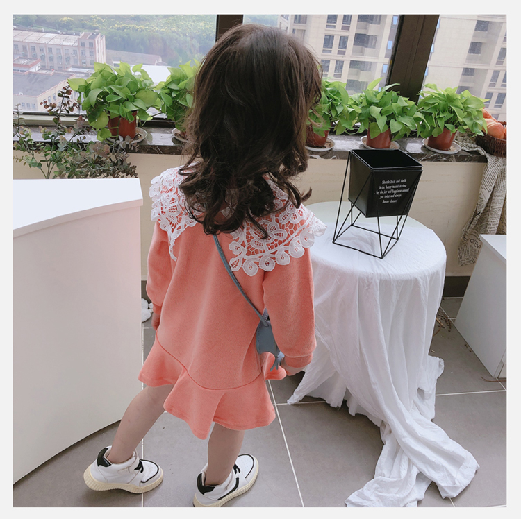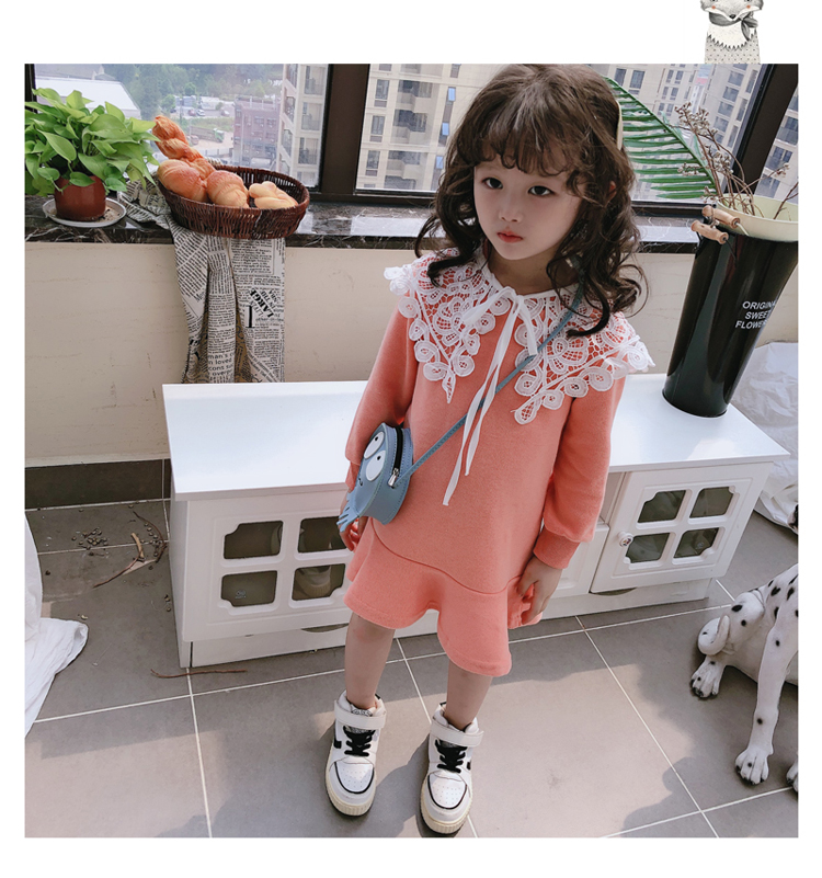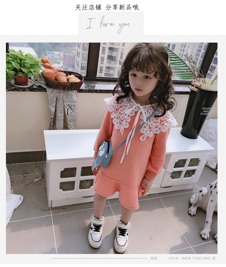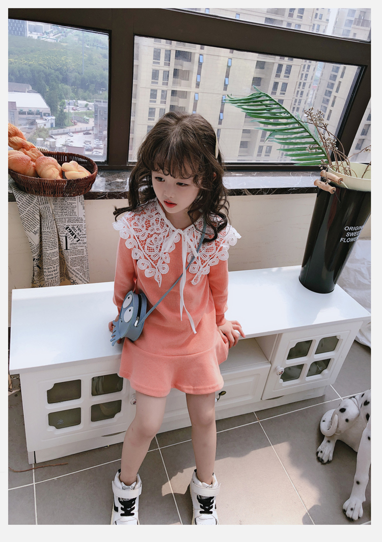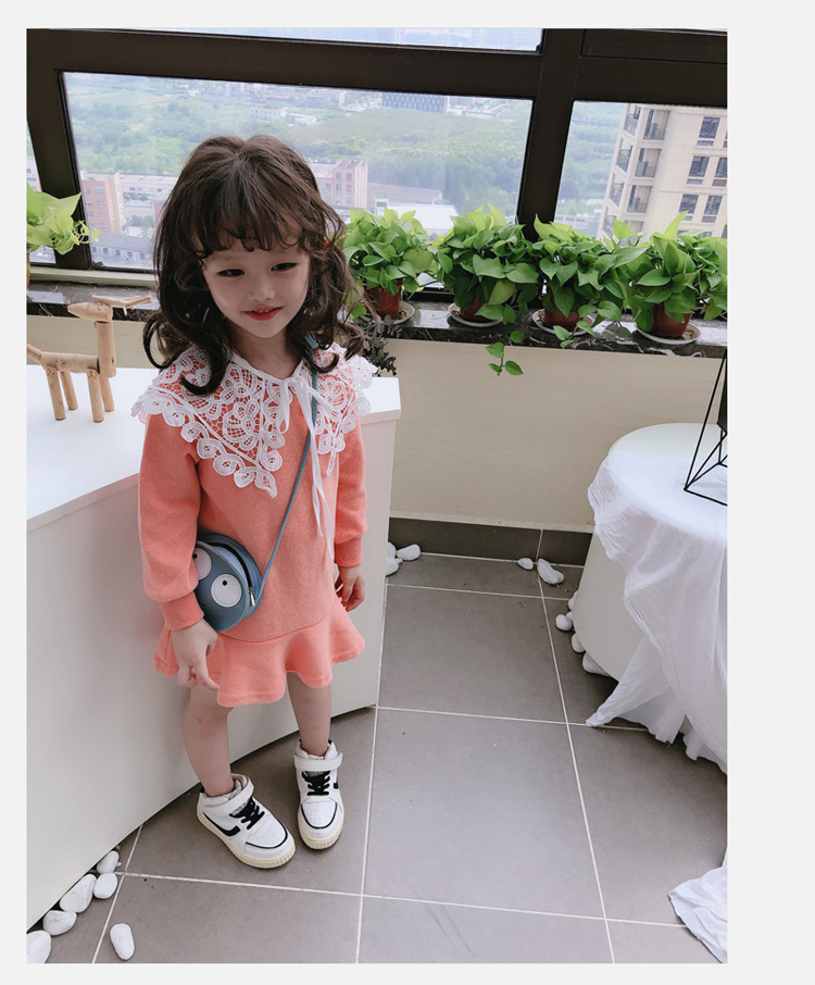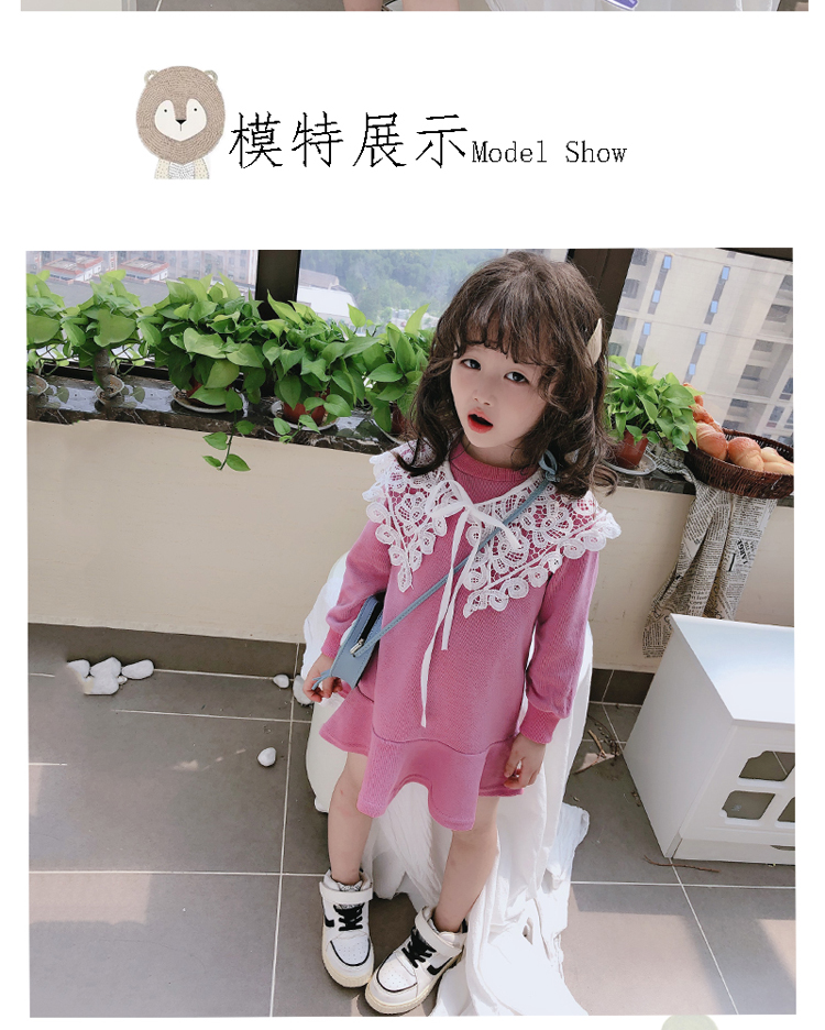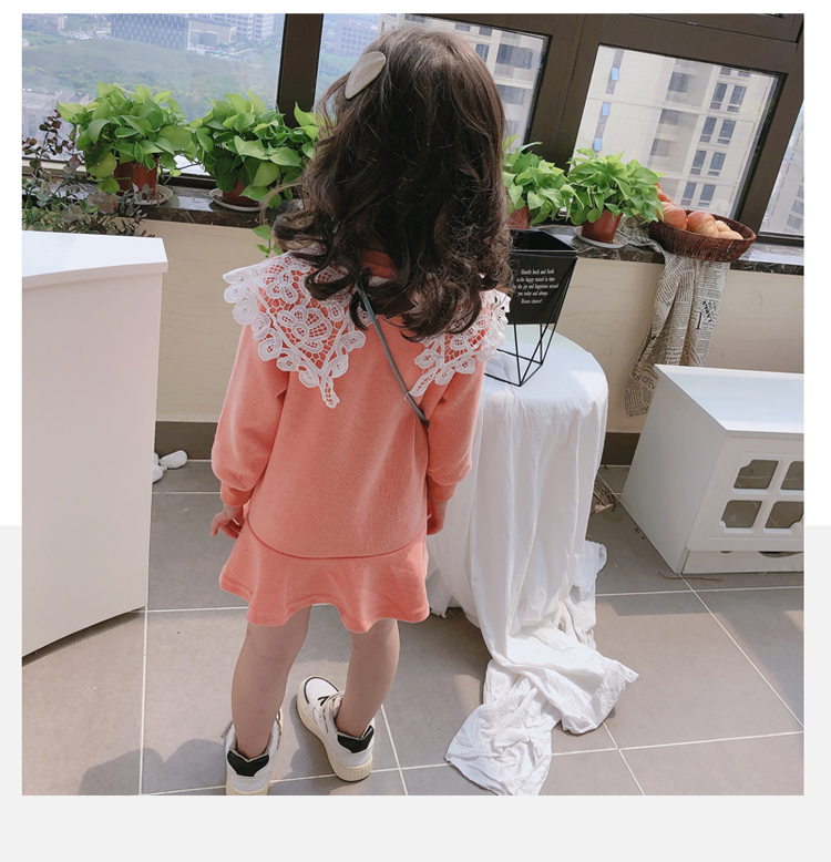 2019春秋季新款 女童修身連衣裙 中小童可愛甜美鏤空大翻領休閑裙1入