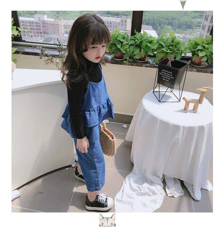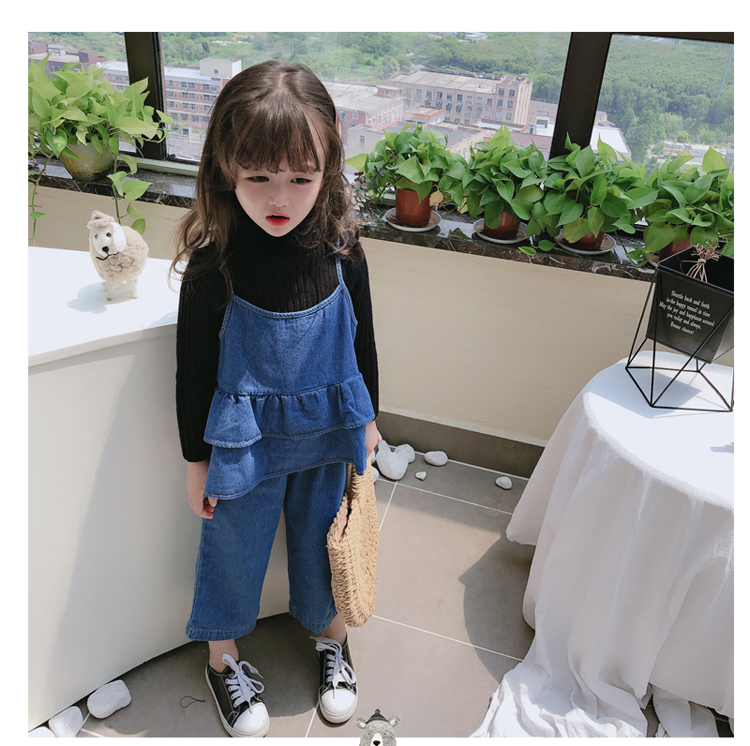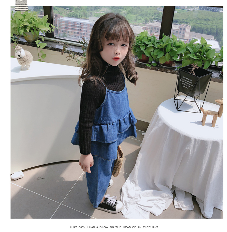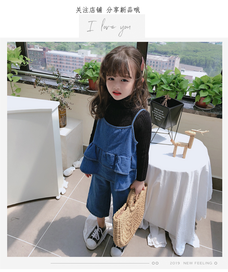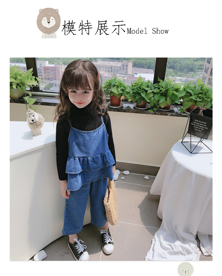 2019春秋新款 女童洋氣舒適套裝 兒童牛仔吊帶上衣+牛仔褲兩件套1入