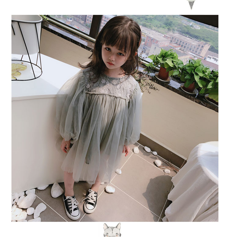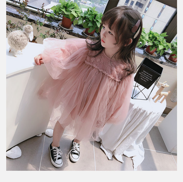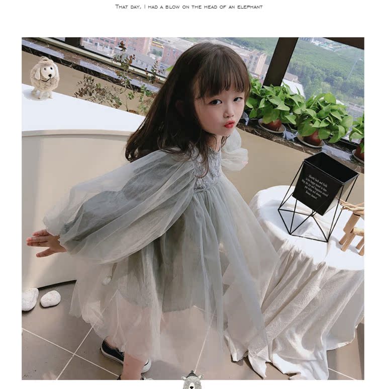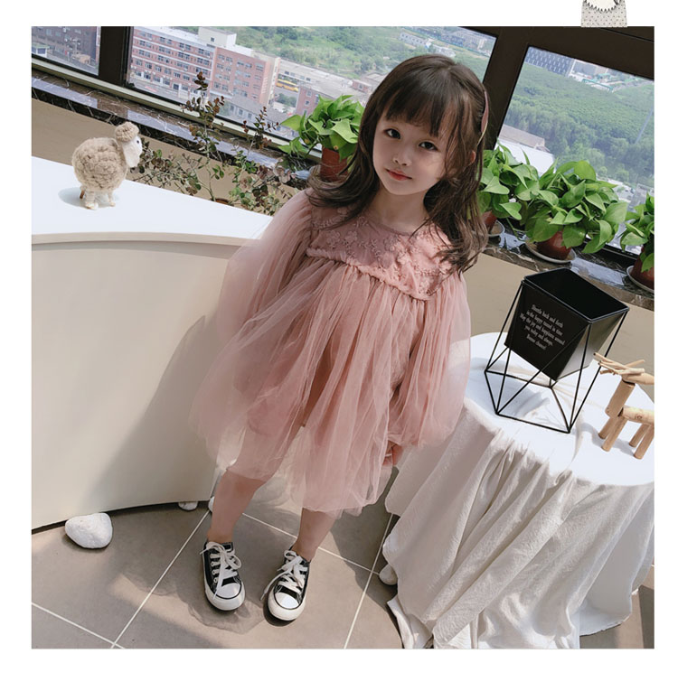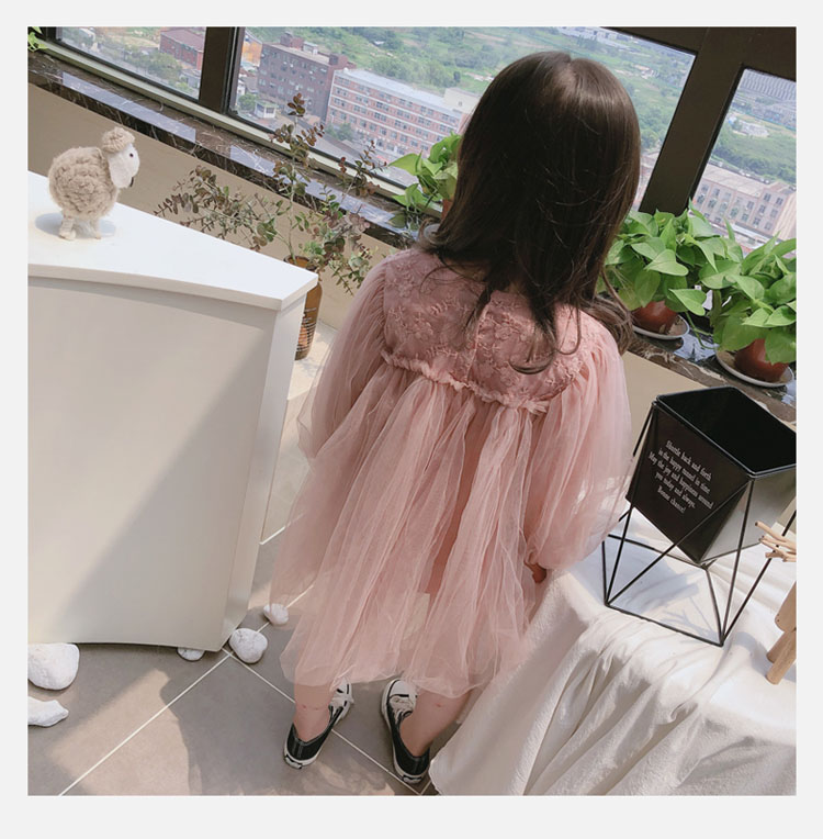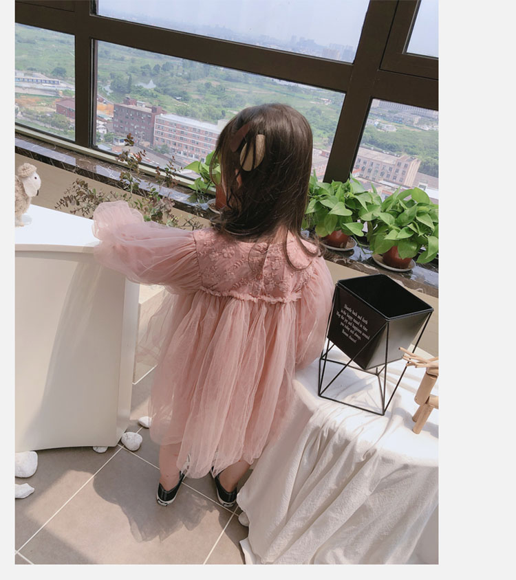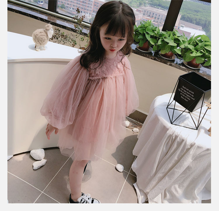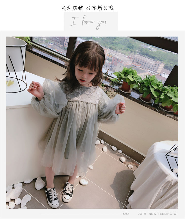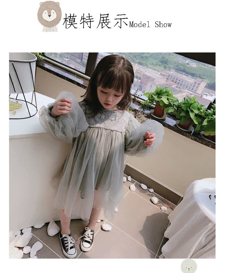 2019春秋童裝 中小童小清新兒童長袖連衣裙 女童泡泡袖蕾絲網紗裙1入