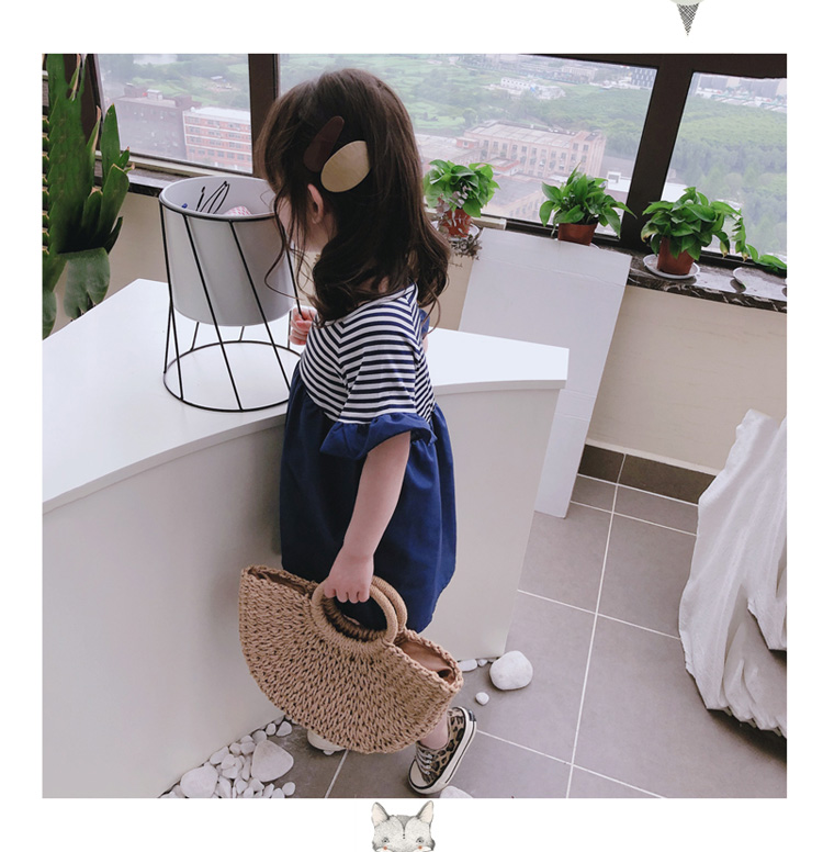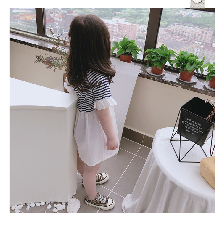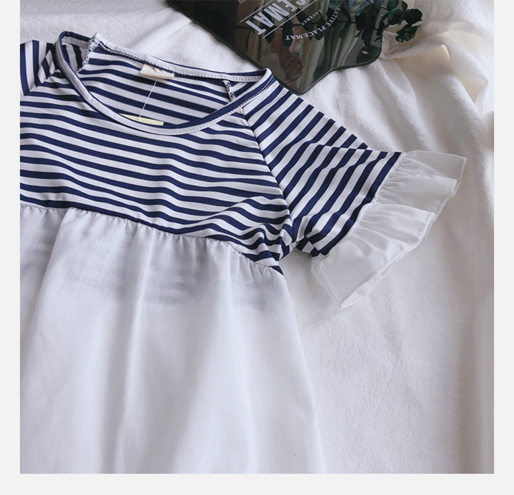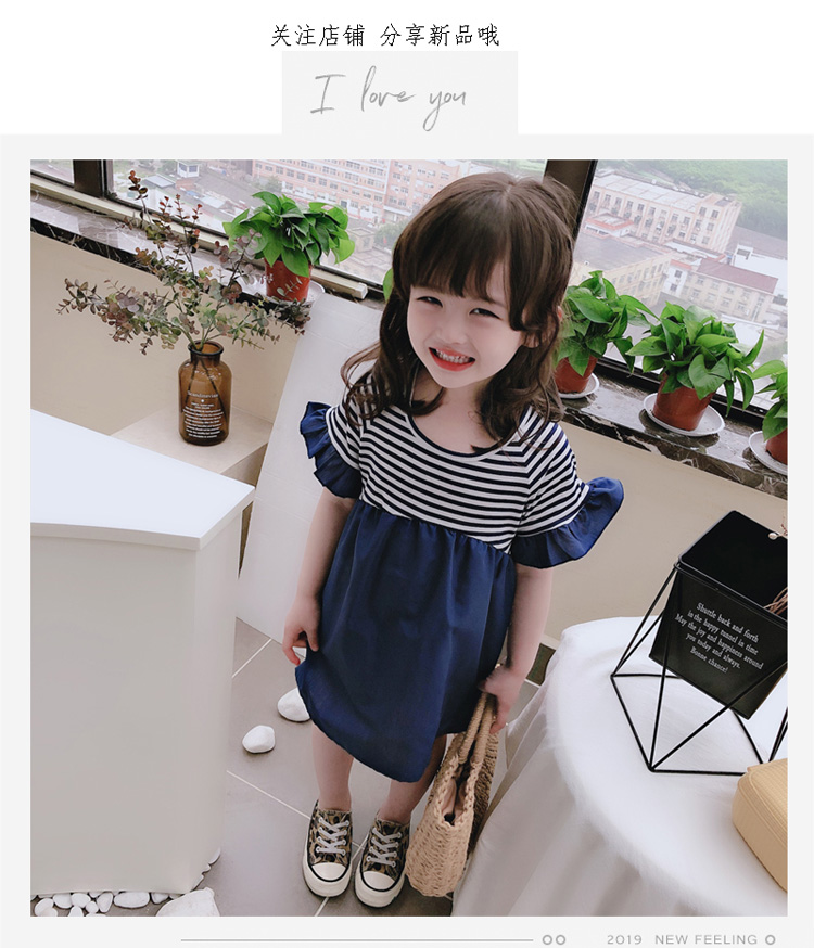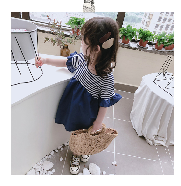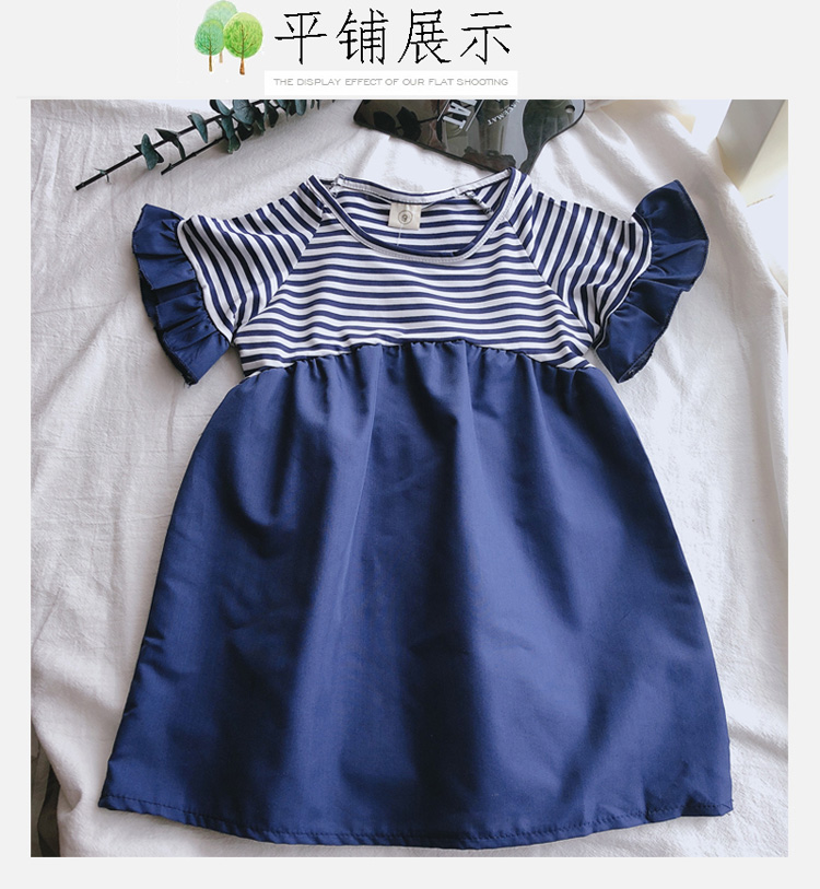 2019夏季新款 中小童學院風條紋高腰短袖連衣裙 女童娃娃衫連衣裙1入
