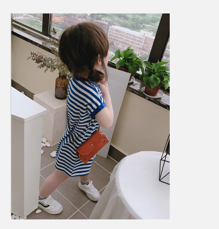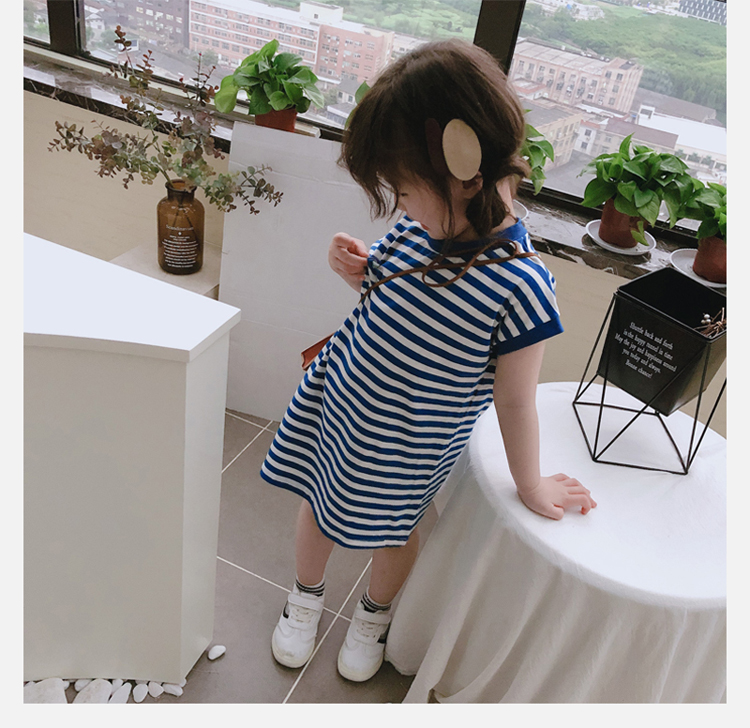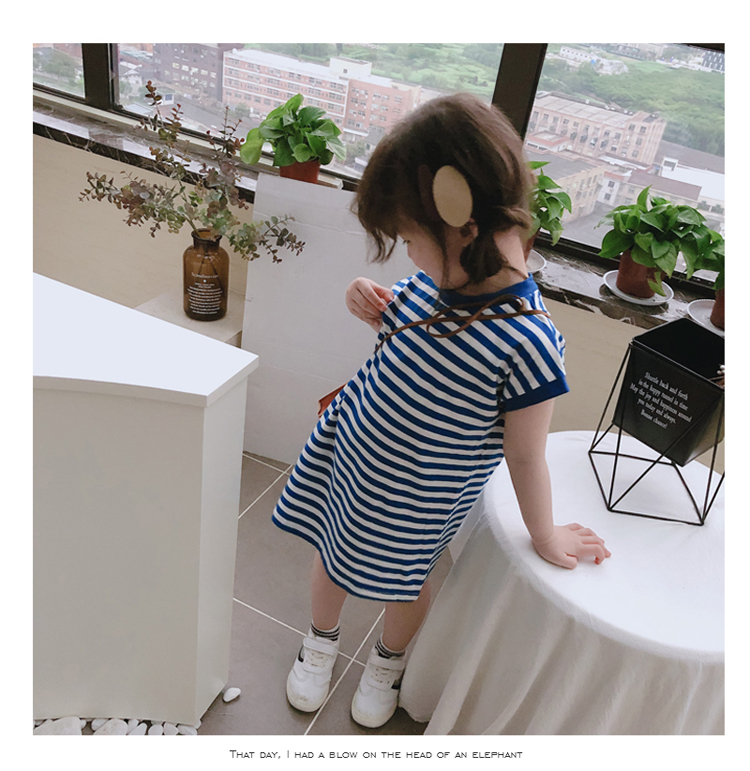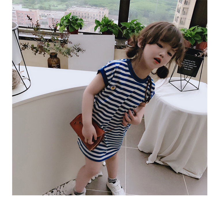 2019夏季新款 兒童休閑中長款連衣裙 女童海軍風藍條紋無袖T恤裙1入