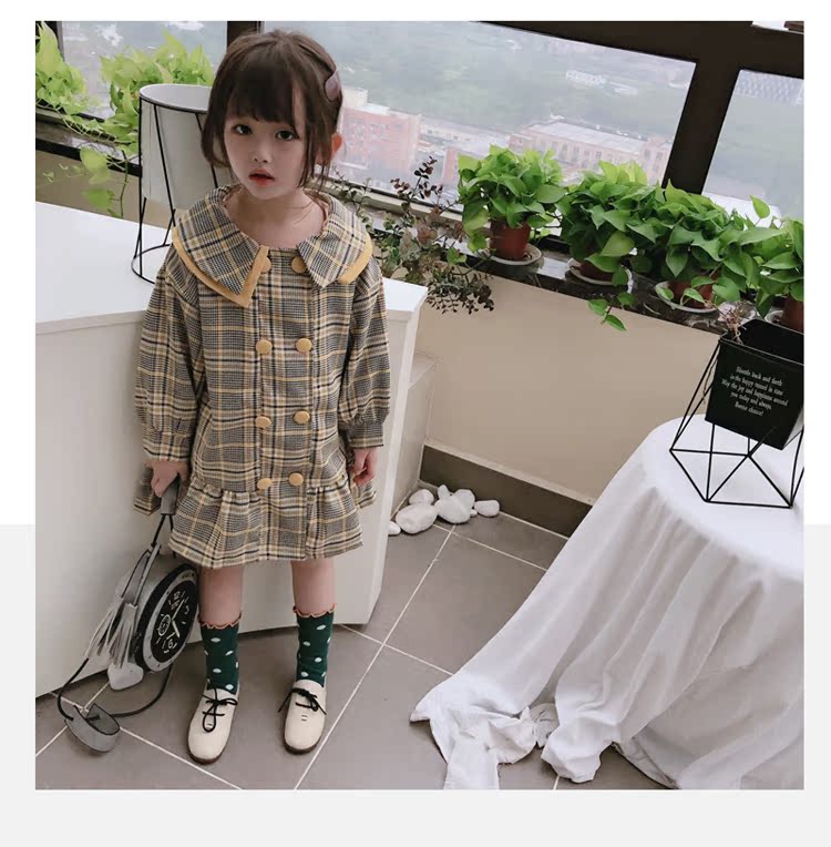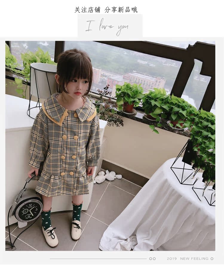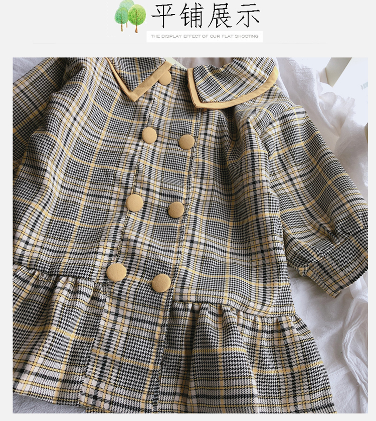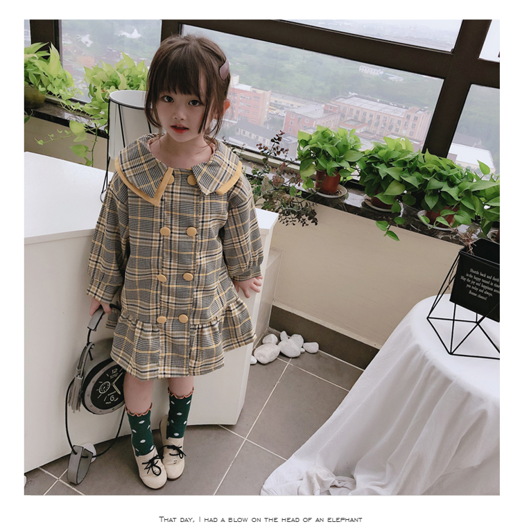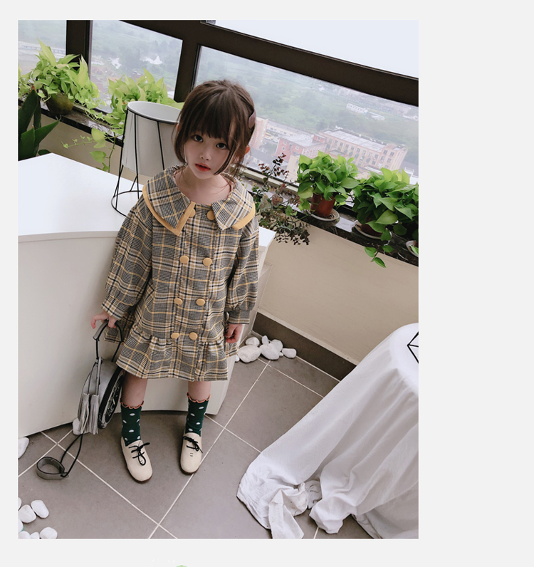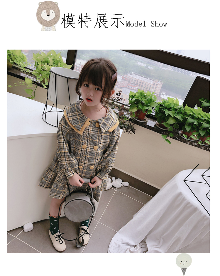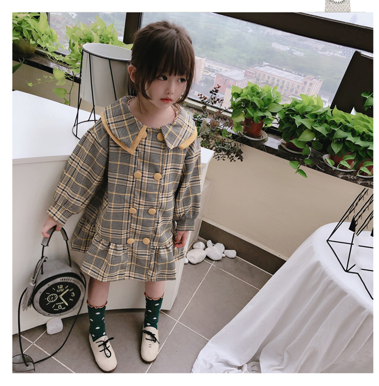 2019秋季新款 女童雙排扣格子長袖連衣裙 兒童田園風大翻領童裙1入