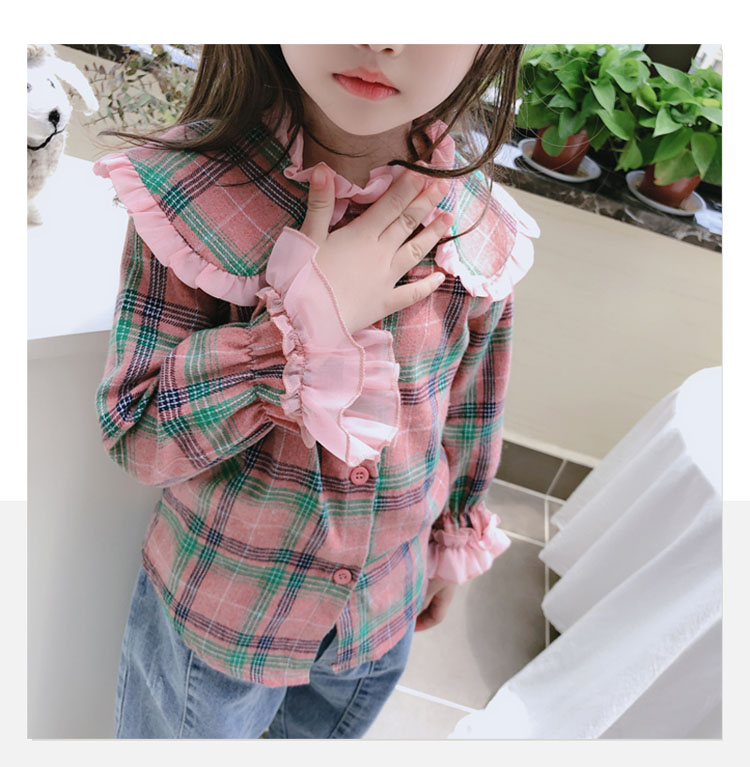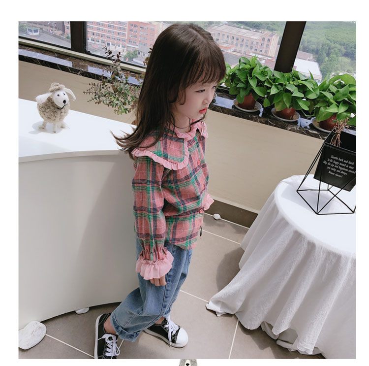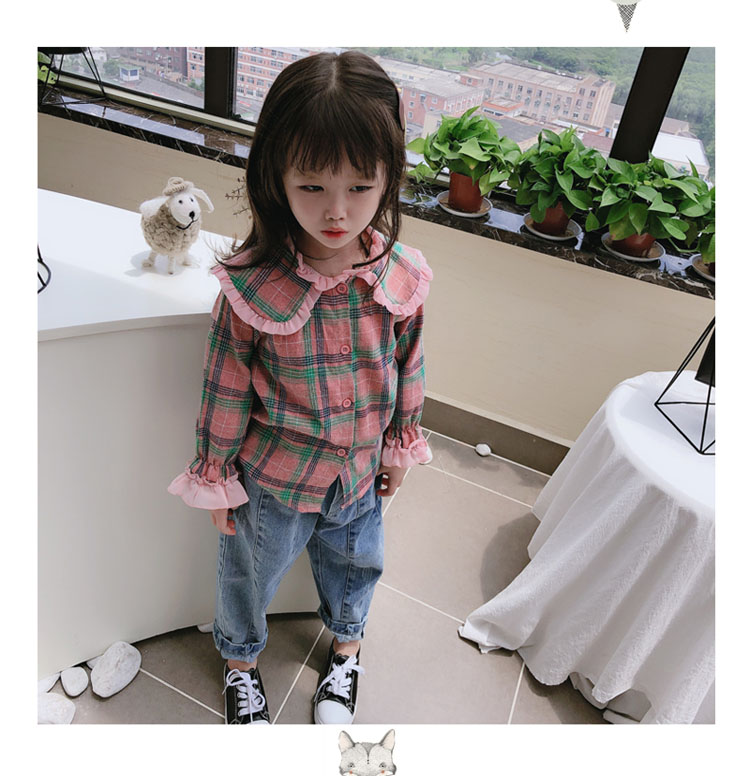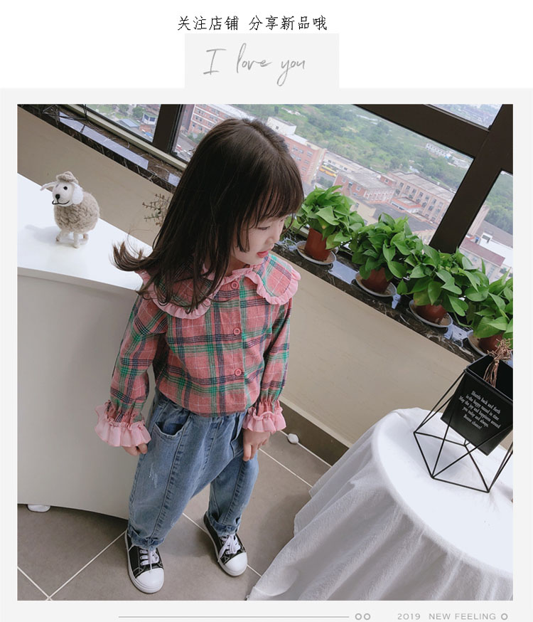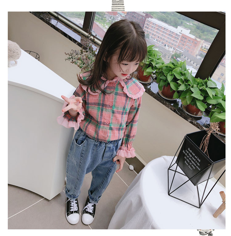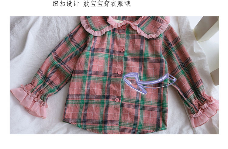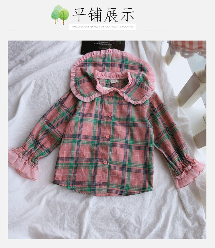 2019秋季新款 女童寶寶喇叭袖上衣 中小童小清新翻領舒適格子襯衫1入