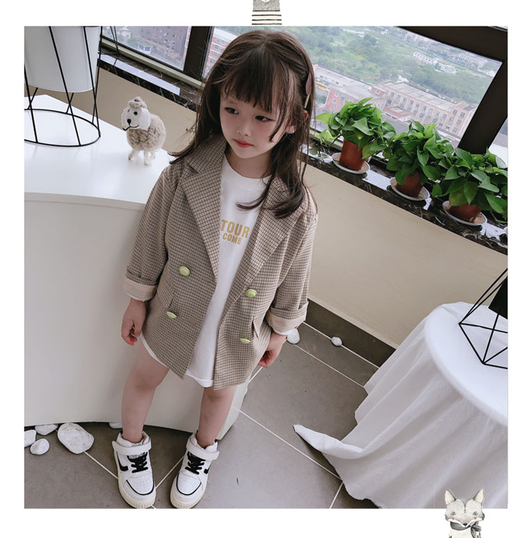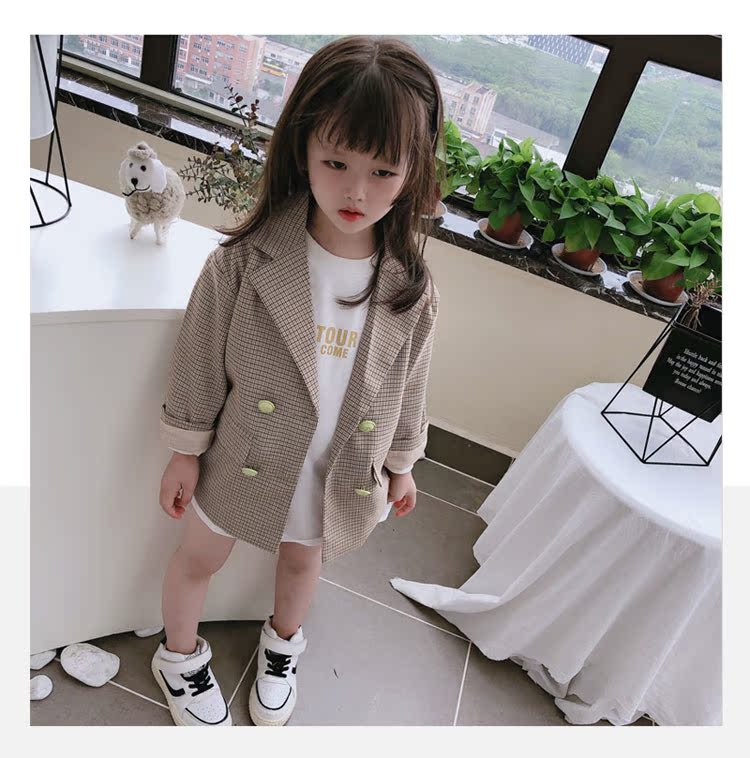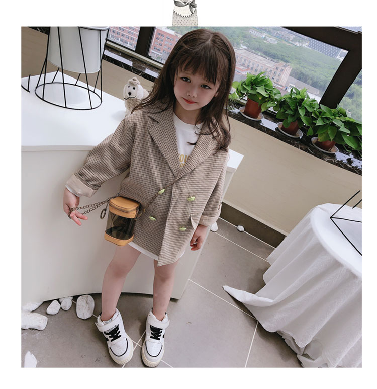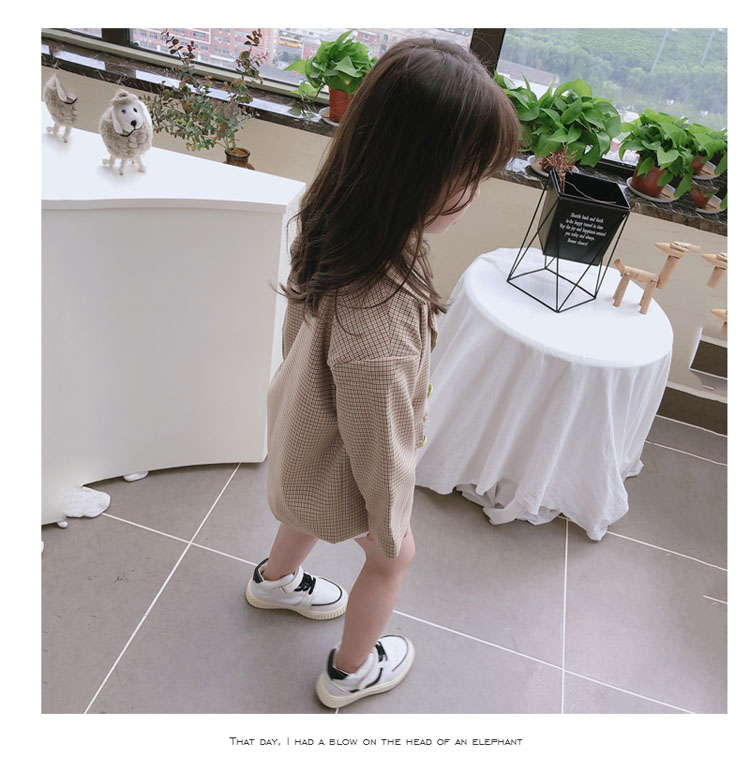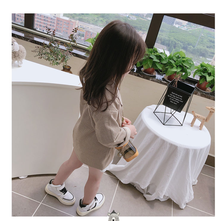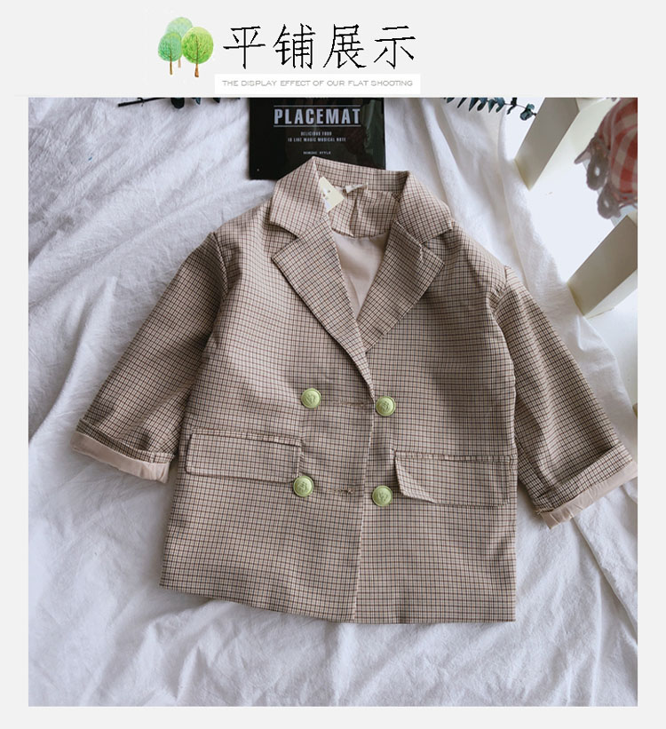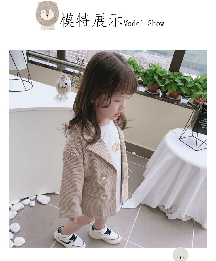 2019秋季新款 兒童雙排扣西裝上衣 女童寶寶細格子翻領中長款外套1入