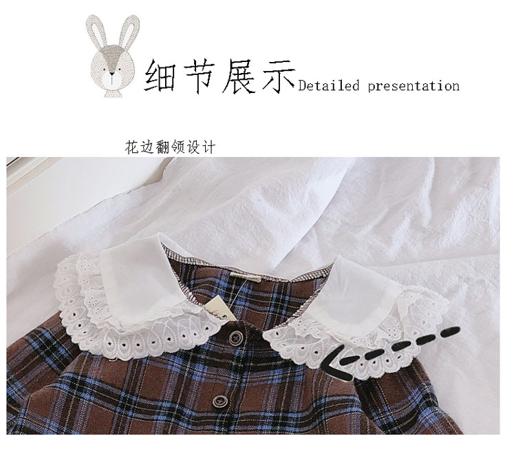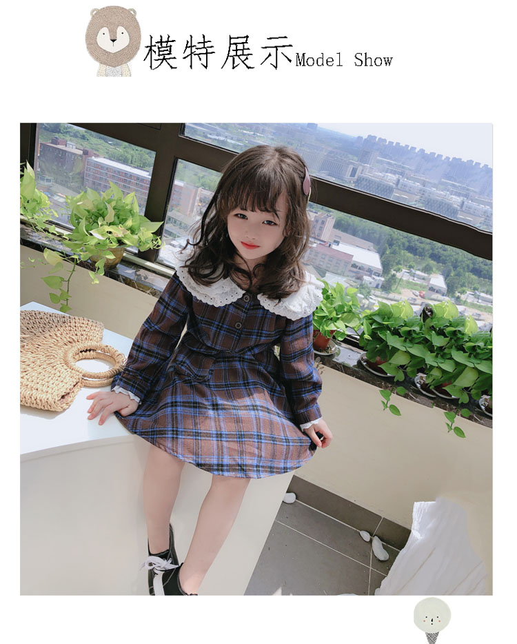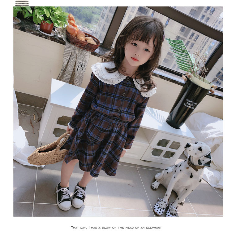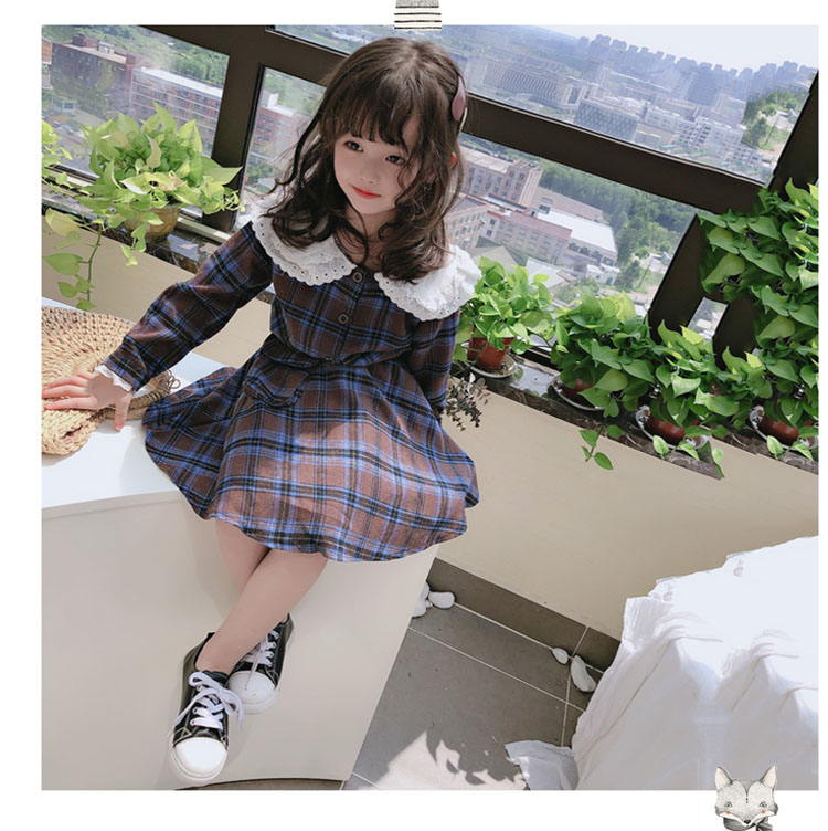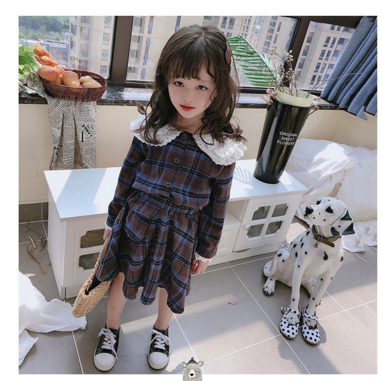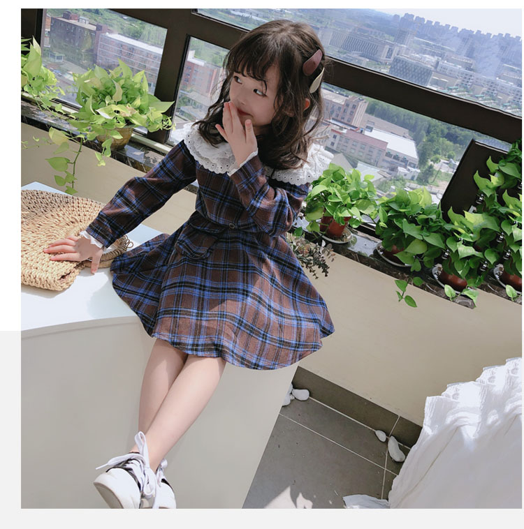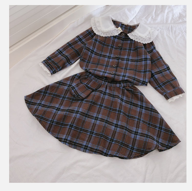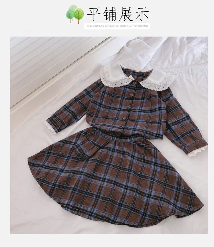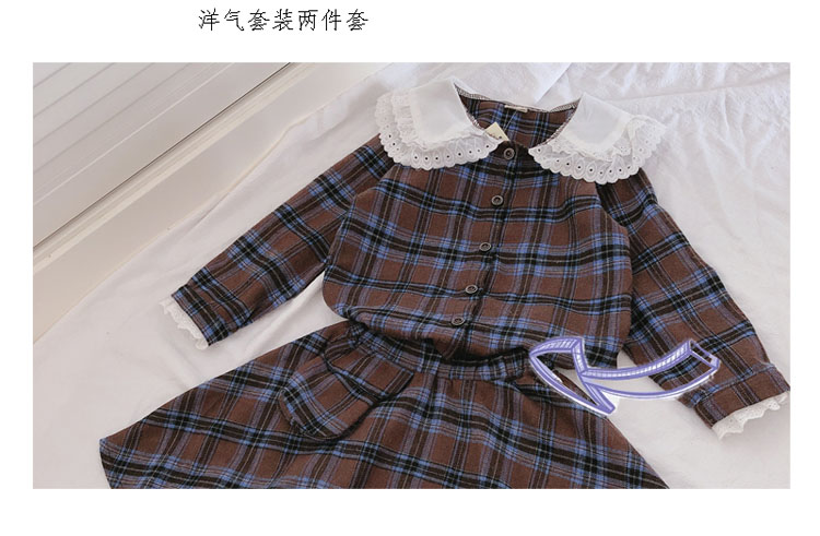 2019春秋新款 女童甜美格子套裝 兒童花邊翻領上衣+半身裙兩件套1入
