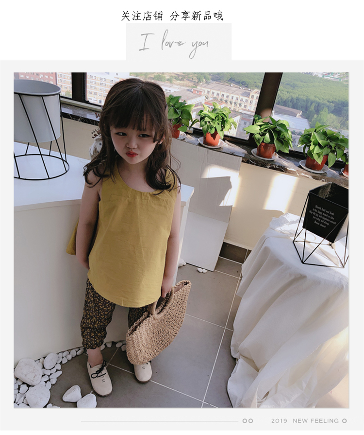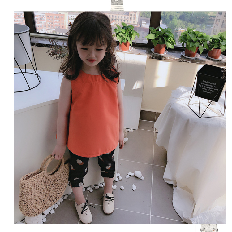 2019夏季新款 女童寬松純色吊帶上衣+印花燈籠褲兩件套 兒童套裝1入