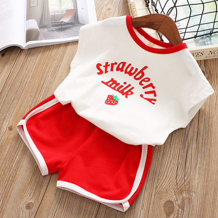 2019女童夏季新款草莓印花背心上衣+中小童舒適短褲兒童套裝1入