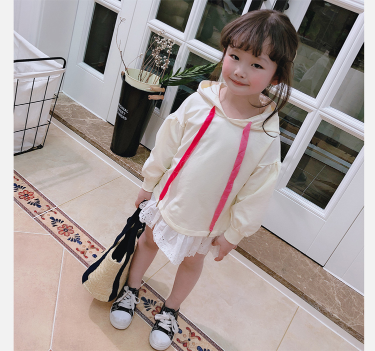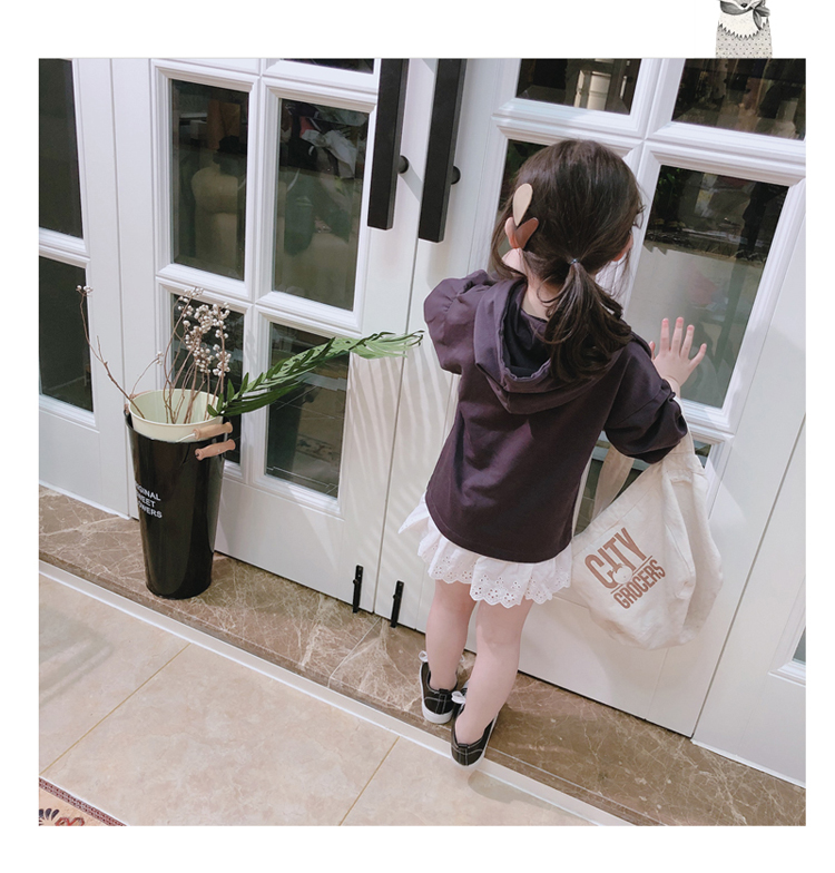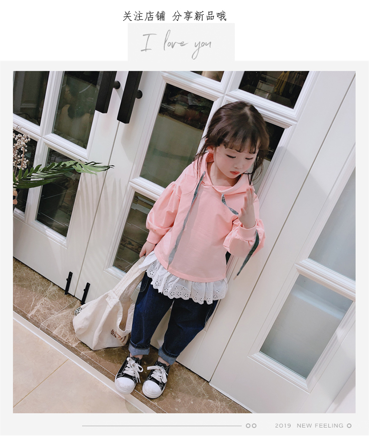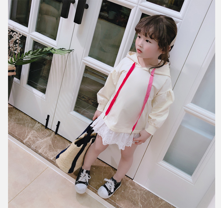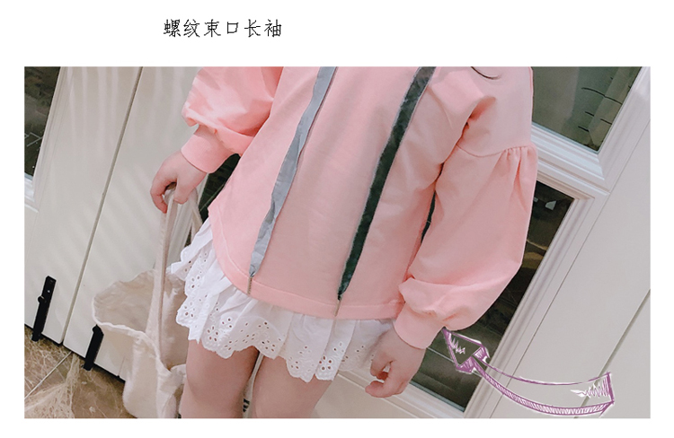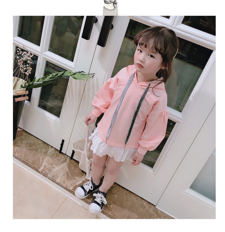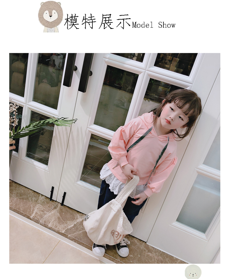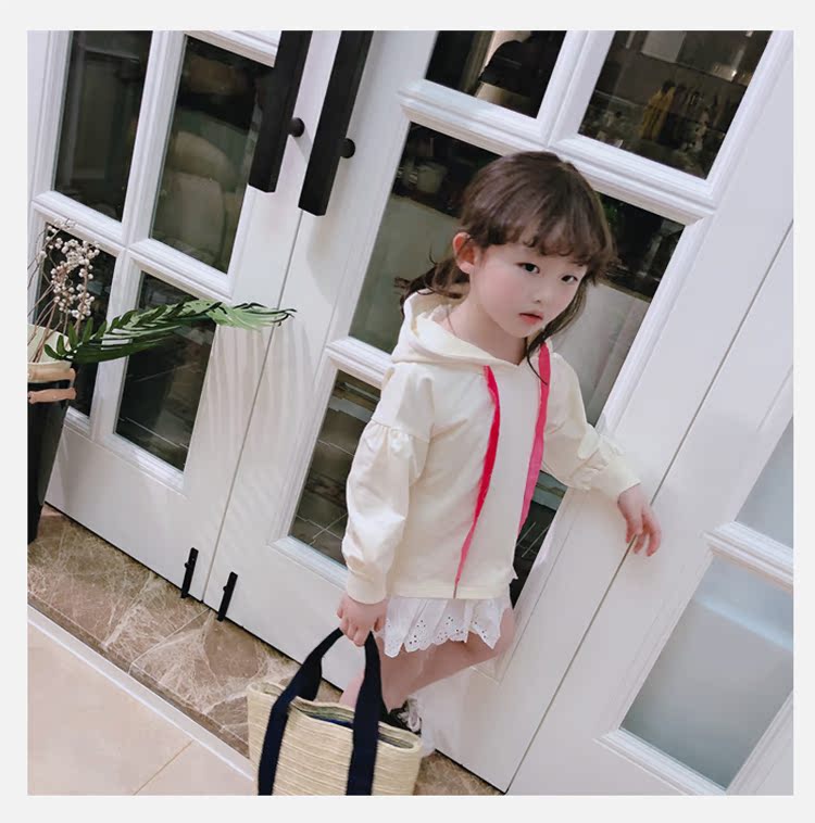 2019童裝春季新款女寶寶 兒童寬松版泡泡袖 女童拼色抽褶連帽衛衣1入