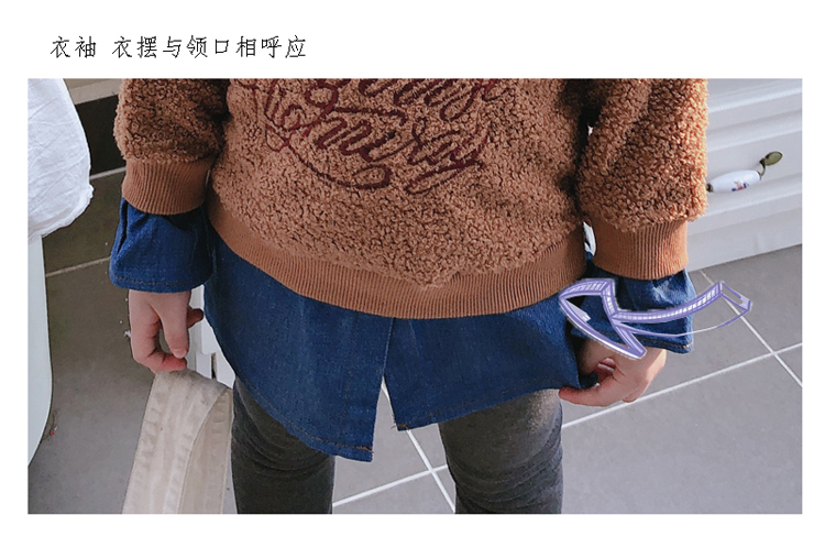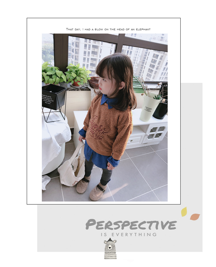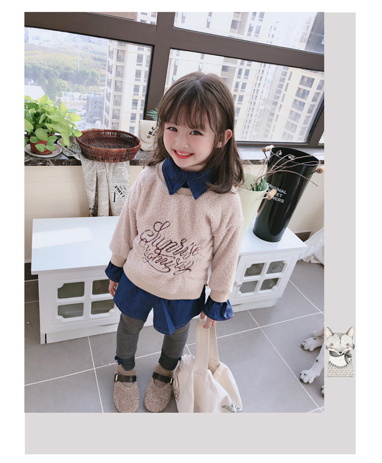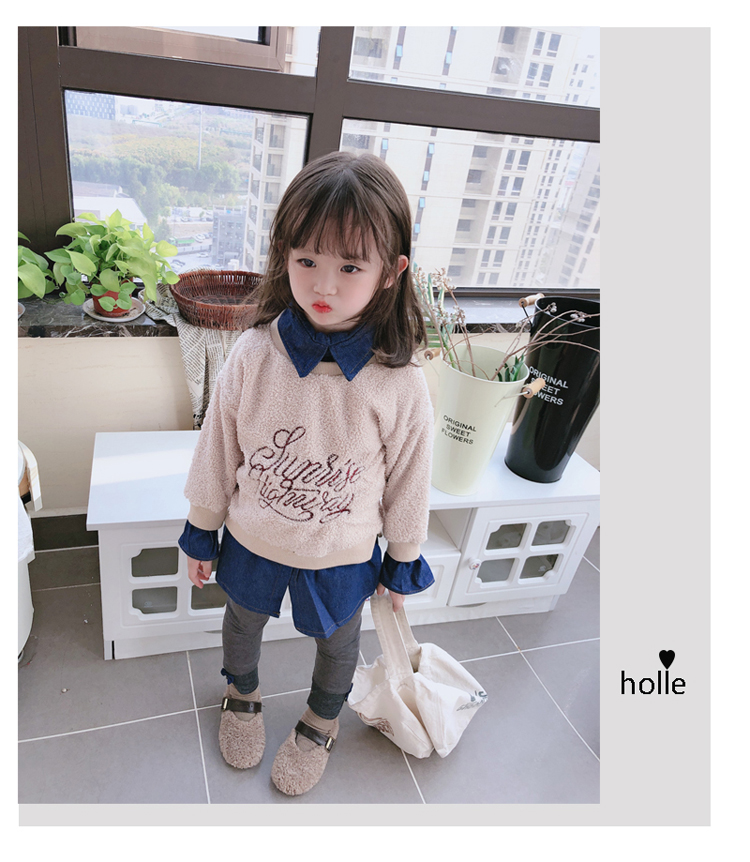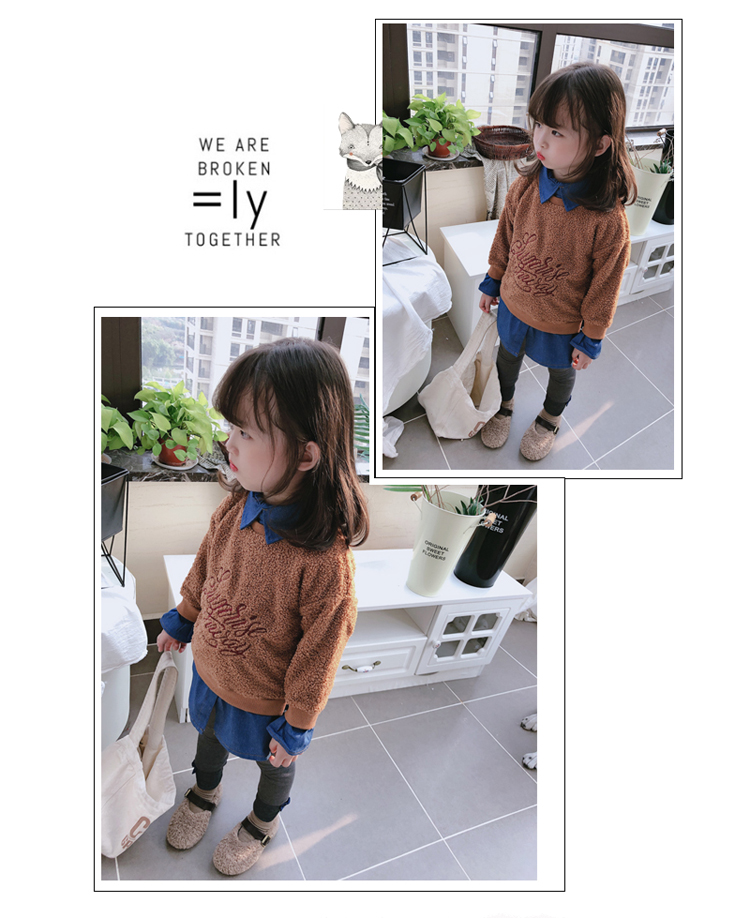 2019中小童秋冬季新款百搭簡約翻領上衣 女童毛絨拼接假兩件衛衣1入