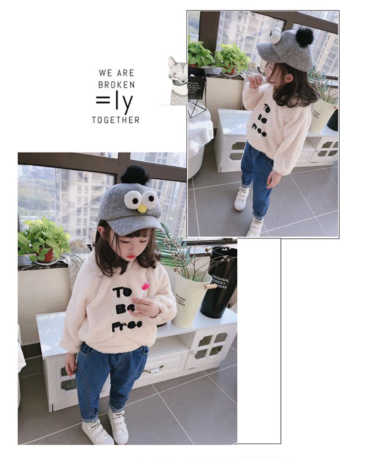 2019冬季新款 女童立體貼布字母連帽毛絨衛衣 中小童舒適套頭上衣1入