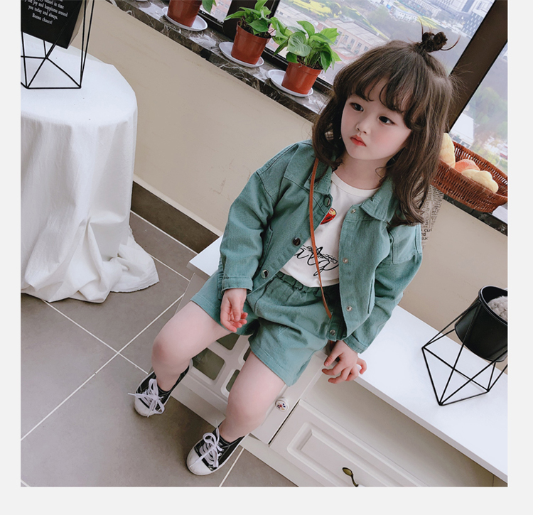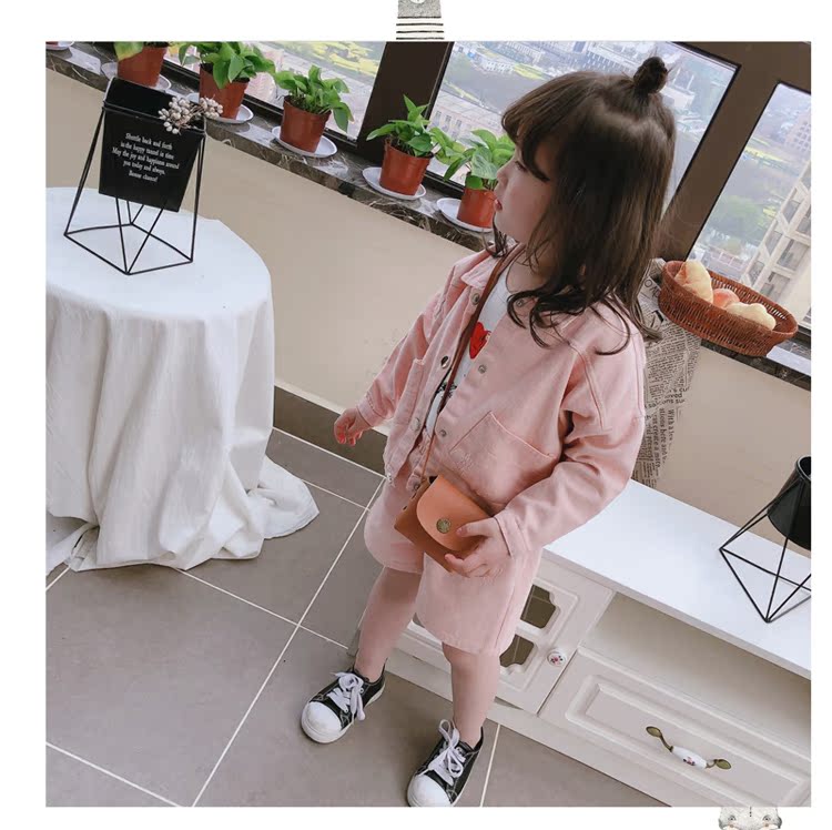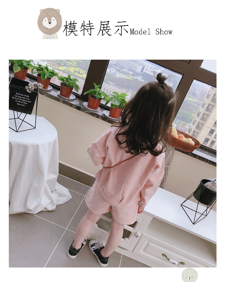 2019夏季新款 中小童翻領長袖兒童外套+短褲 女童帥氣寶寶套裝 潮1入