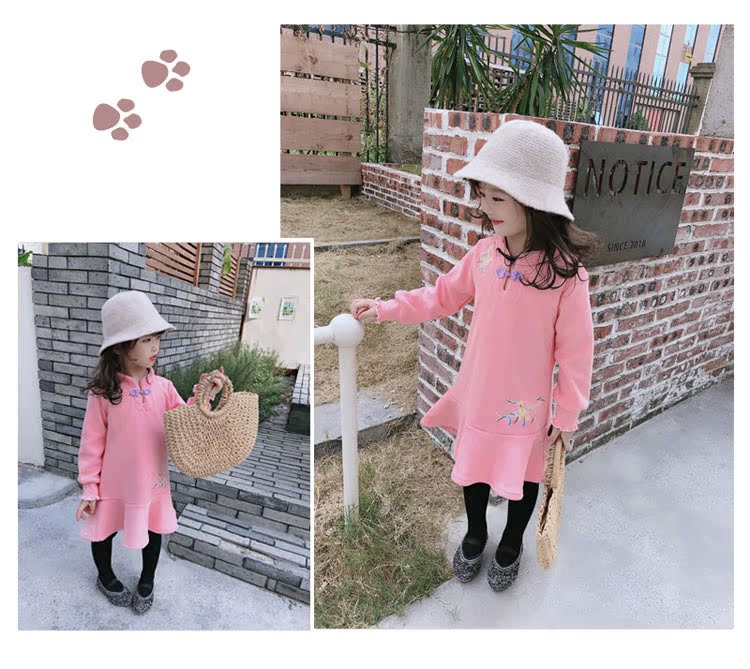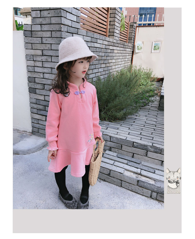 2019冬季新款 兒童復古刺繡印花連衣裙 女童修身中國風荷葉邊裙子1入