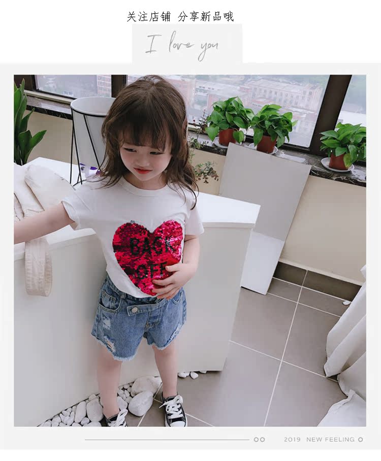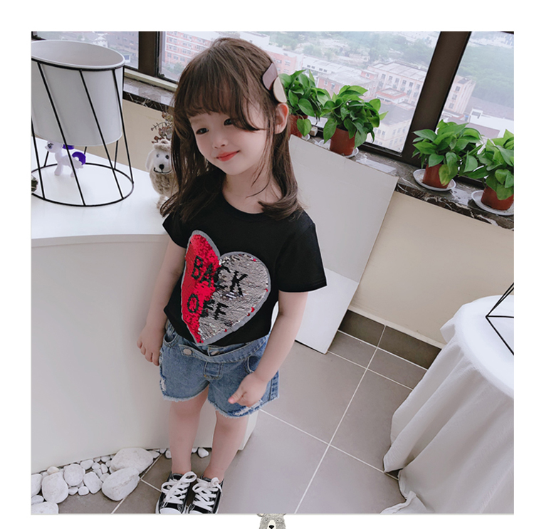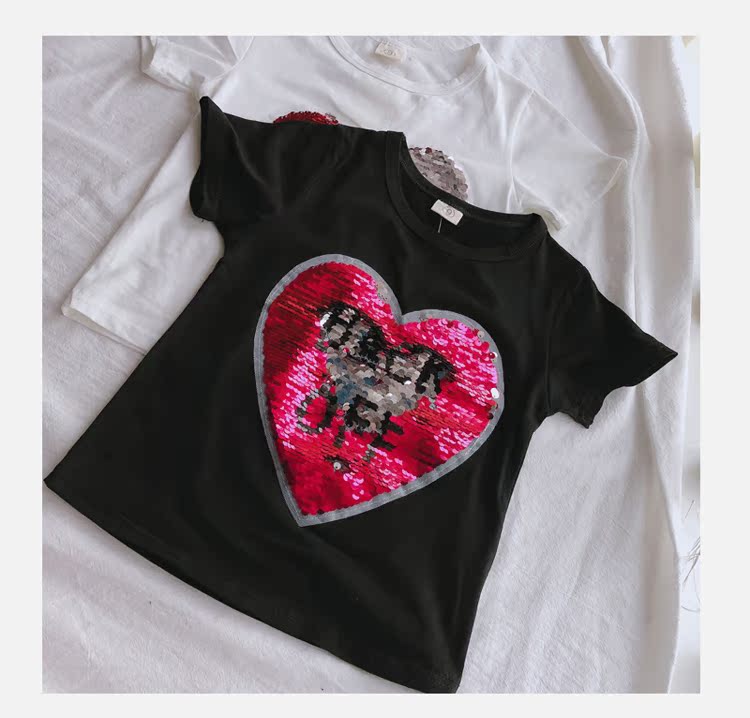 2019夏季母女裝寬松兒童短袖T恤 親子裝亮片愛心女童打底衫上衣潮1入