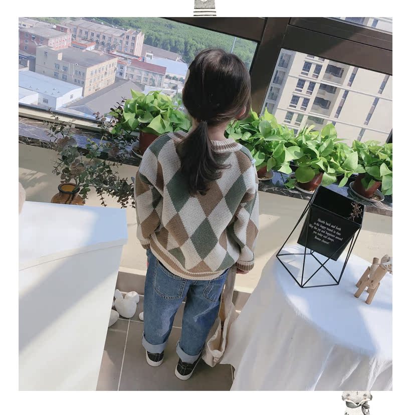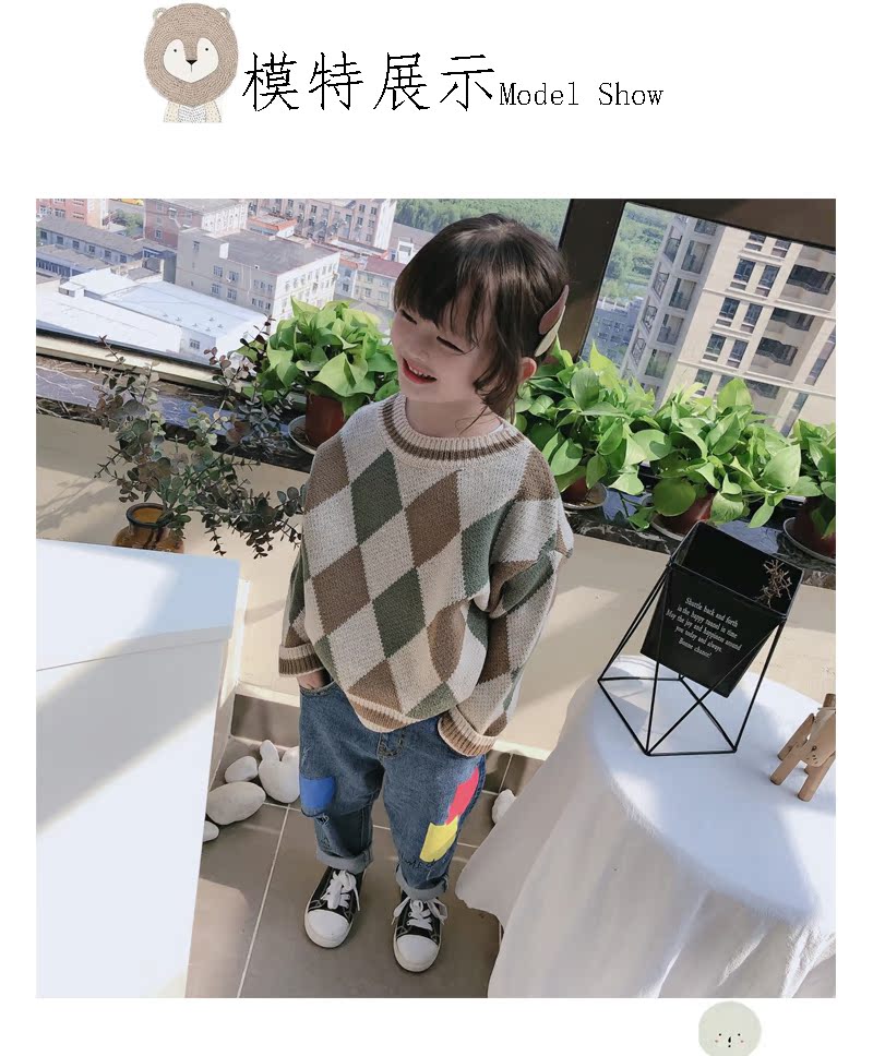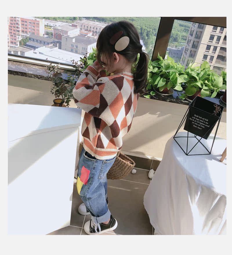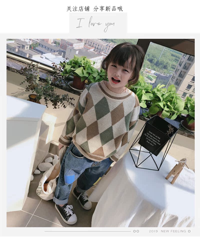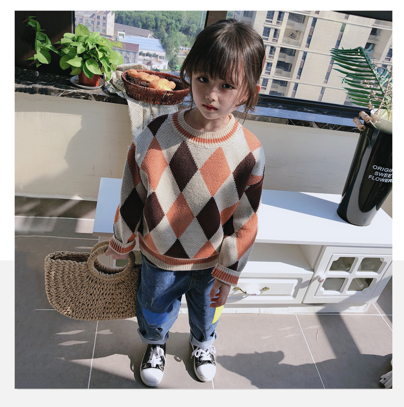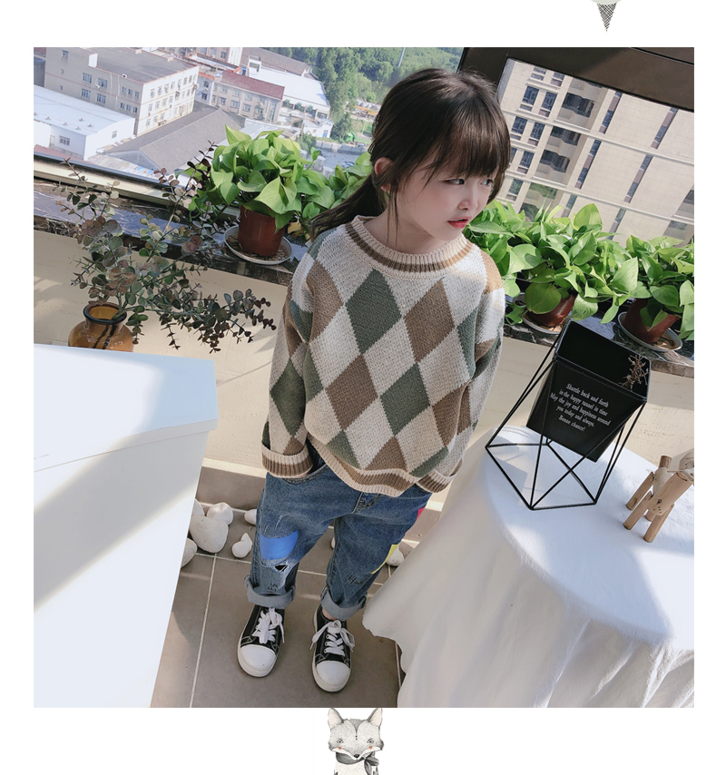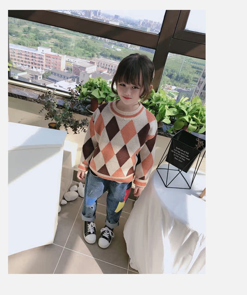 2019春秋新款 女童舒適菱形圖案針織衫 兒童個性洋氣圓領套頭毛衣1入