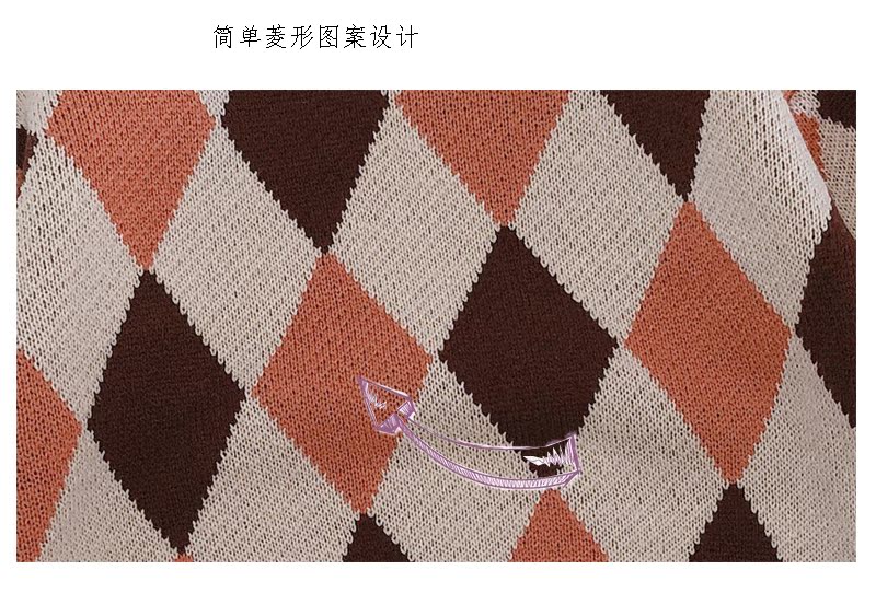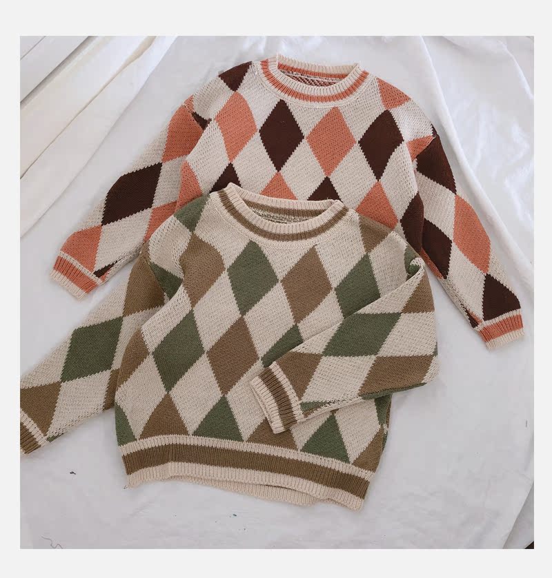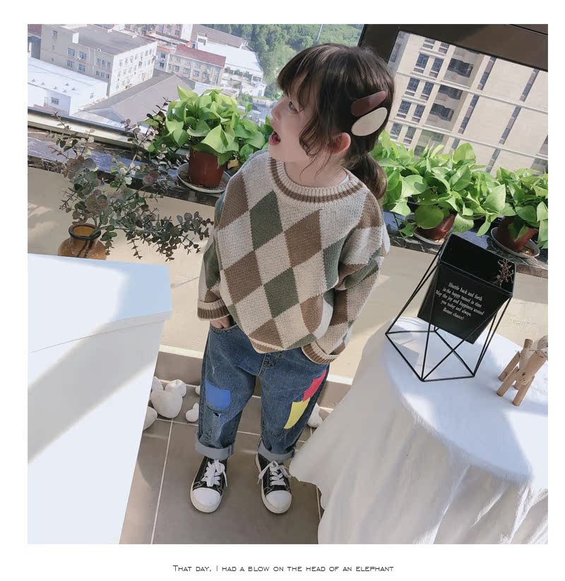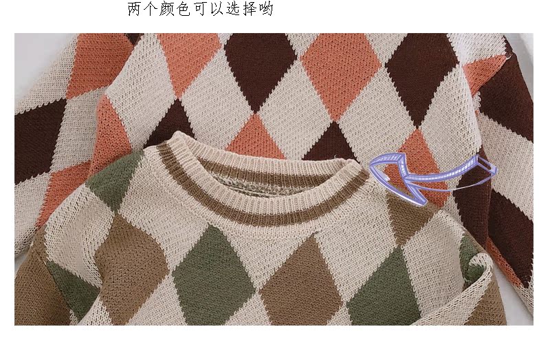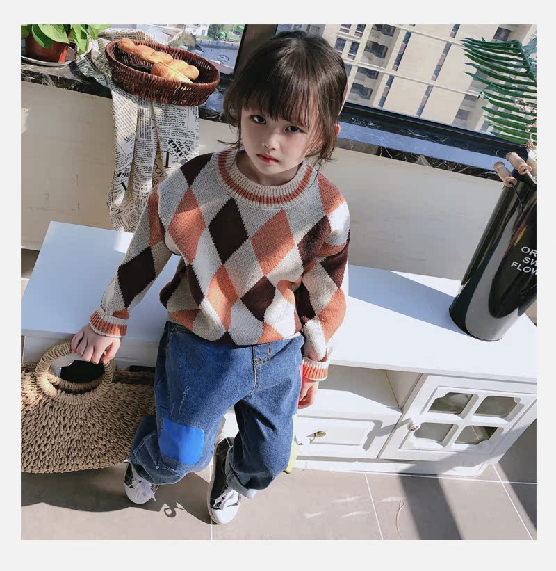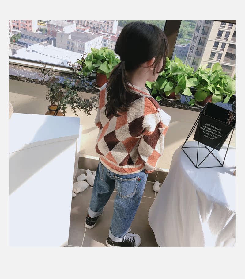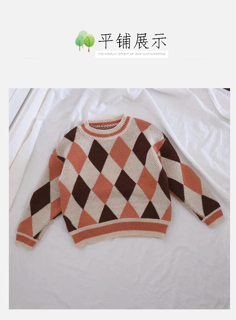 2019春秋新款 女童舒適菱形圖案針織衫 兒童個性洋氣圓領套頭毛衣1入