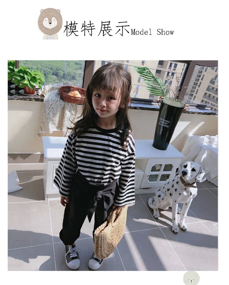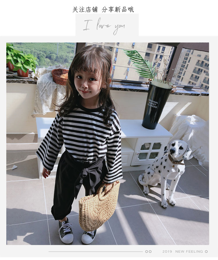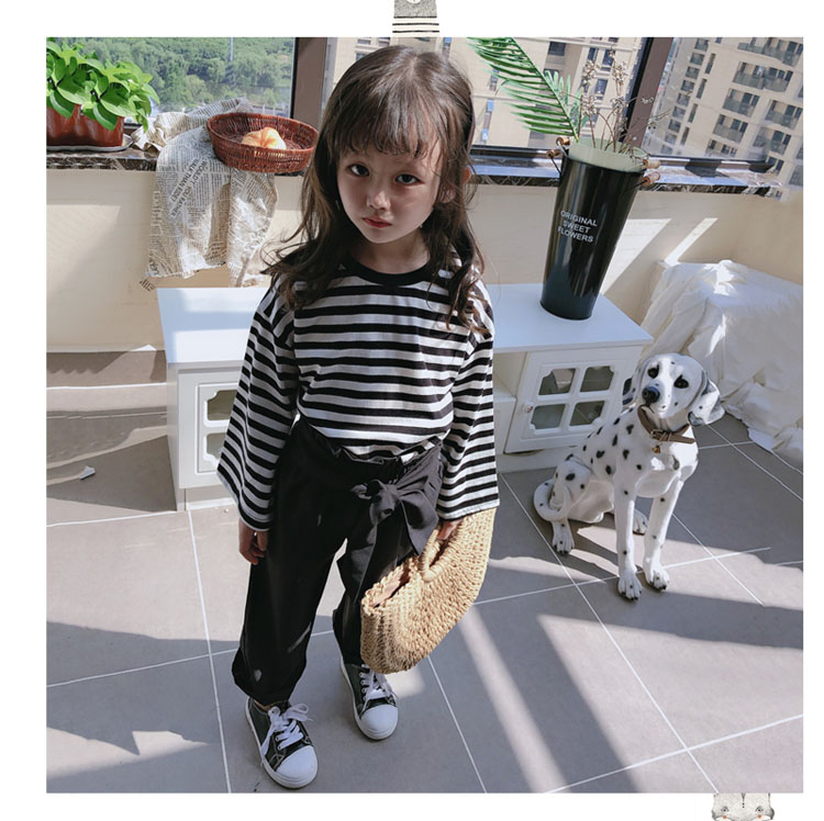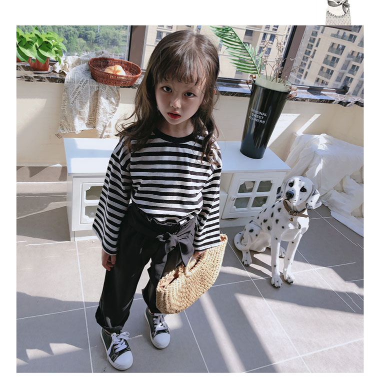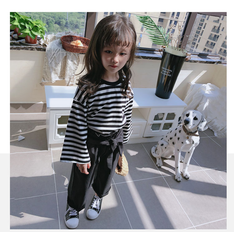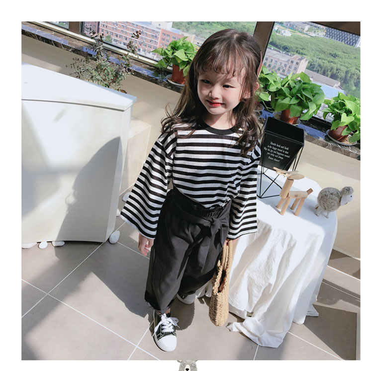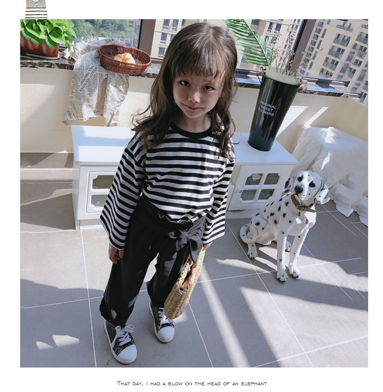 2019春秋新款 女童洋氣舒適套裝 兒童條紋上衣+系帶休閑褲兩件套1入