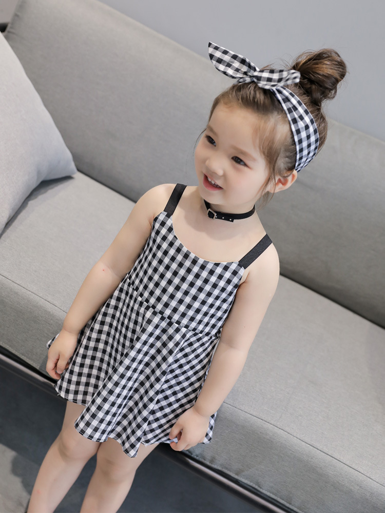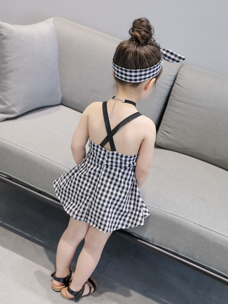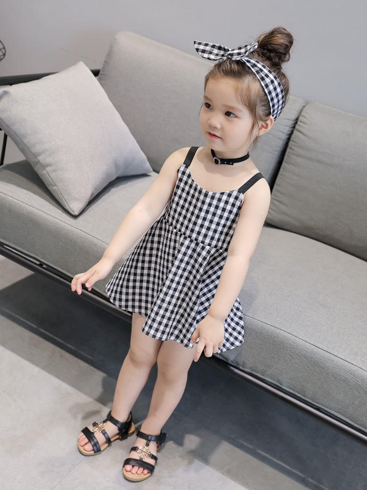 2019夏季新款女寶寶舒適寬松交叉連衣裙 女童個性休閑格子吊帶裙1入