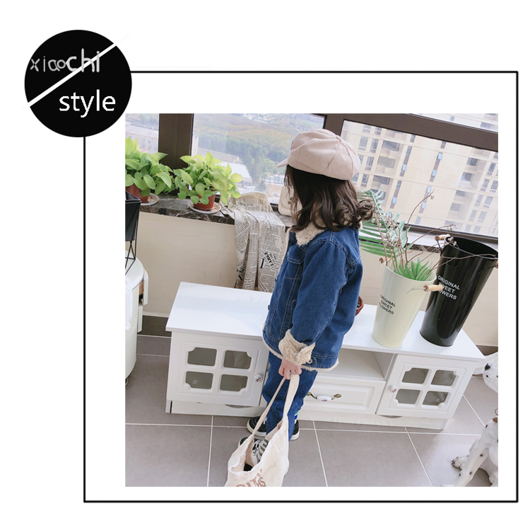 2019冬季新款 中小童毛絨翻領上衣 男女童加絨加厚保暖牛仔外套1入