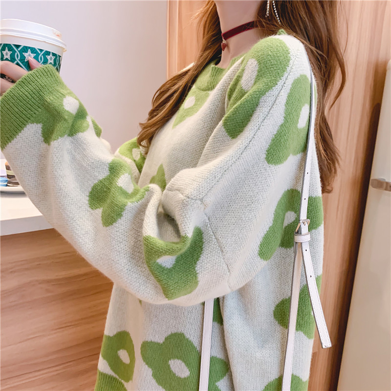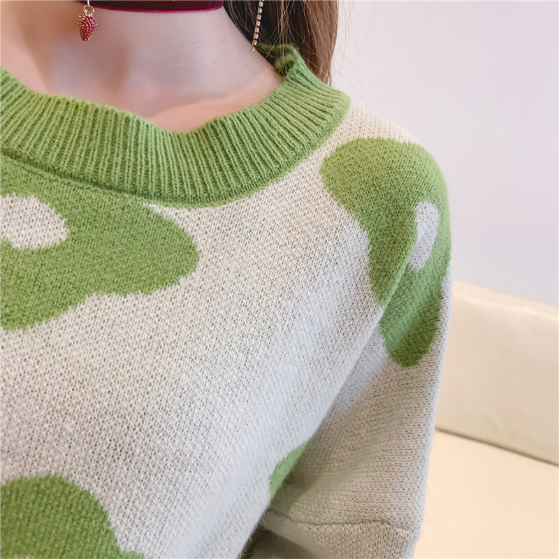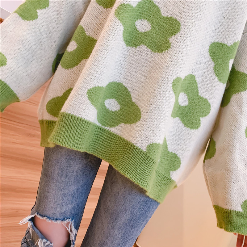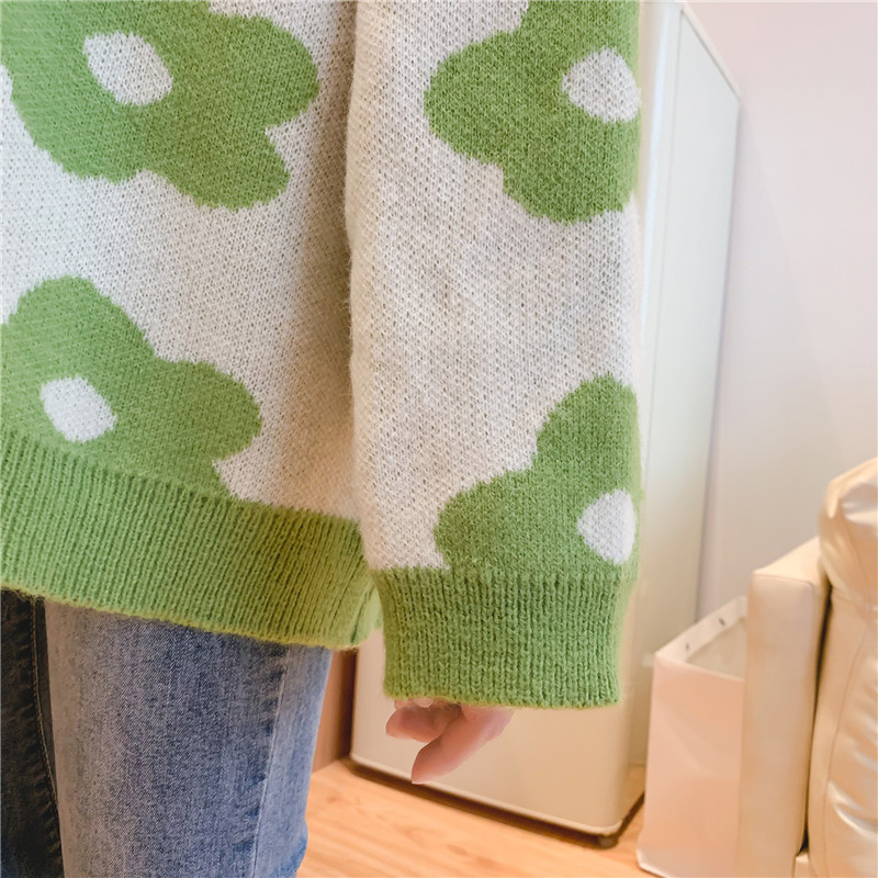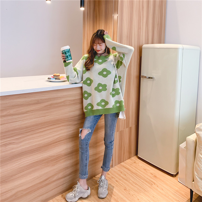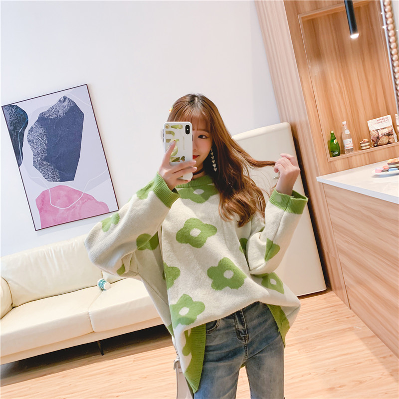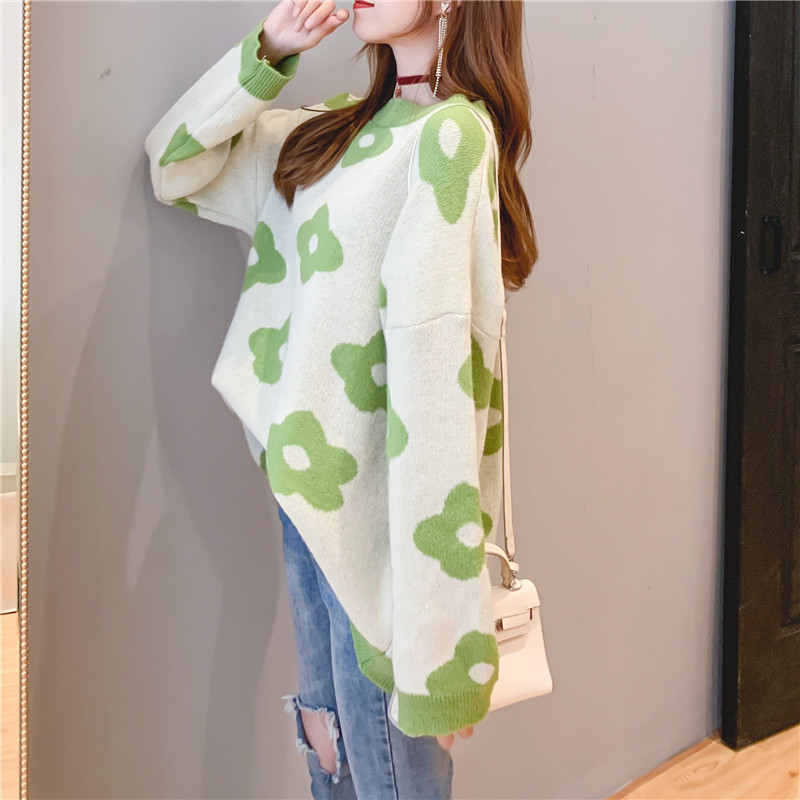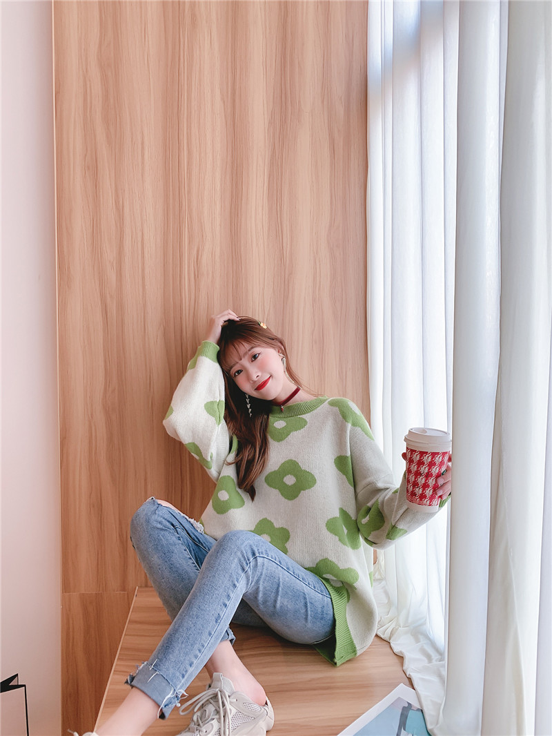 2019秋冬新款女慵懶寬松套頭牛油果綠花朵毛衣網紅針織打底衫上衣1入