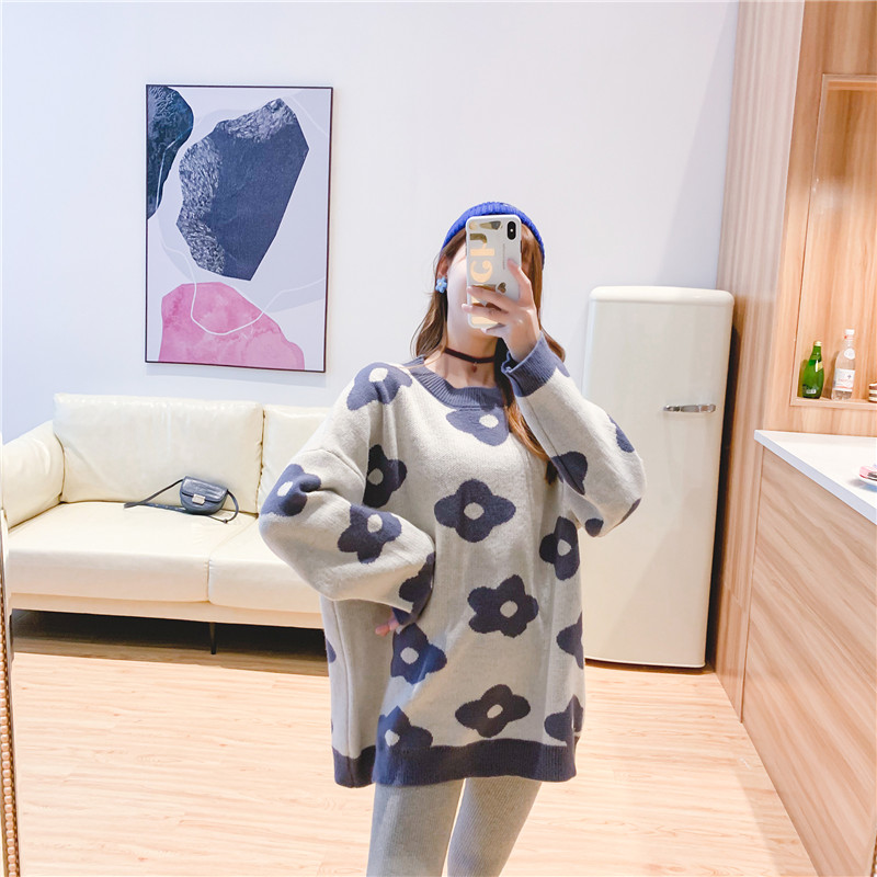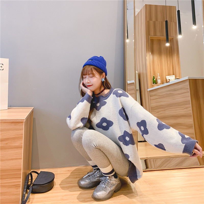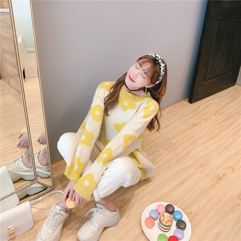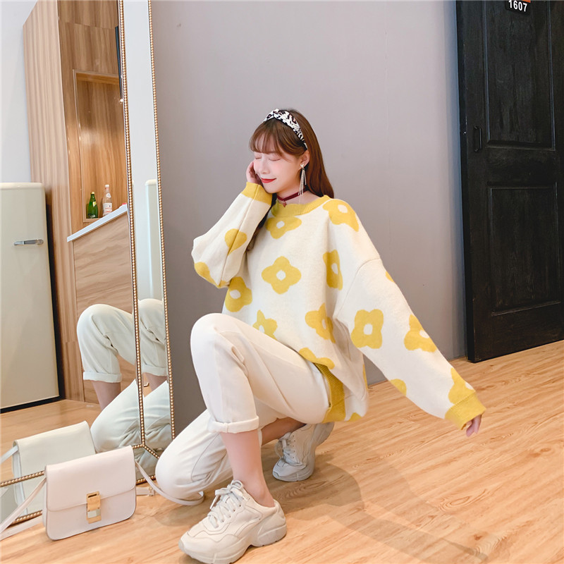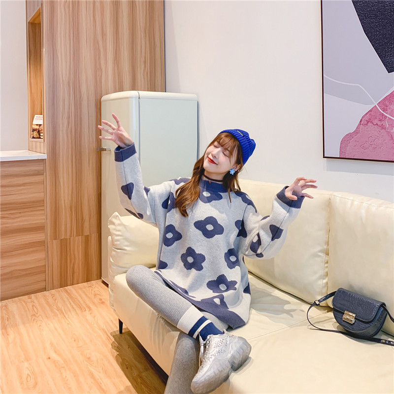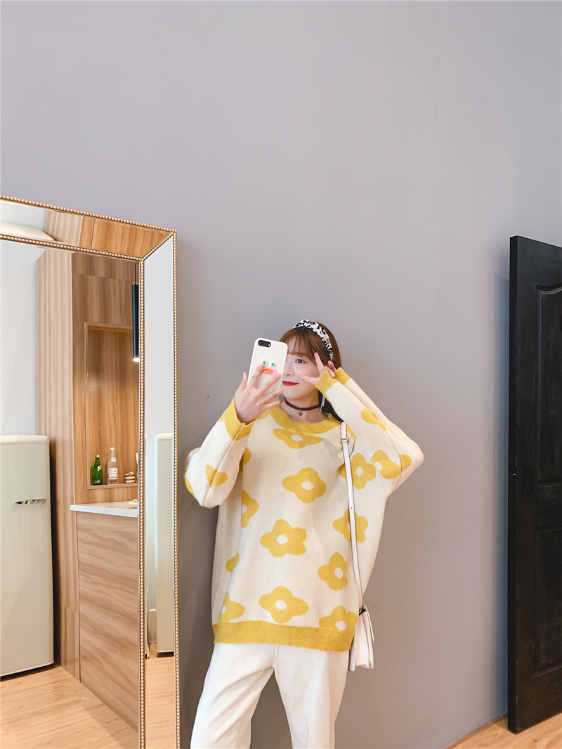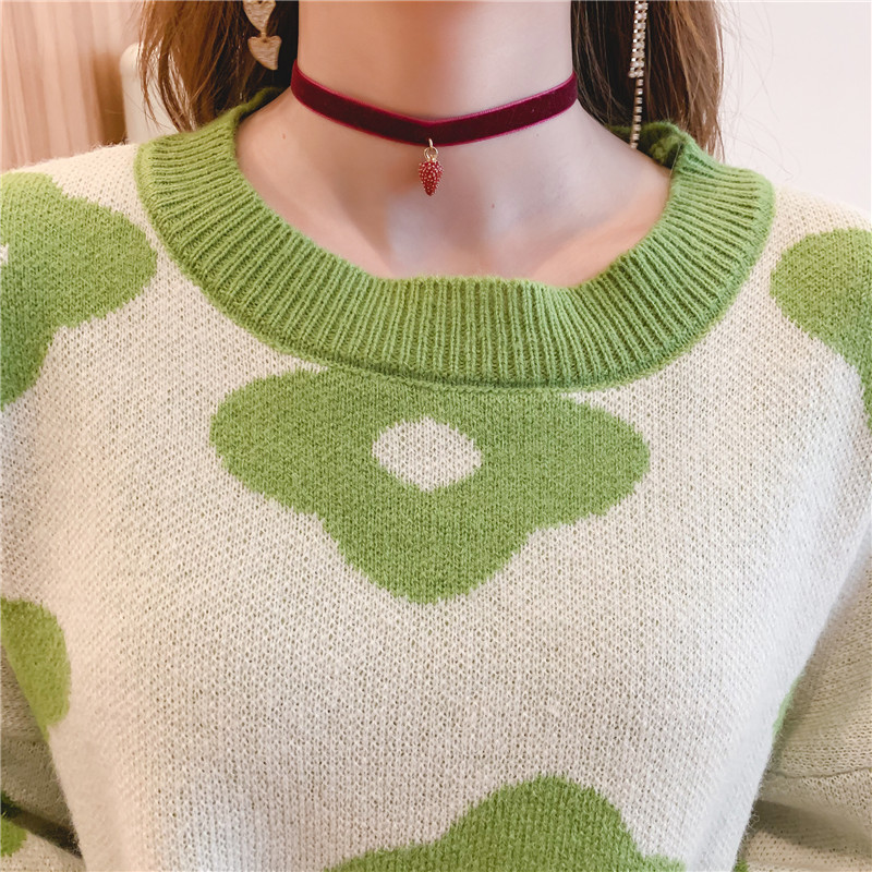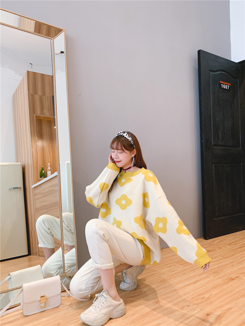 2019秋冬新款女慵懶寬松套頭牛油果綠花朵毛衣網紅針織打底衫上衣1入