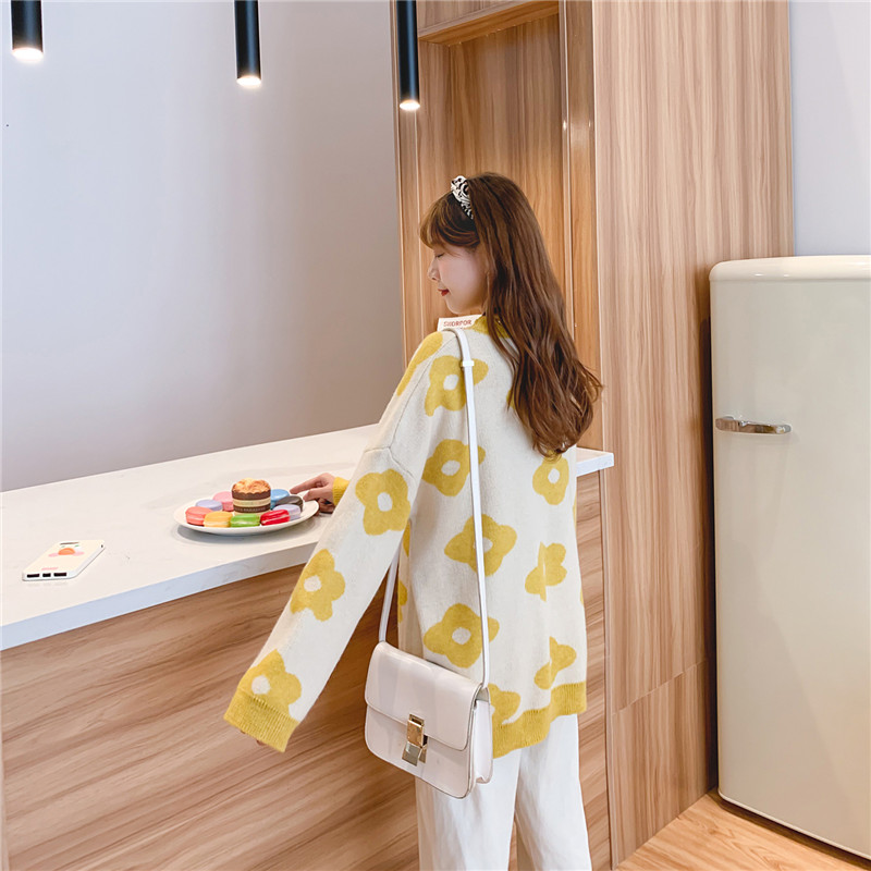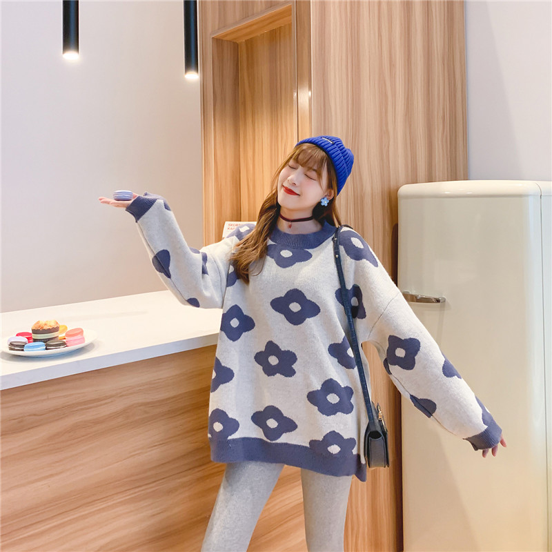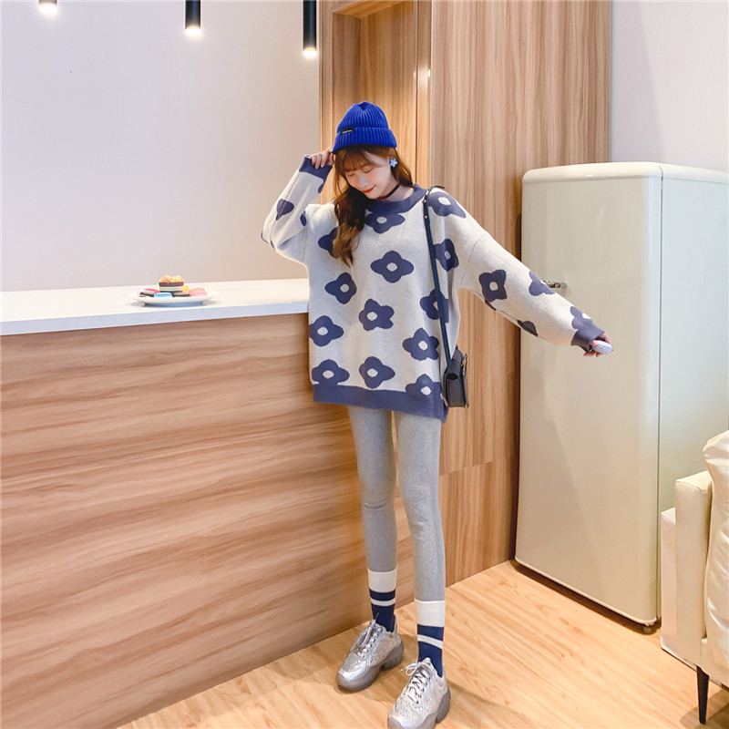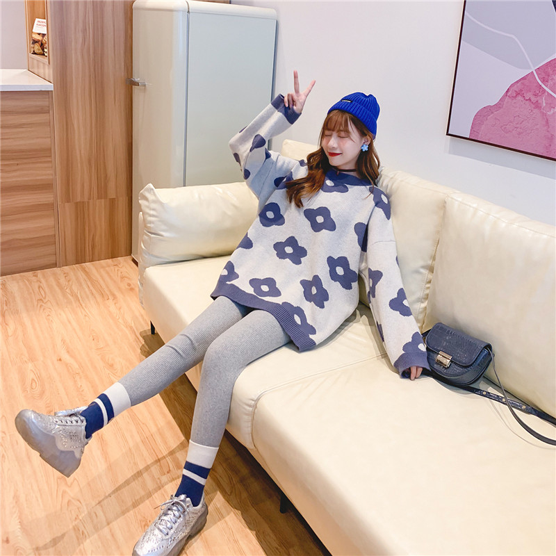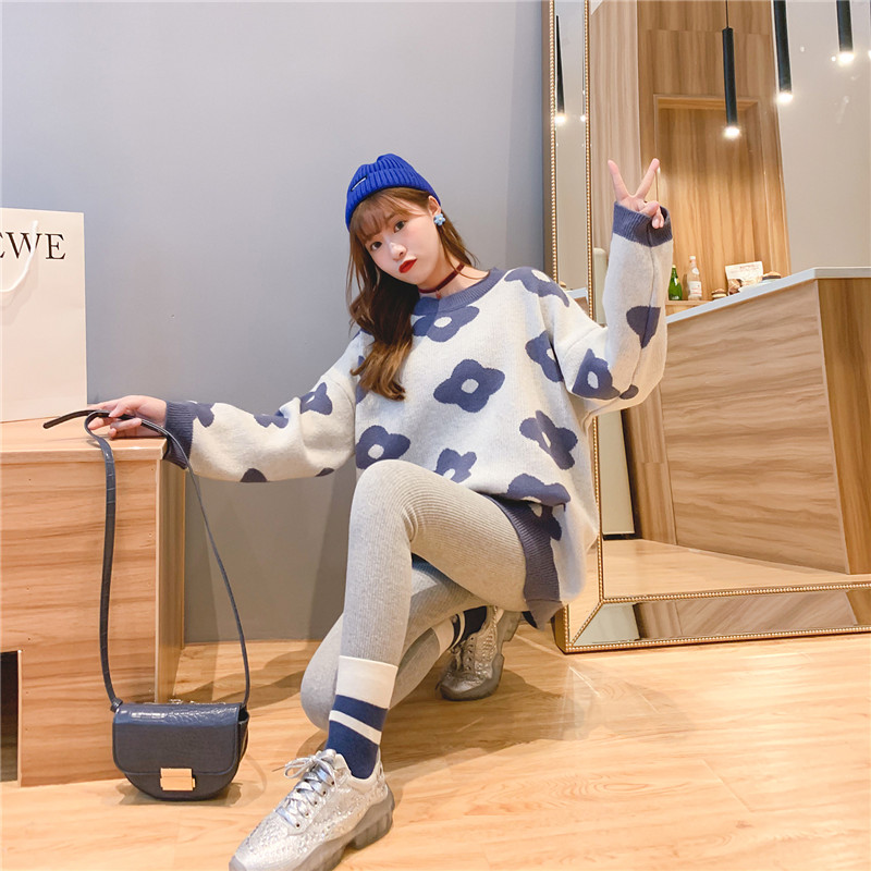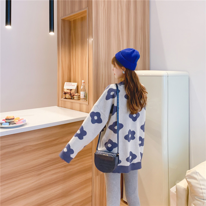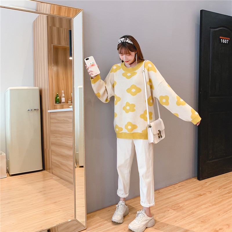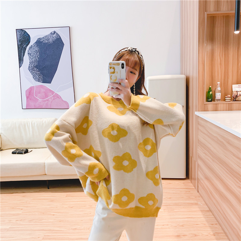 2019秋冬新款女慵懶寬松套頭牛油果綠花朵毛衣網紅針織打底衫上衣1入