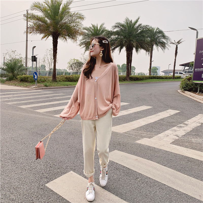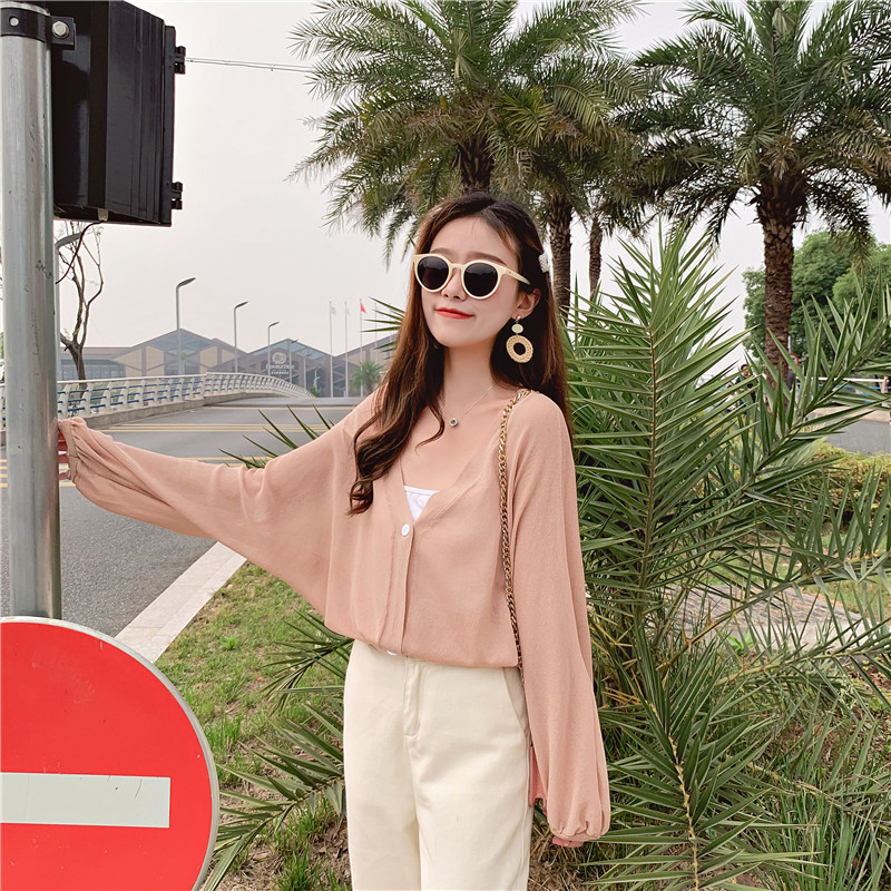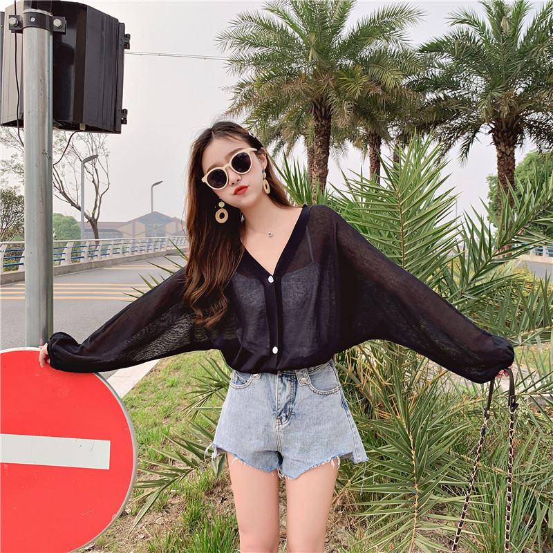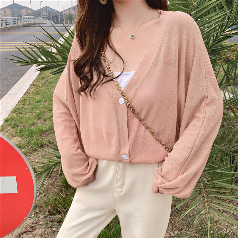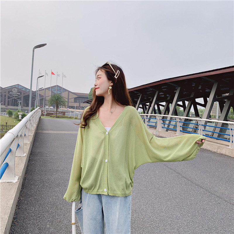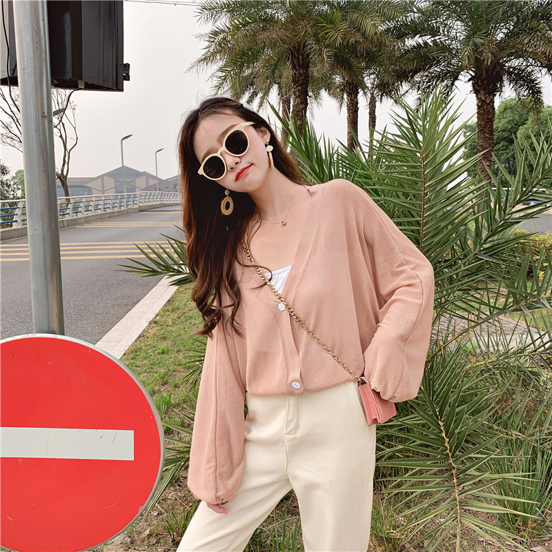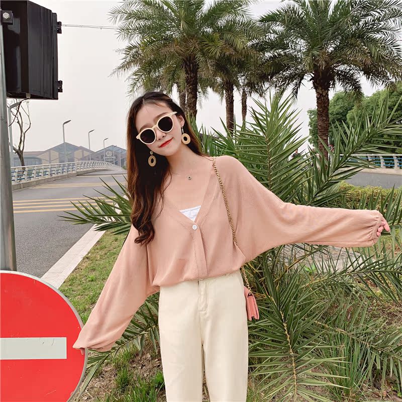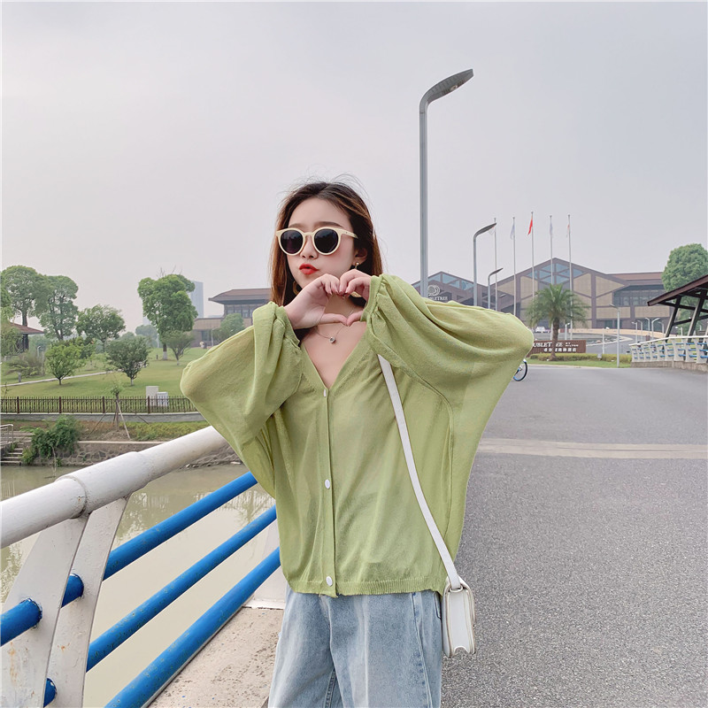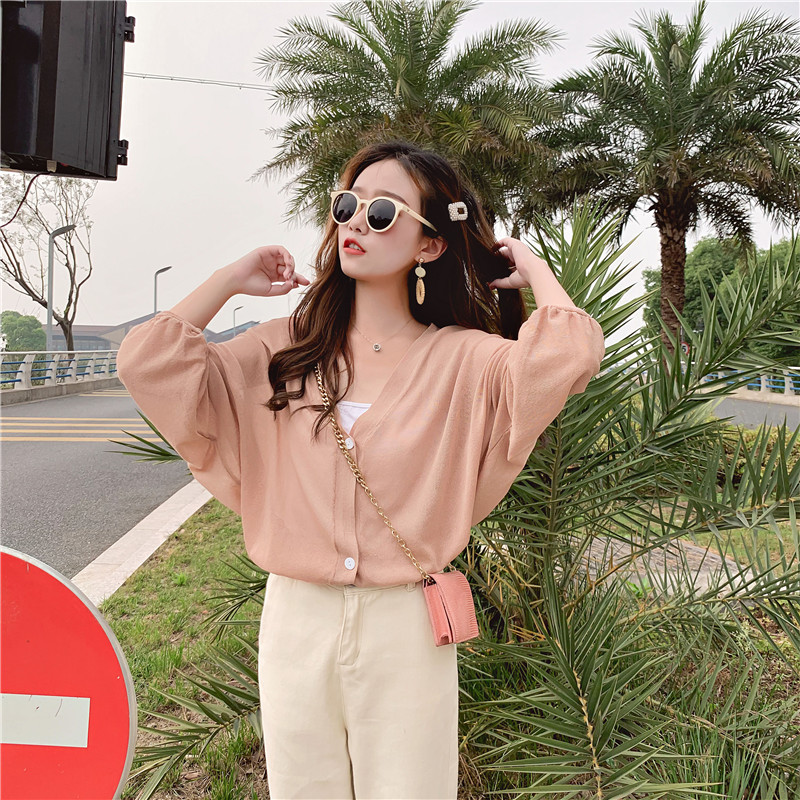 蝙蝠袖開衫2019春夏新款女裝寬松紐扣V領防曬空調衫外搭薄款上衣1入