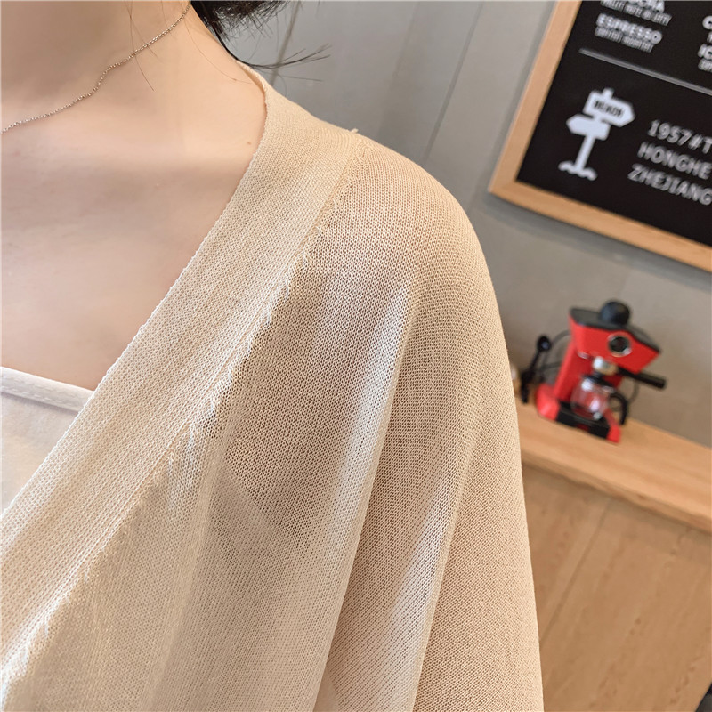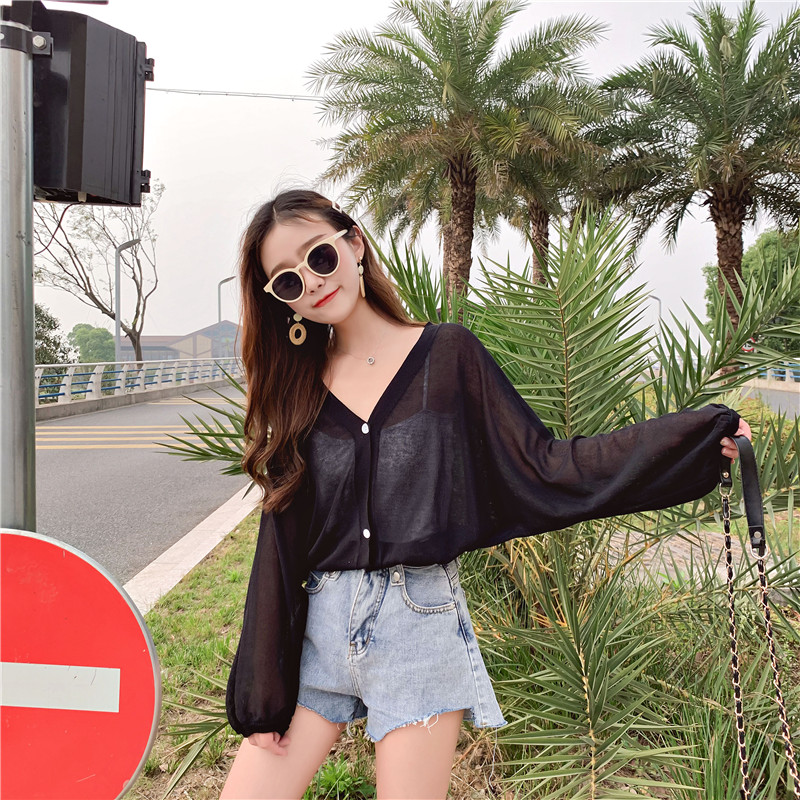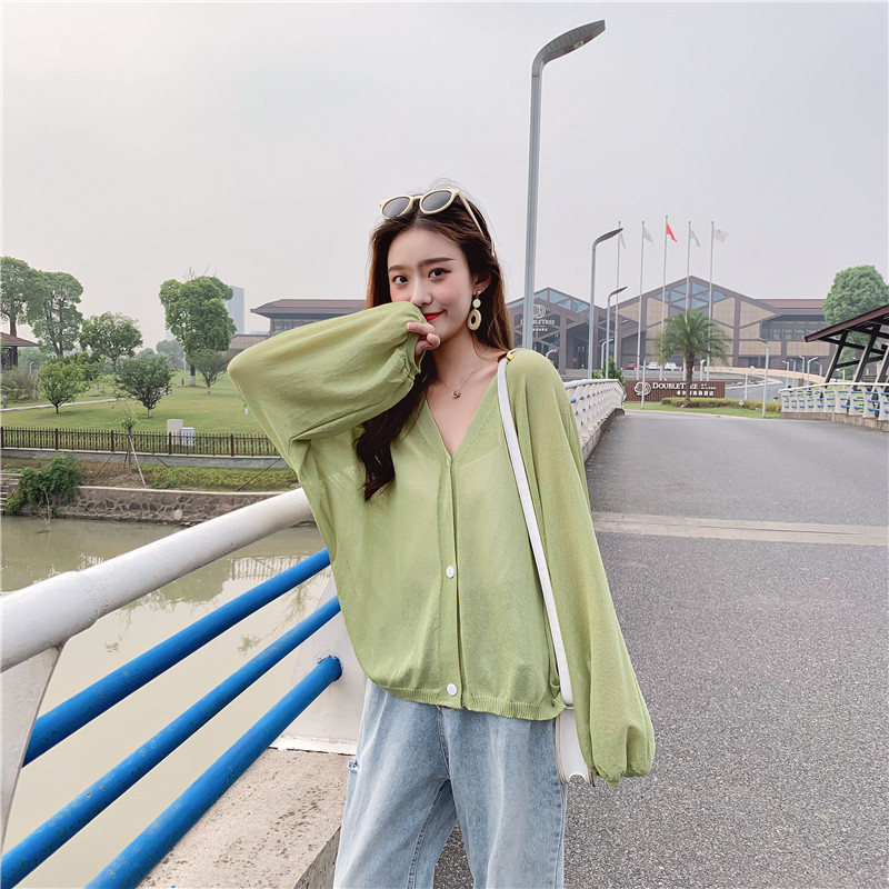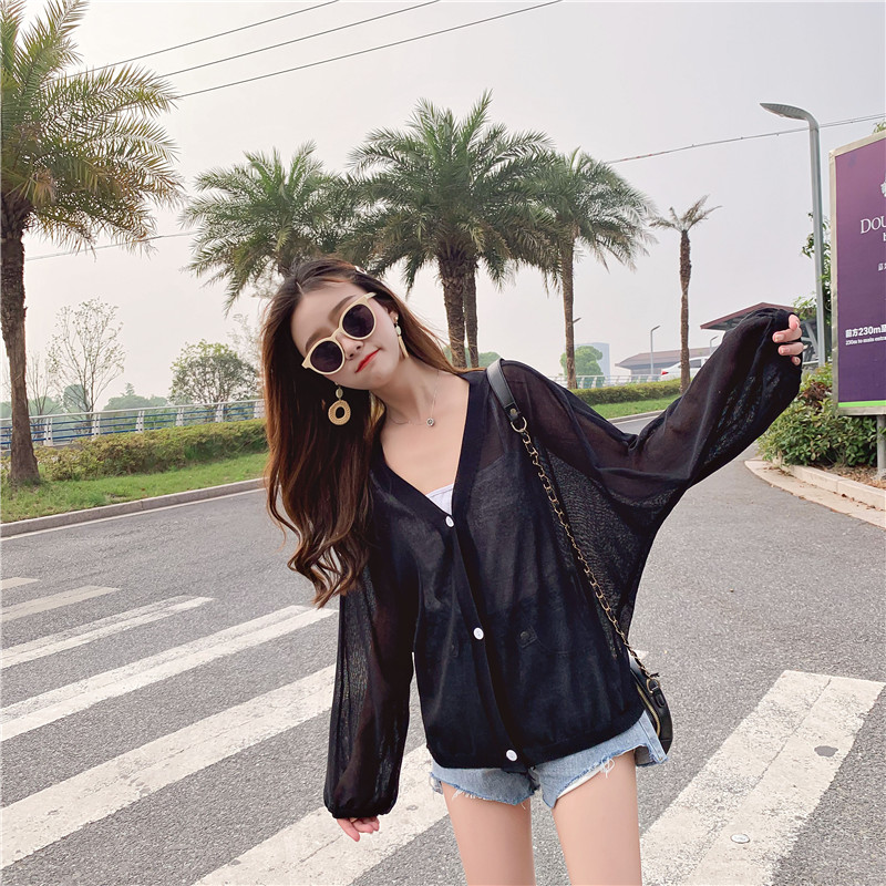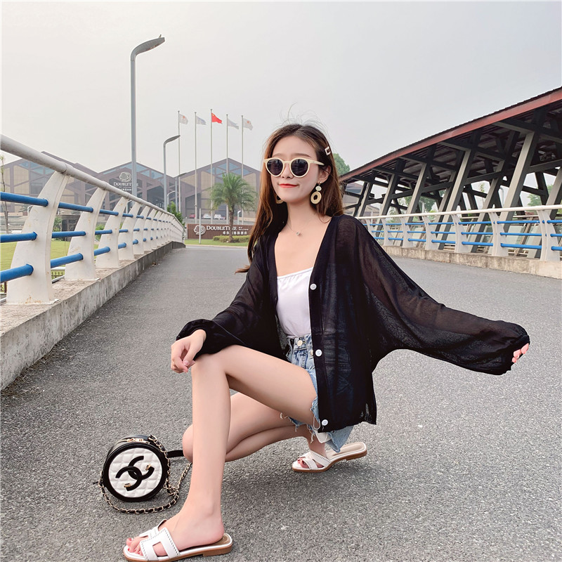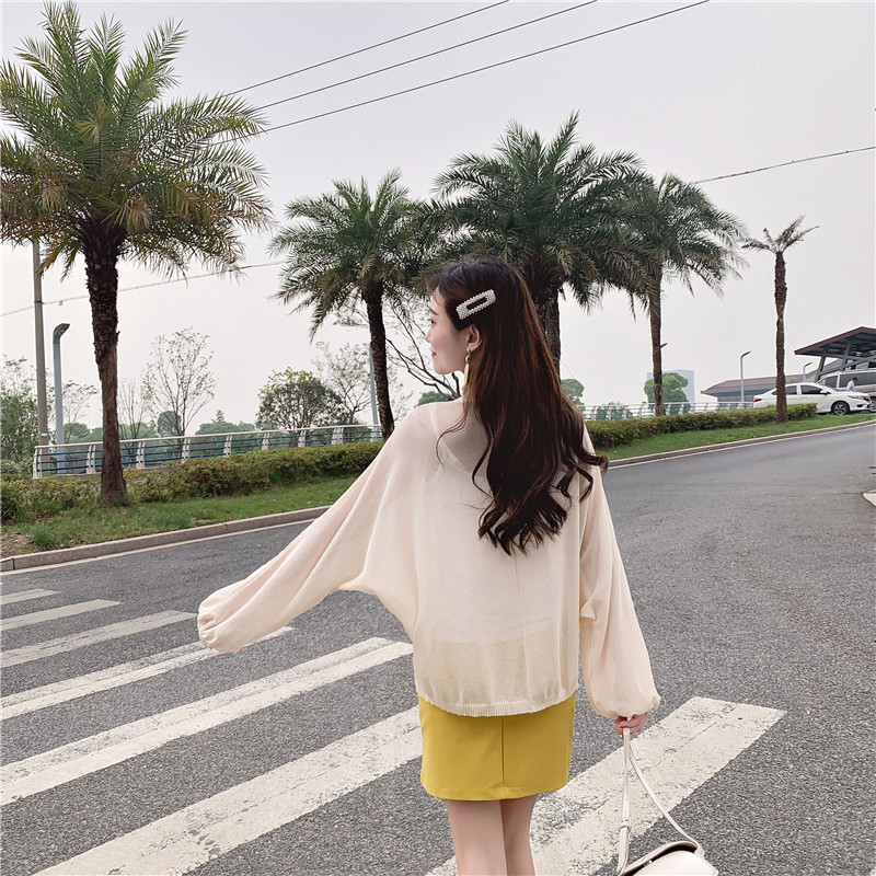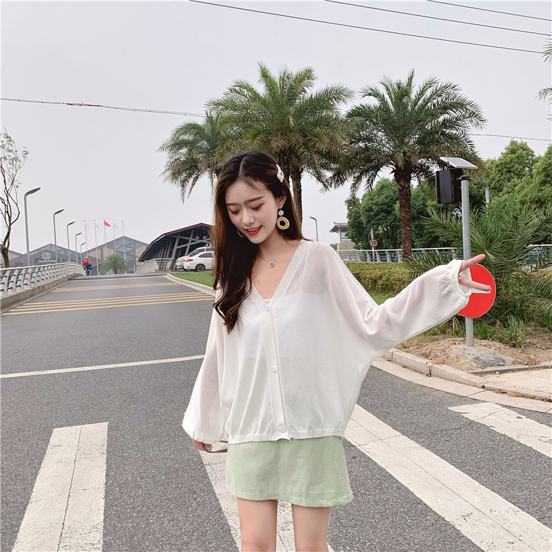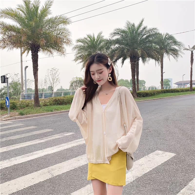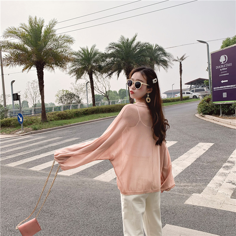 蝙蝠袖開衫2019春夏新款女裝寬松紐扣V領防曬空調衫外搭薄款上衣1入