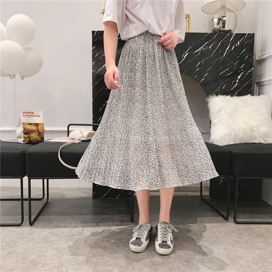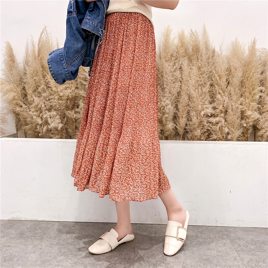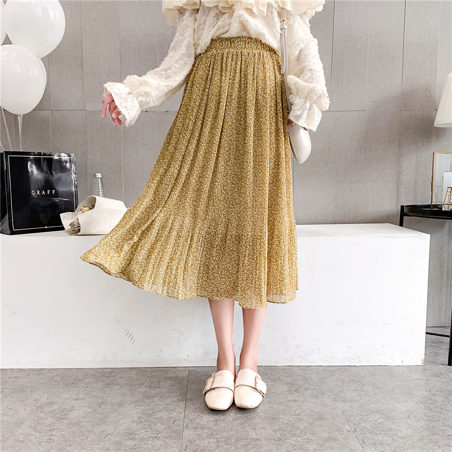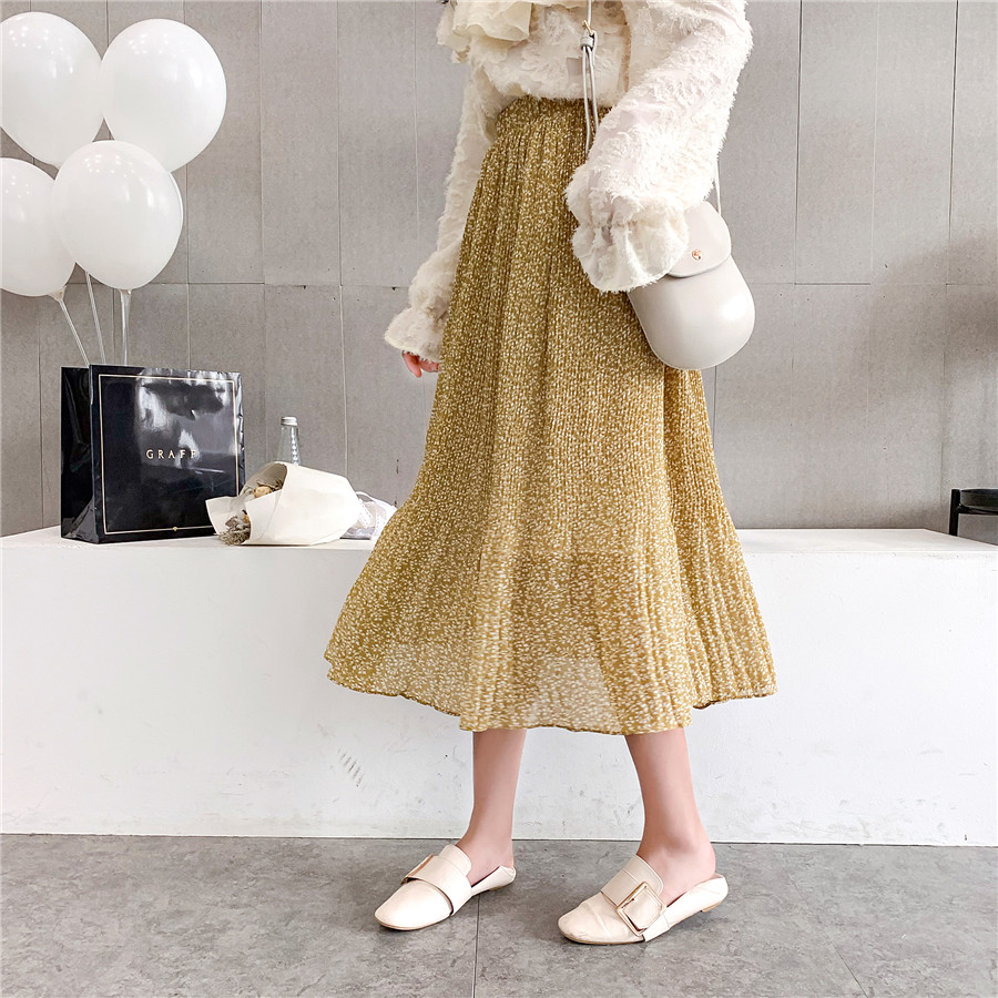 雪紡半身裙2019春夏新款女裝中長款高腰百搭復古甜美小碎花百褶裙1入