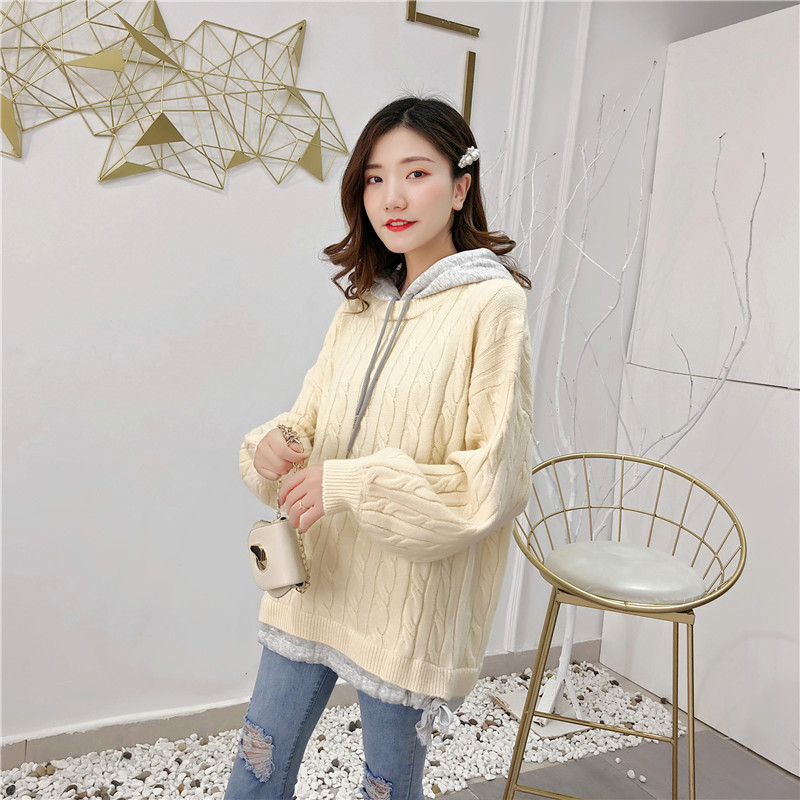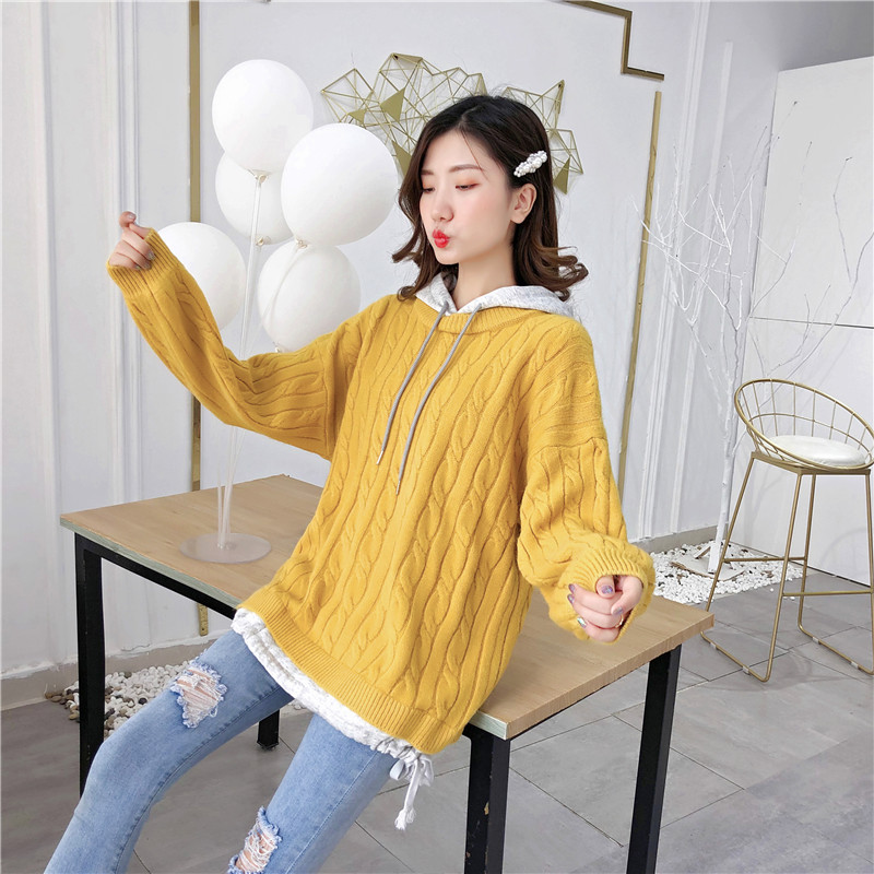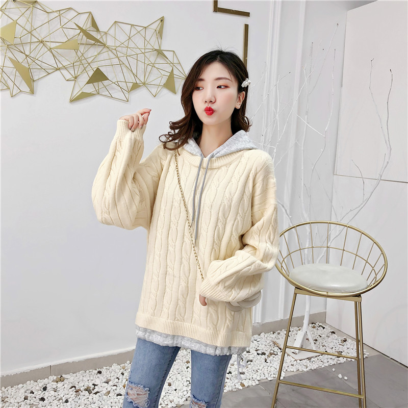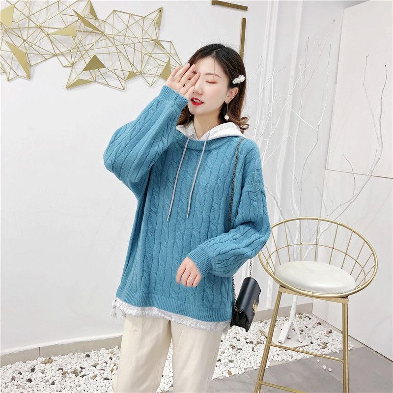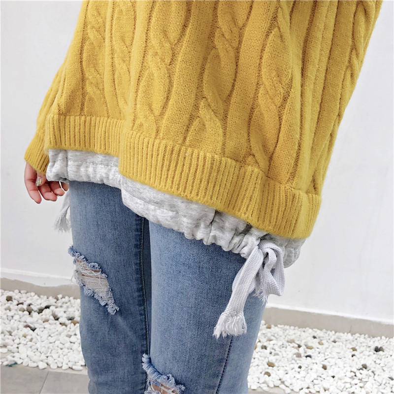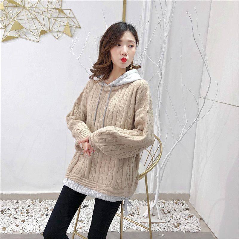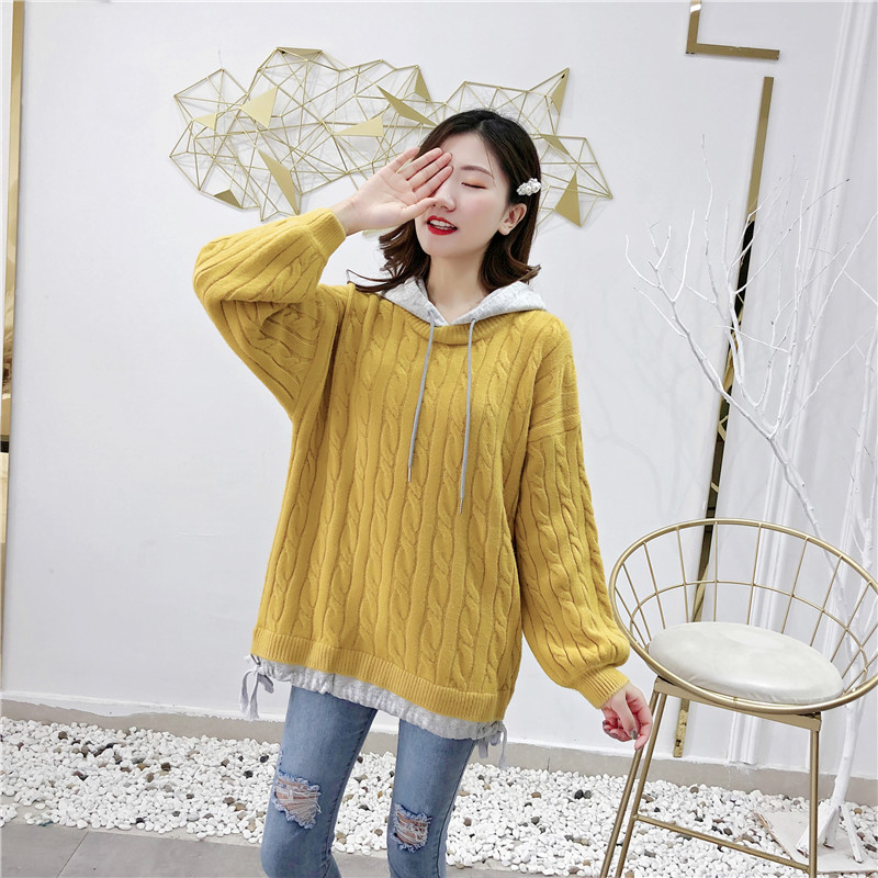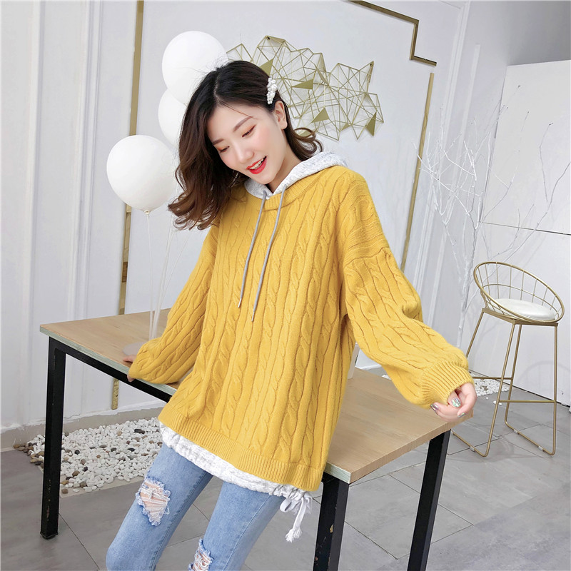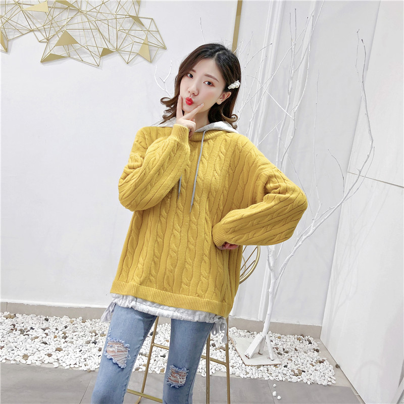 2019秋冬新款假兩件連帽衛衣女套頭毛衣針織衫抽繩慵懶風上衣外套1入