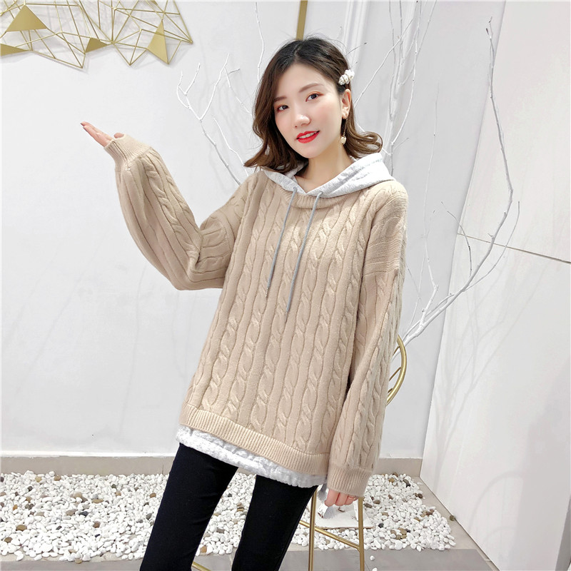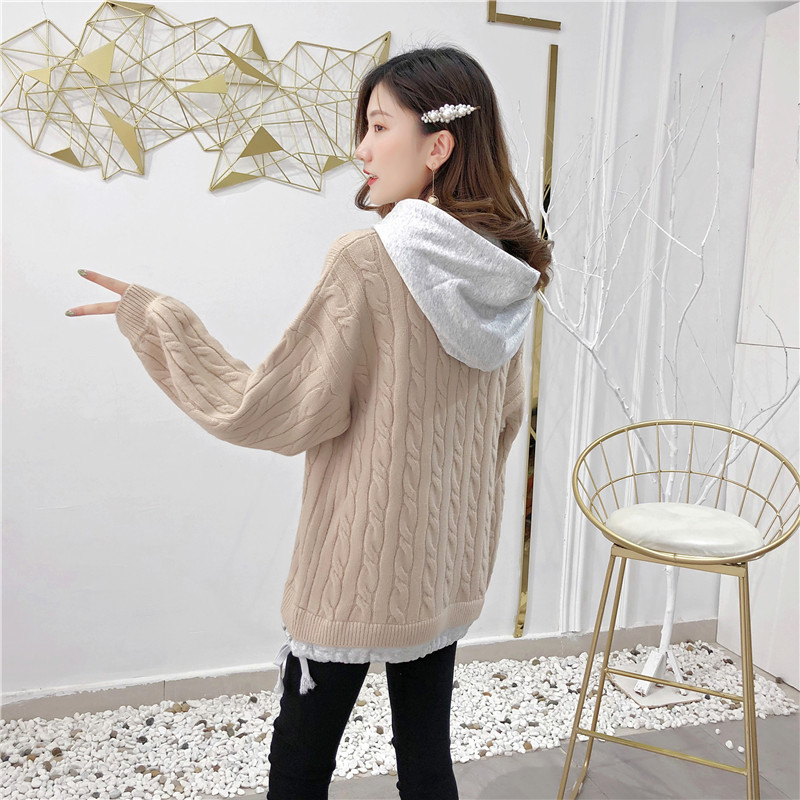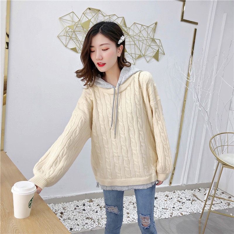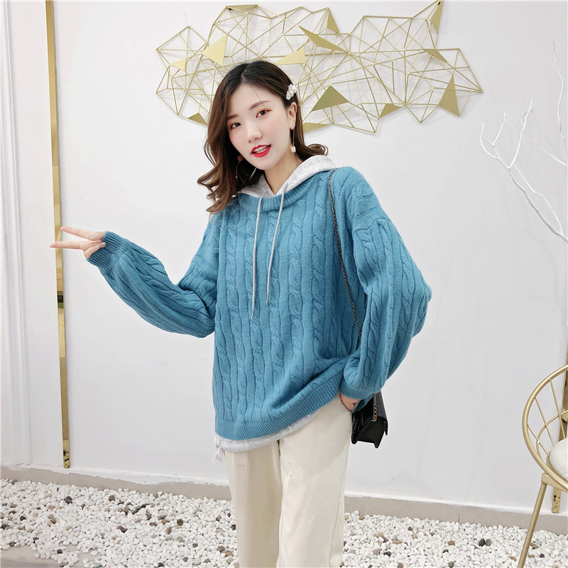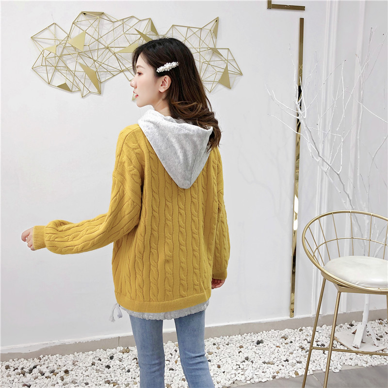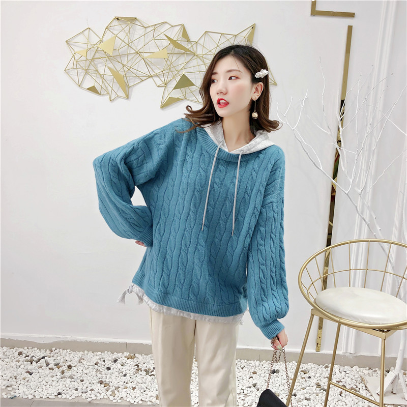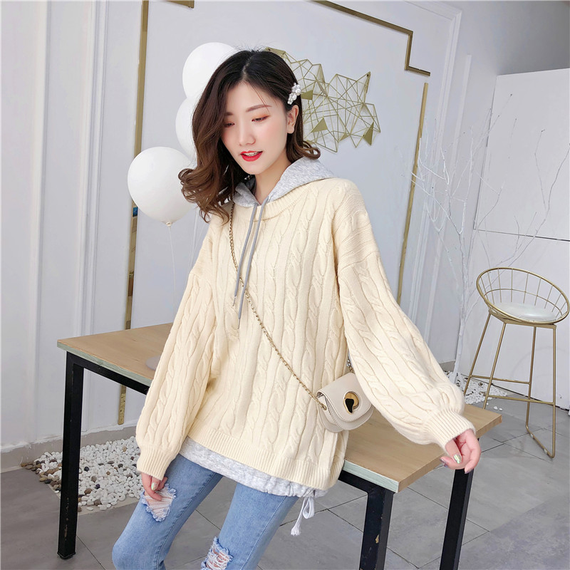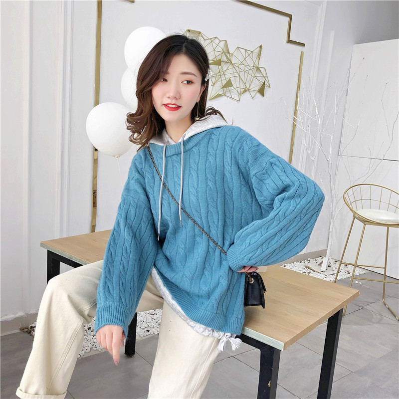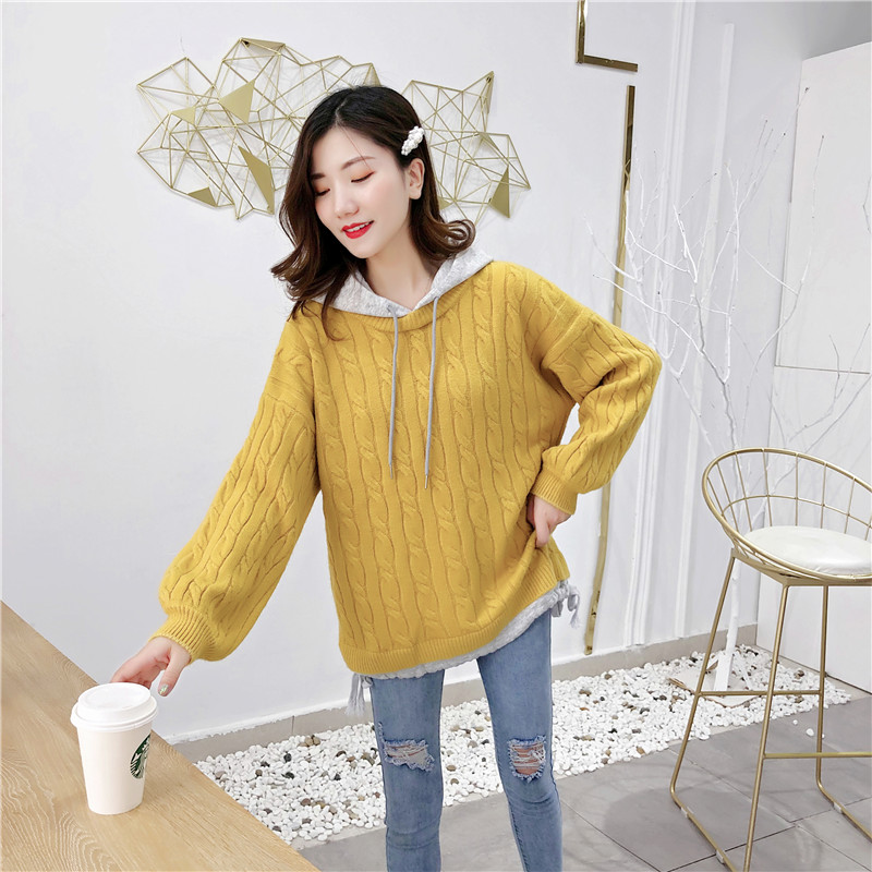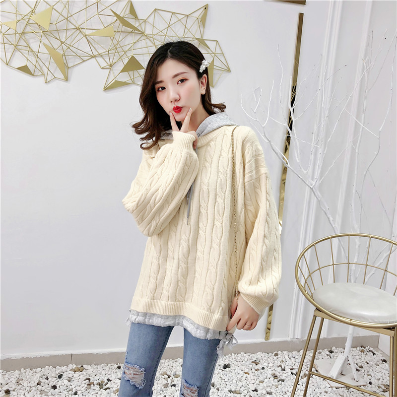 2019秋冬新款假兩件連帽衛衣女套頭毛衣針織衫抽繩慵懶風上衣外套1入