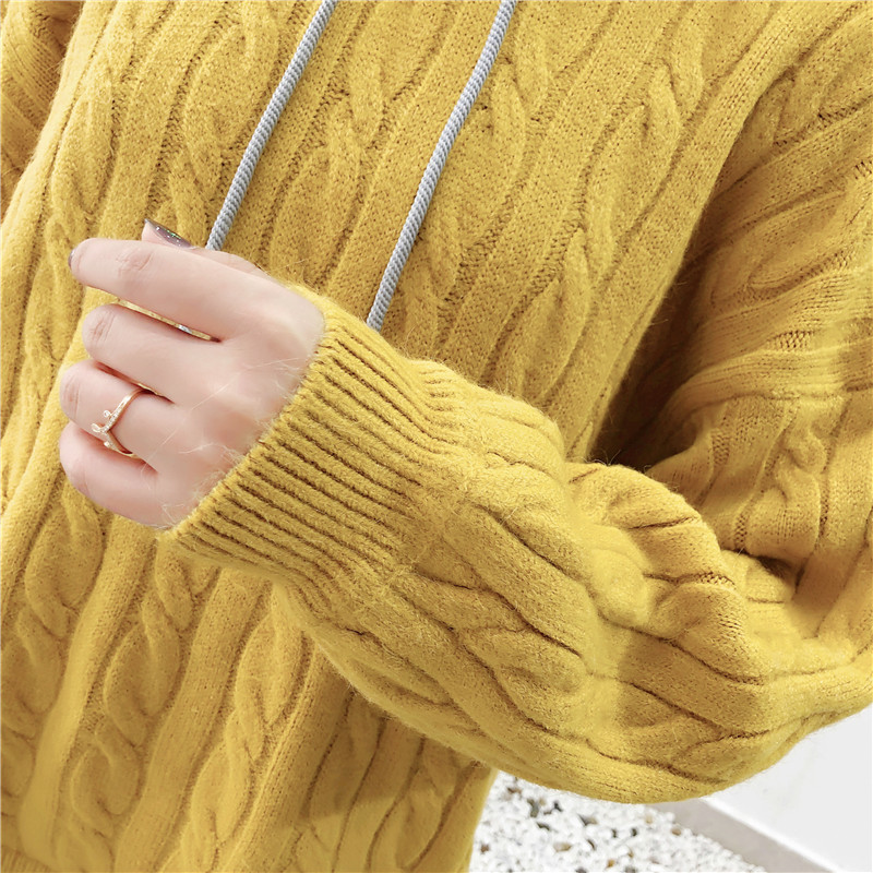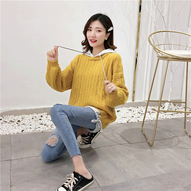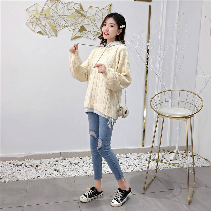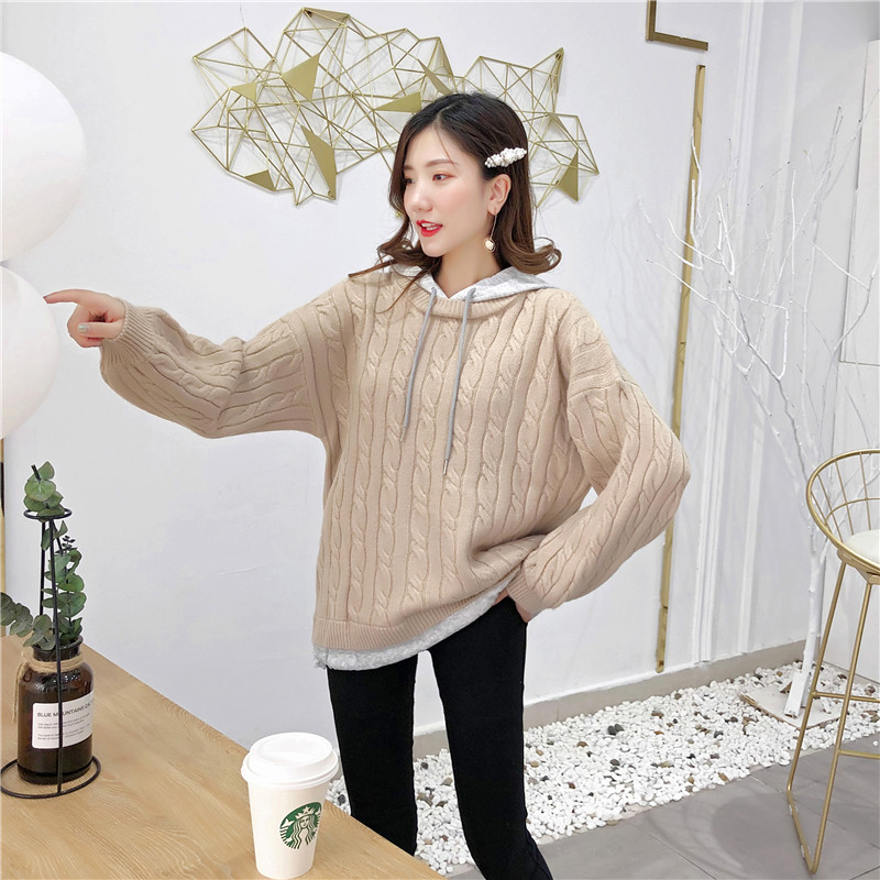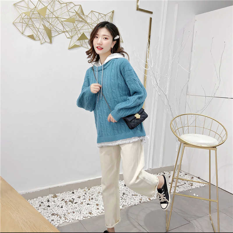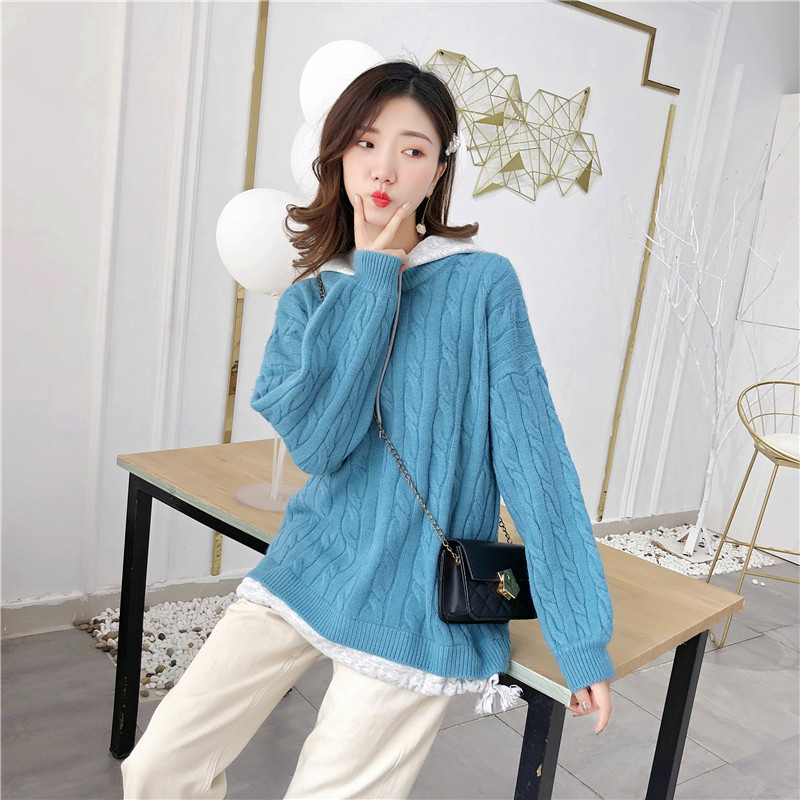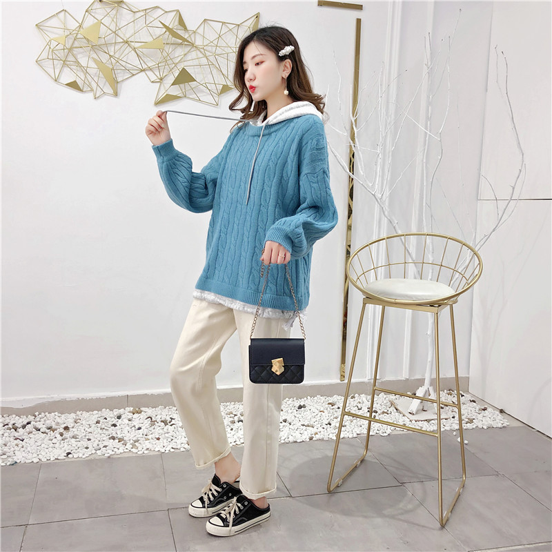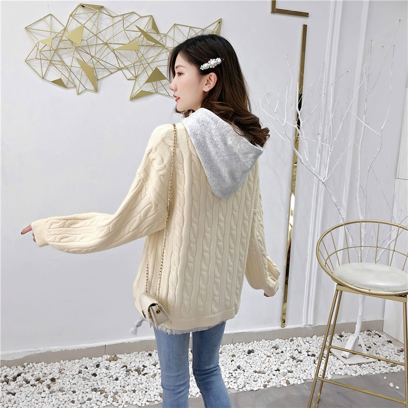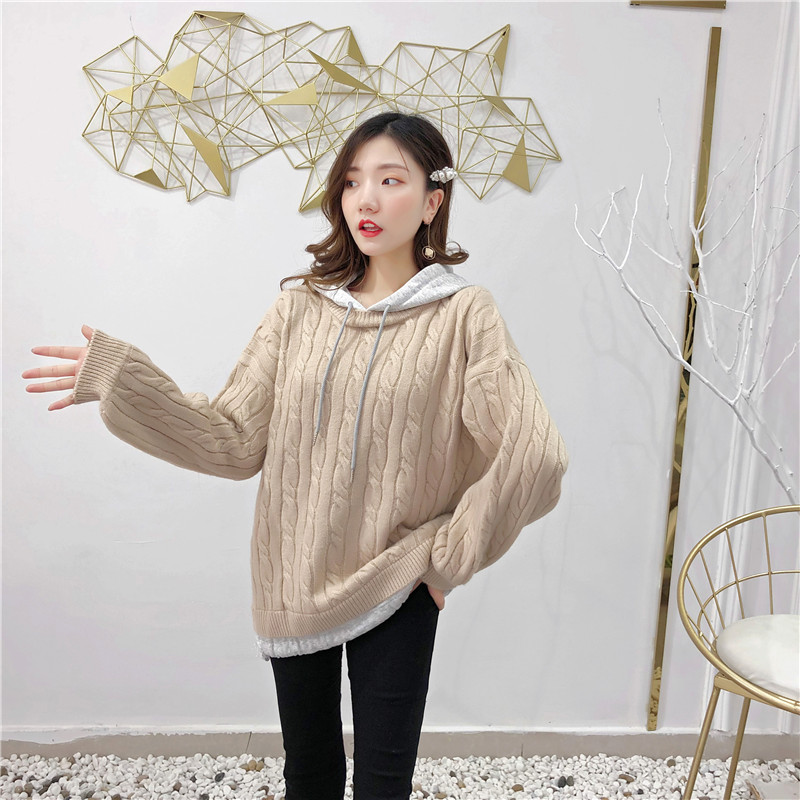 2019秋冬新款假兩件連帽衛衣女套頭毛衣針織衫抽繩慵懶風上衣外套1入