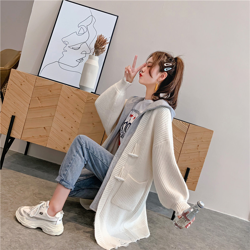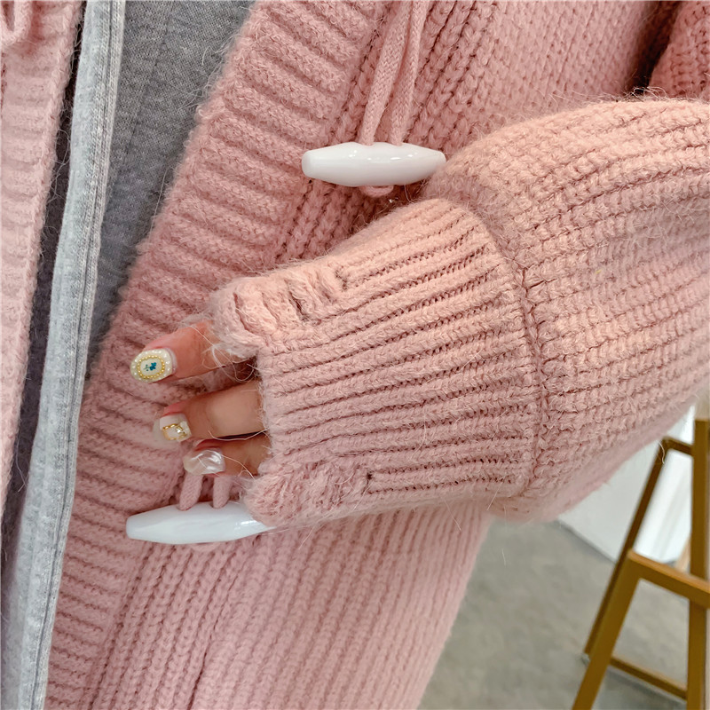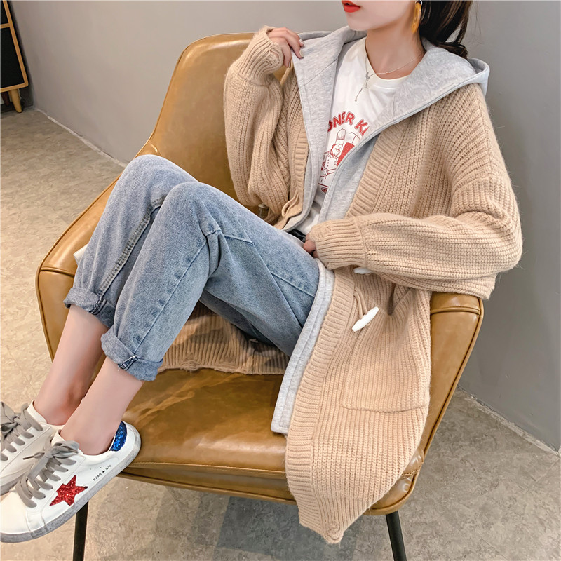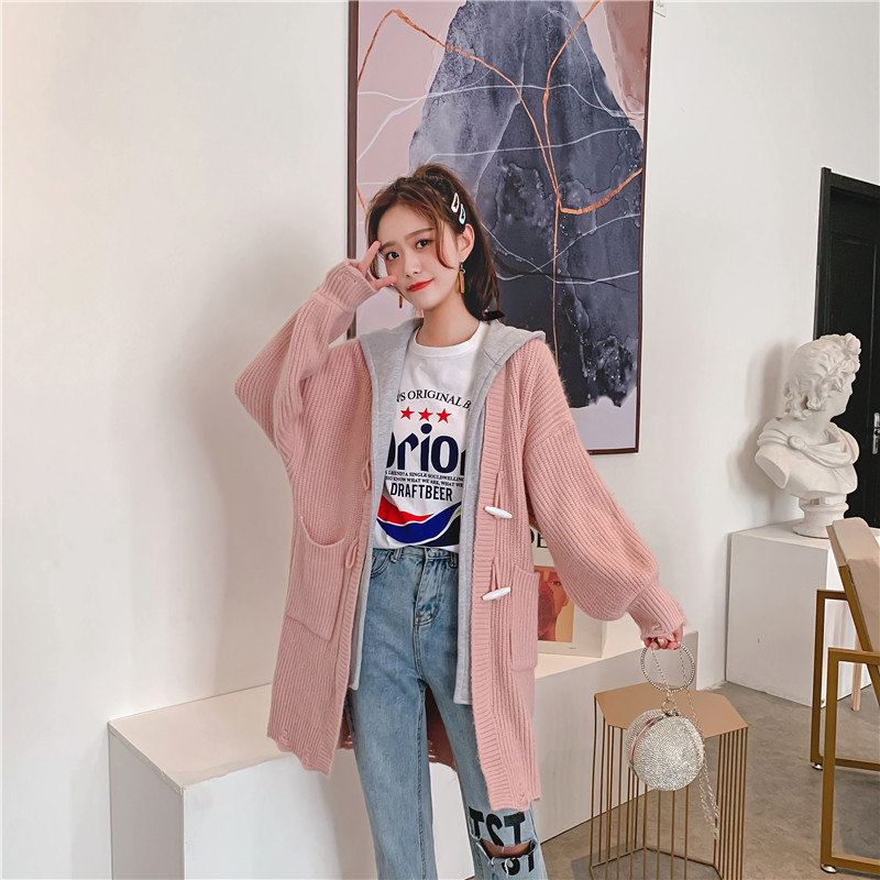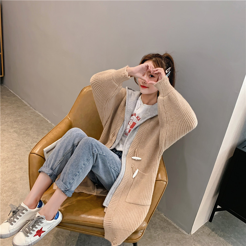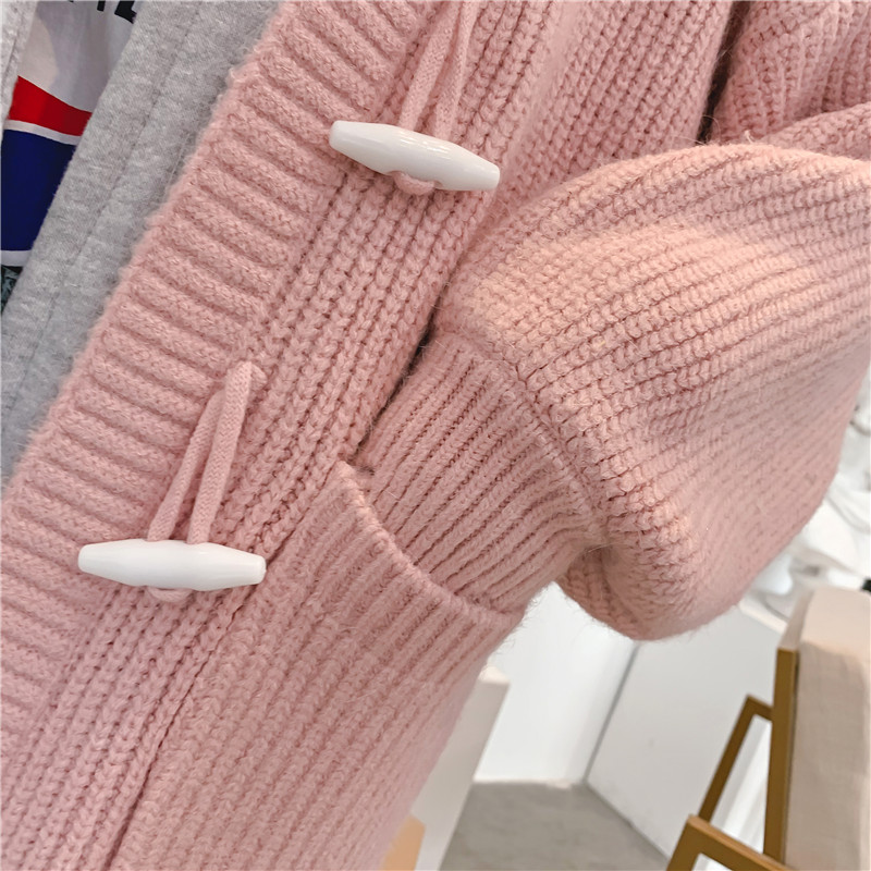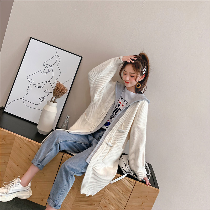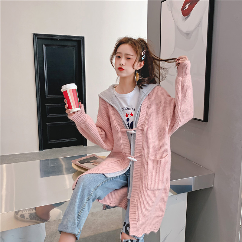 2019秋冬季新款女裝中長款連帽假兩件毛衣開衫牛角扣上衣針織外套1入