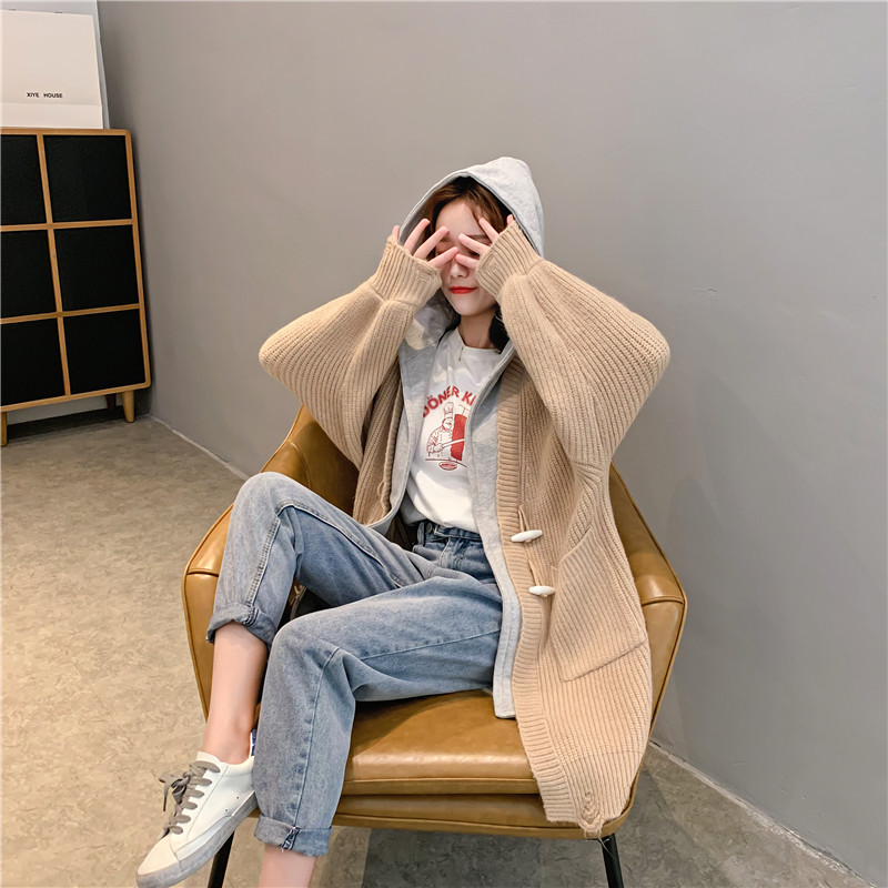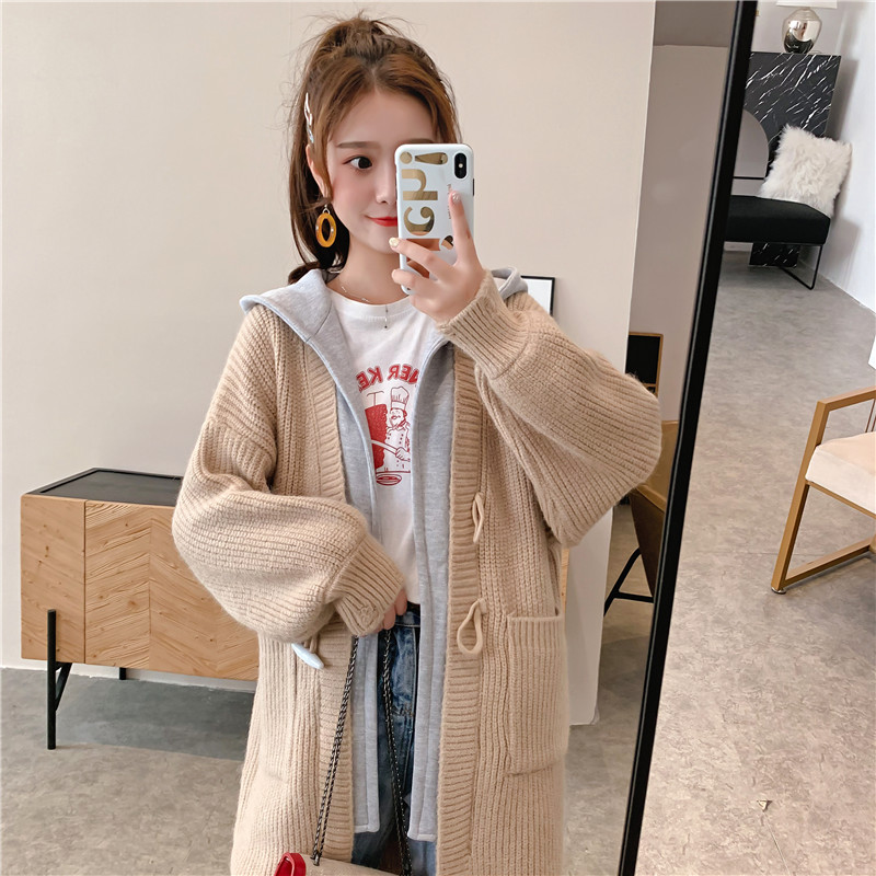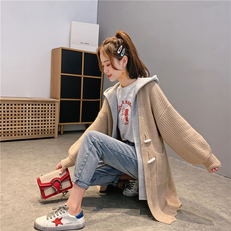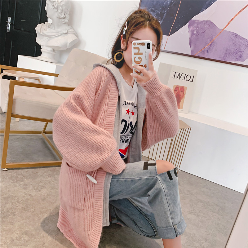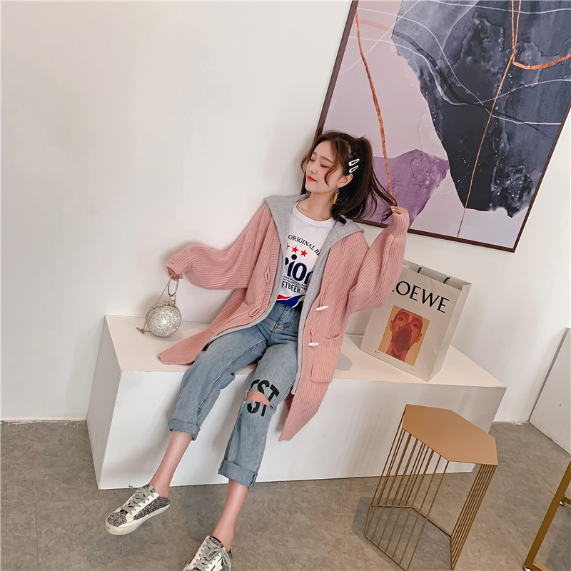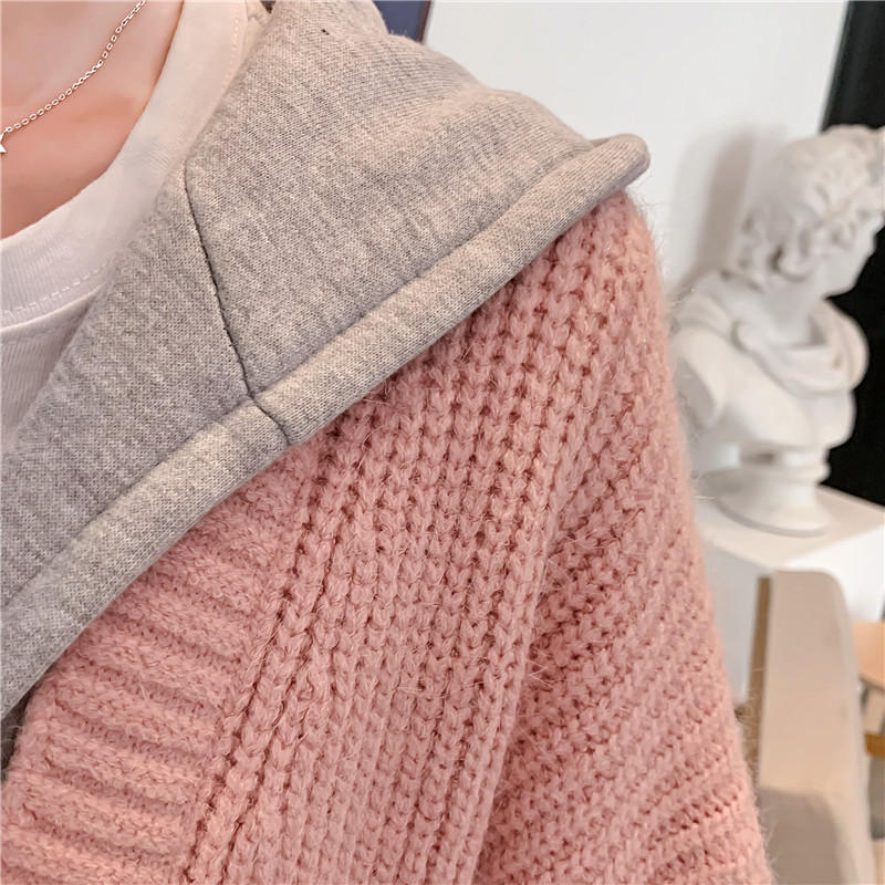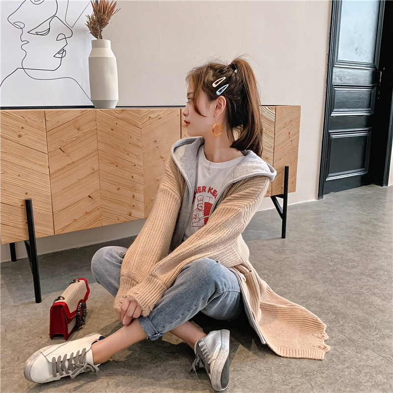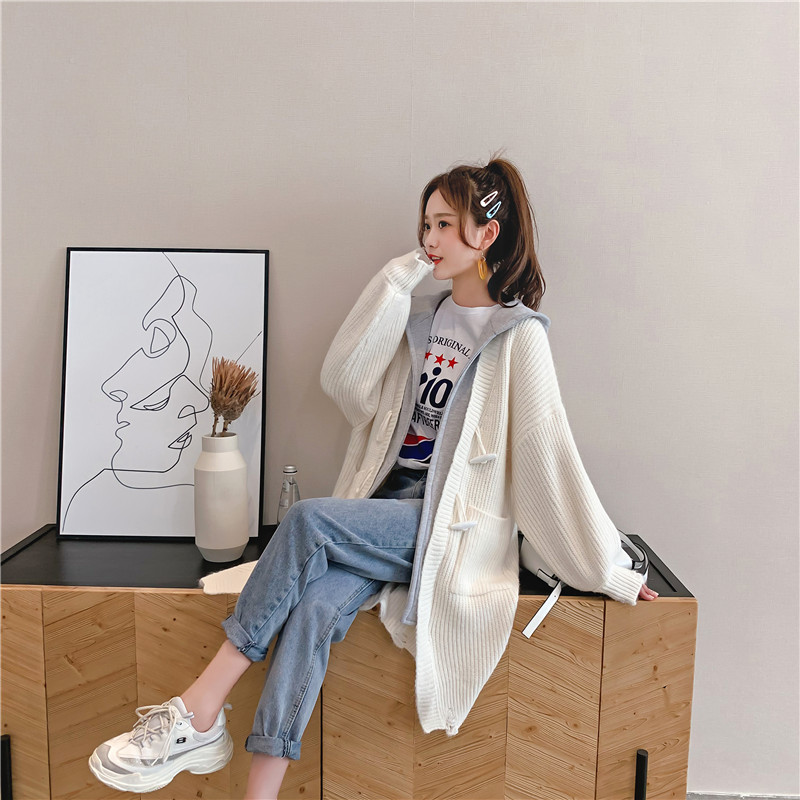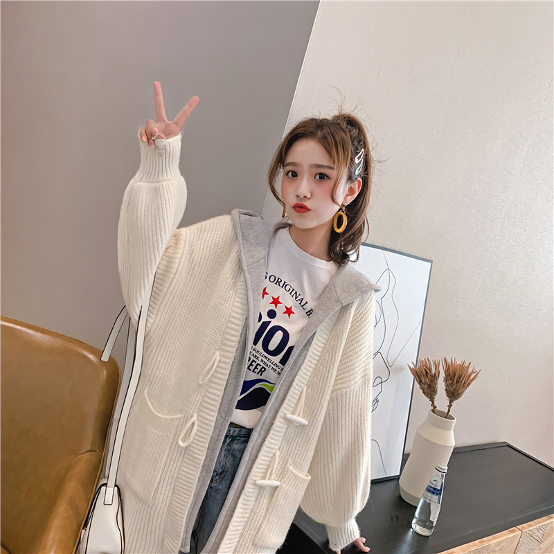 2019秋冬季新款女裝中長款連帽假兩件毛衣開衫牛角扣上衣針織外套1入