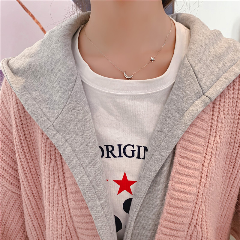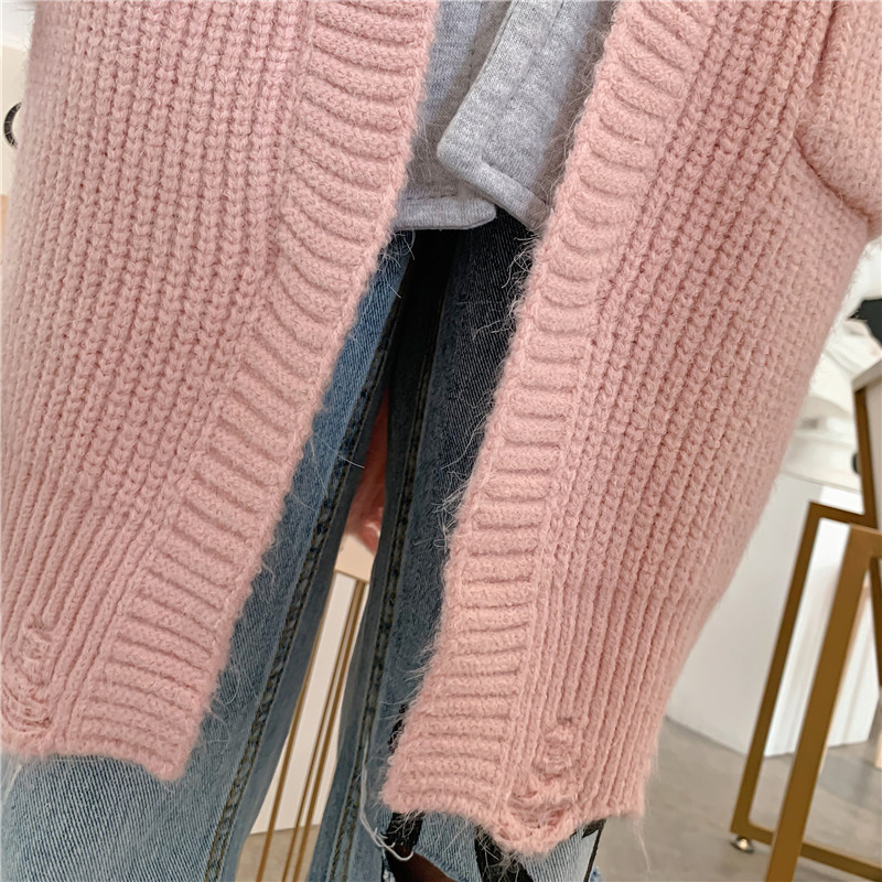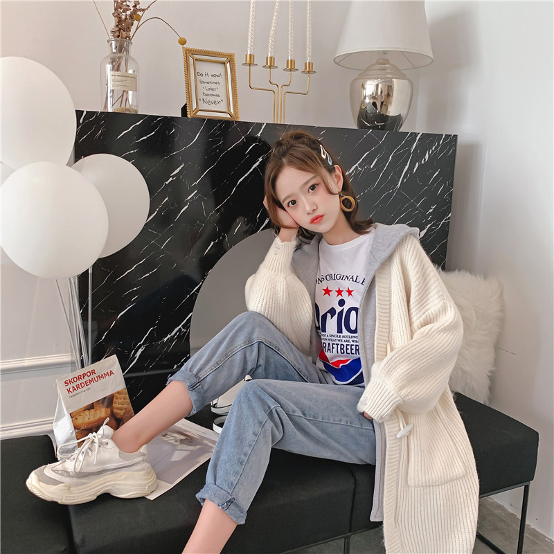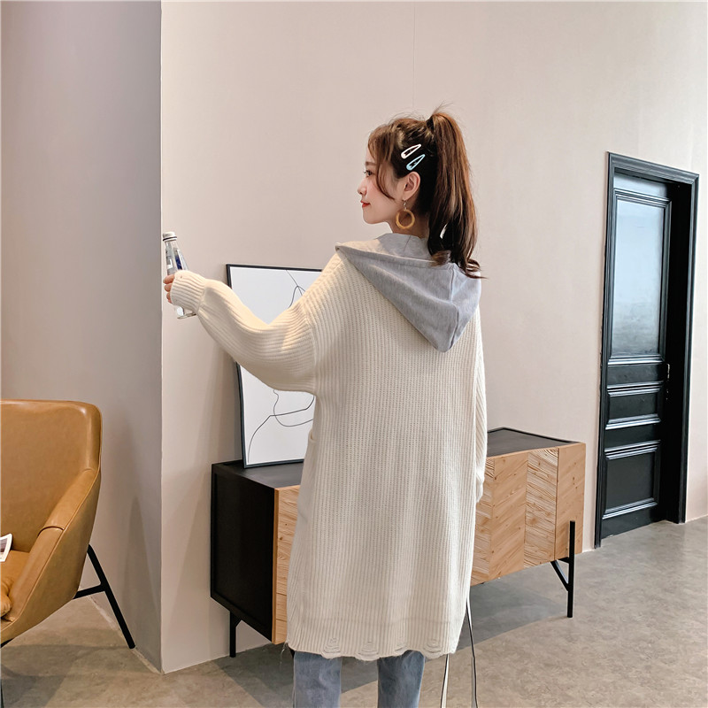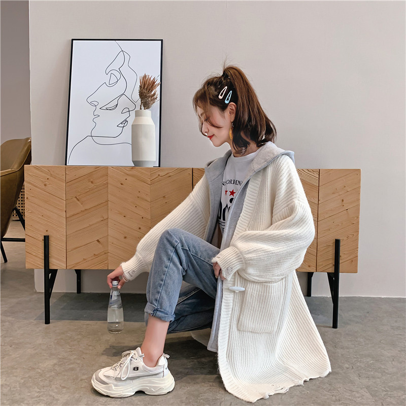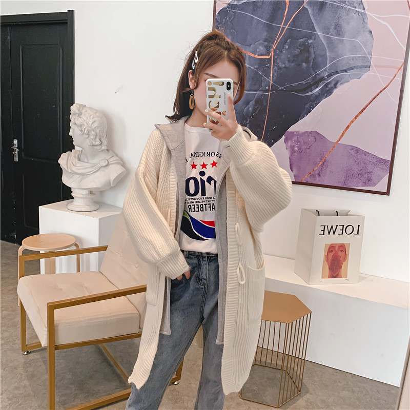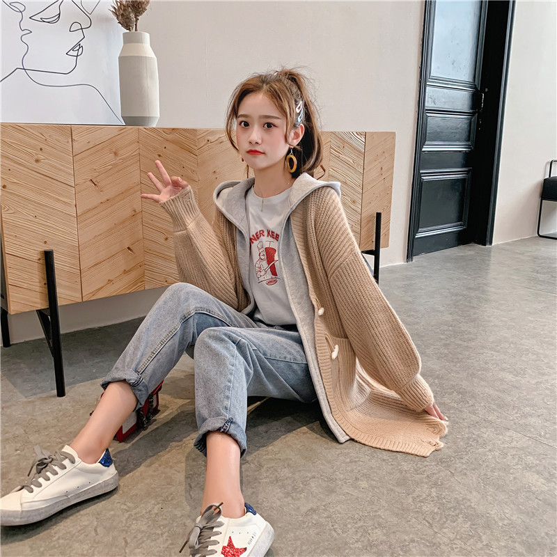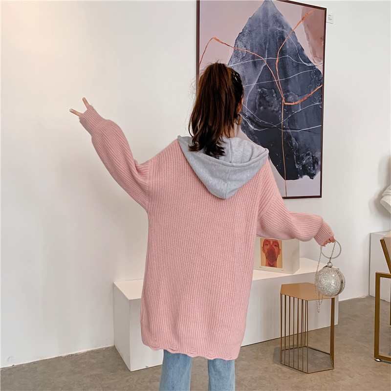 2019秋冬季新款女裝中長款連帽假兩件毛衣開衫牛角扣上衣針織外套1入