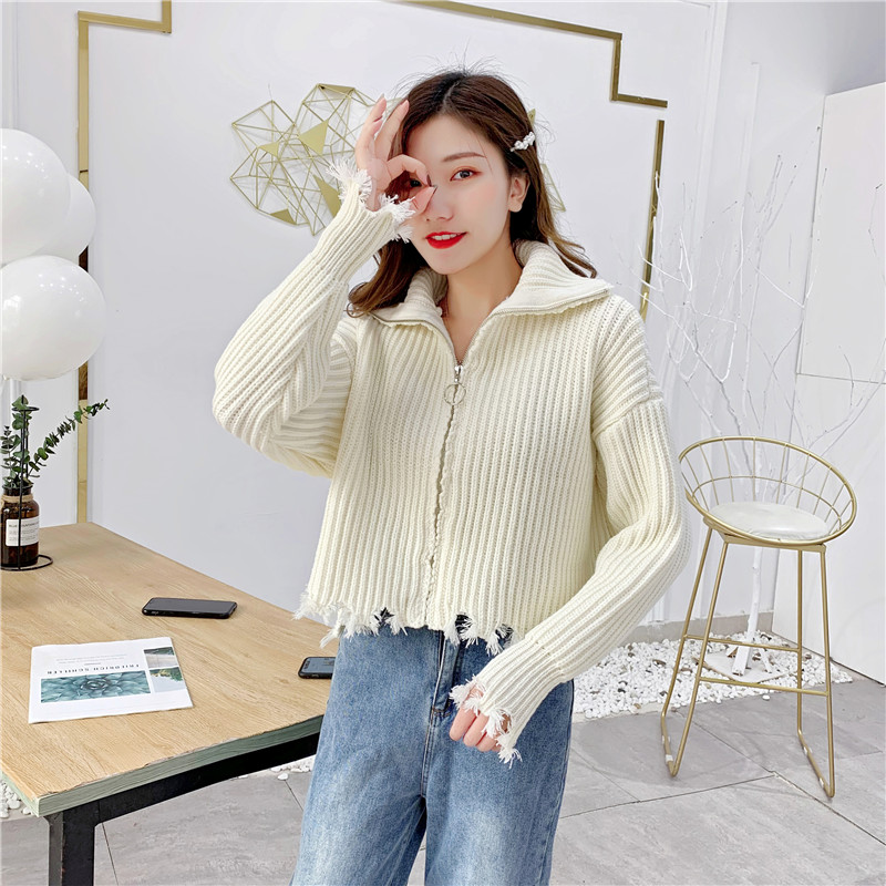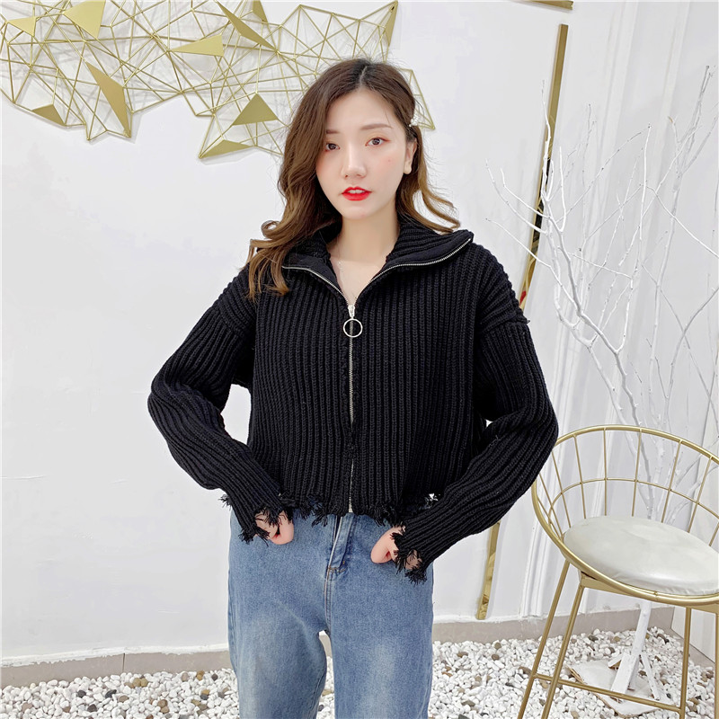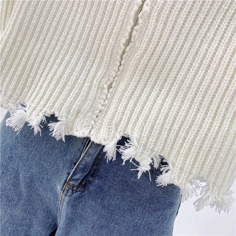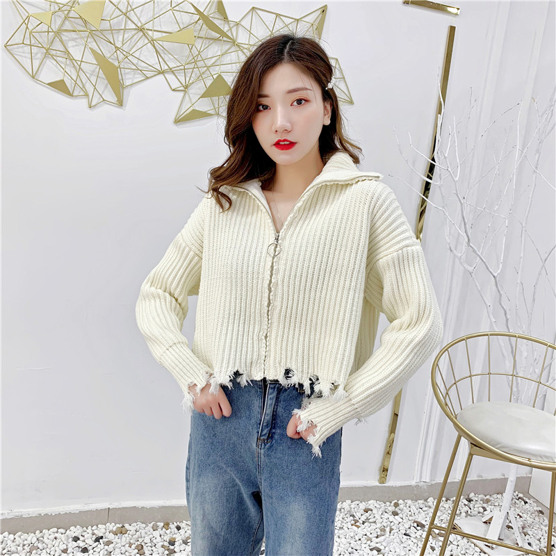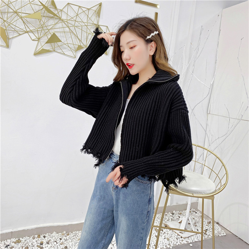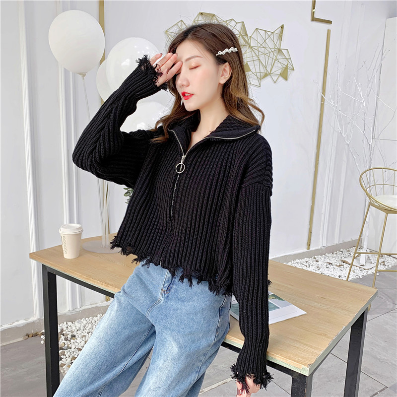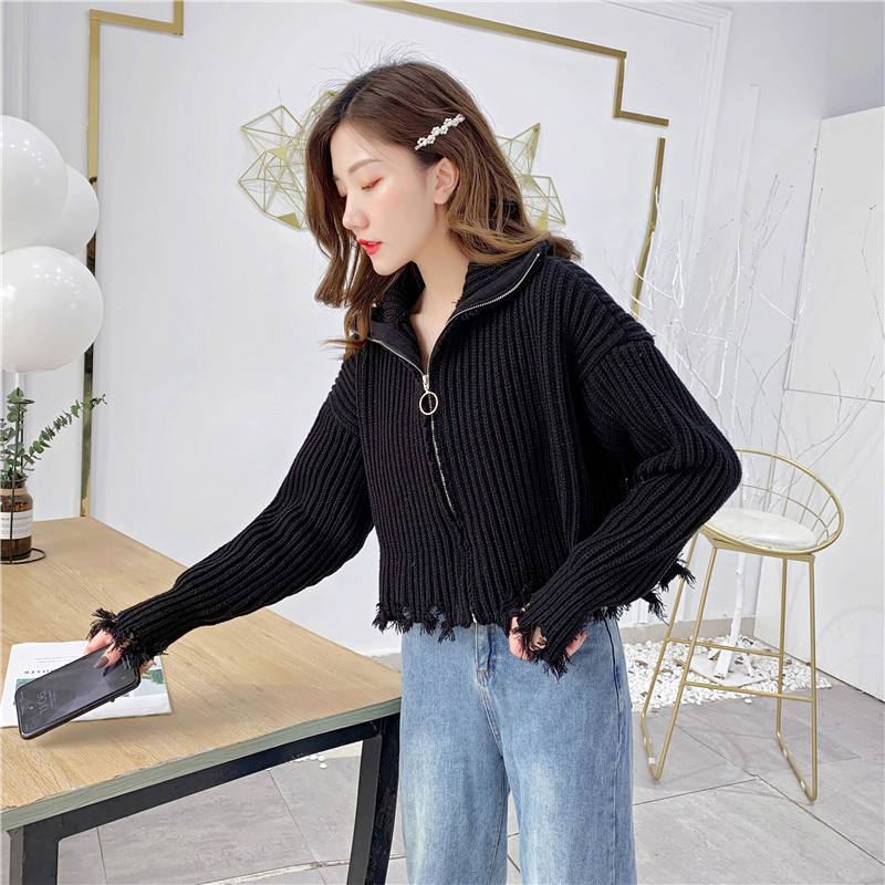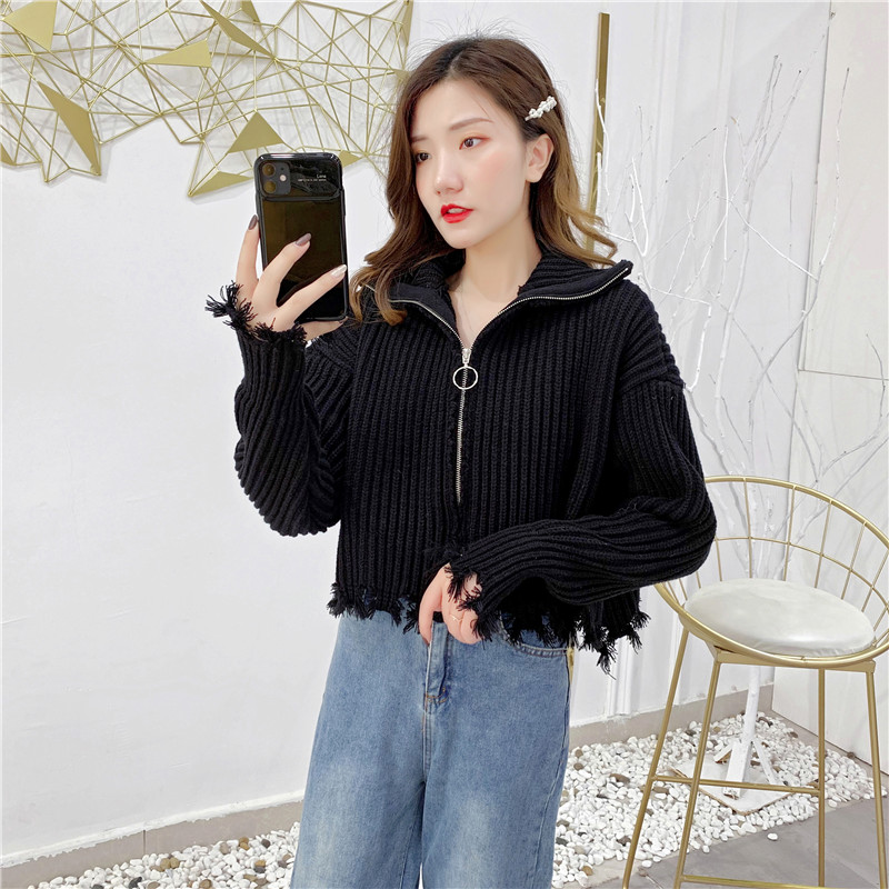 2019秋冬新款女裝寬松拉鏈毛衣短外套流蘇高領慵懶風針織開衫上衣1入