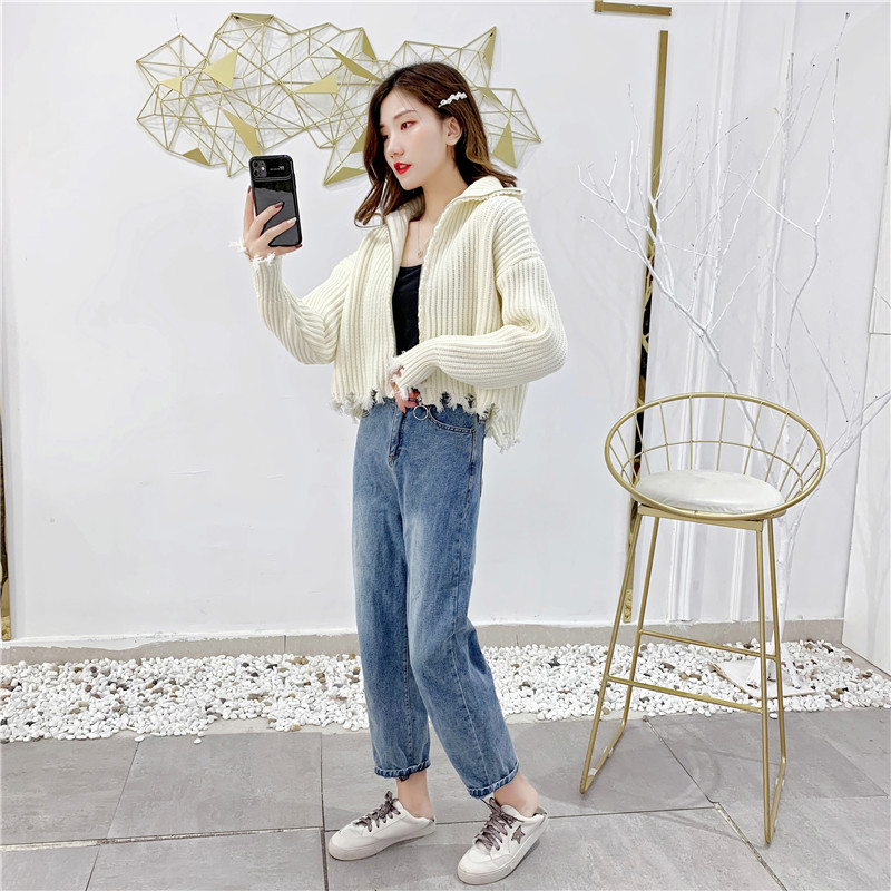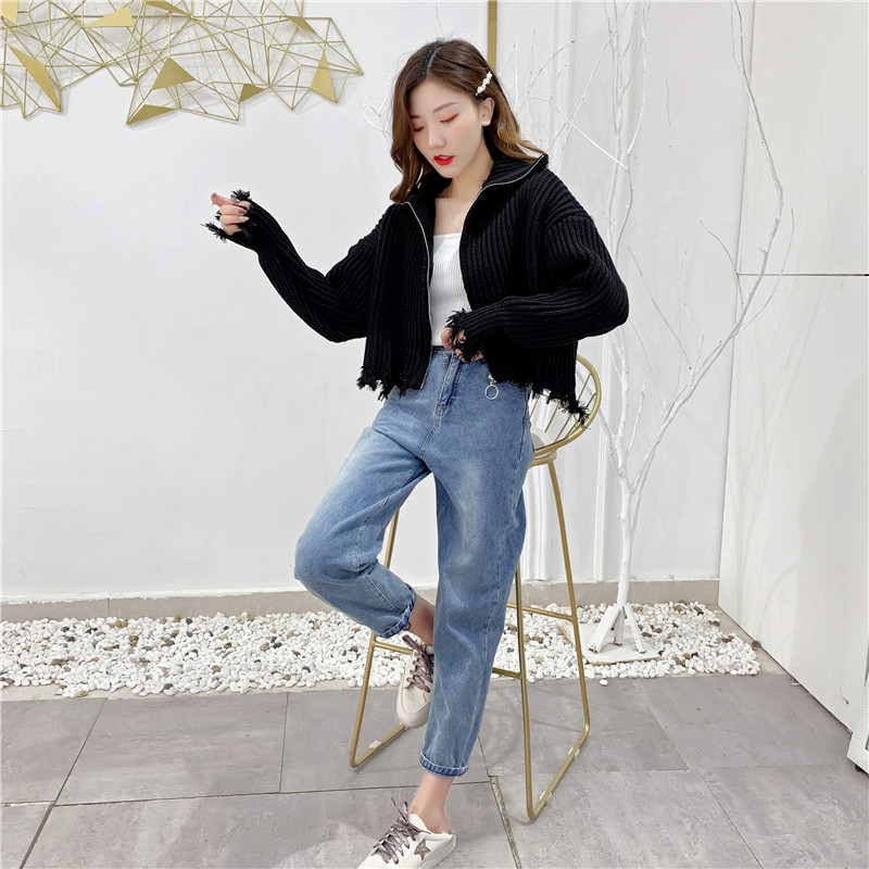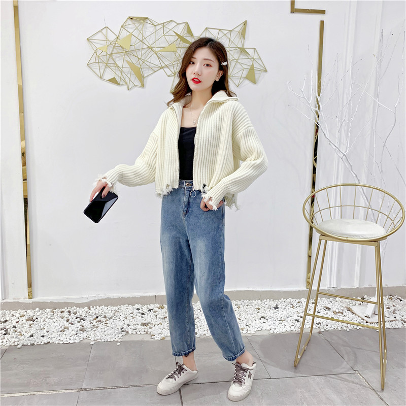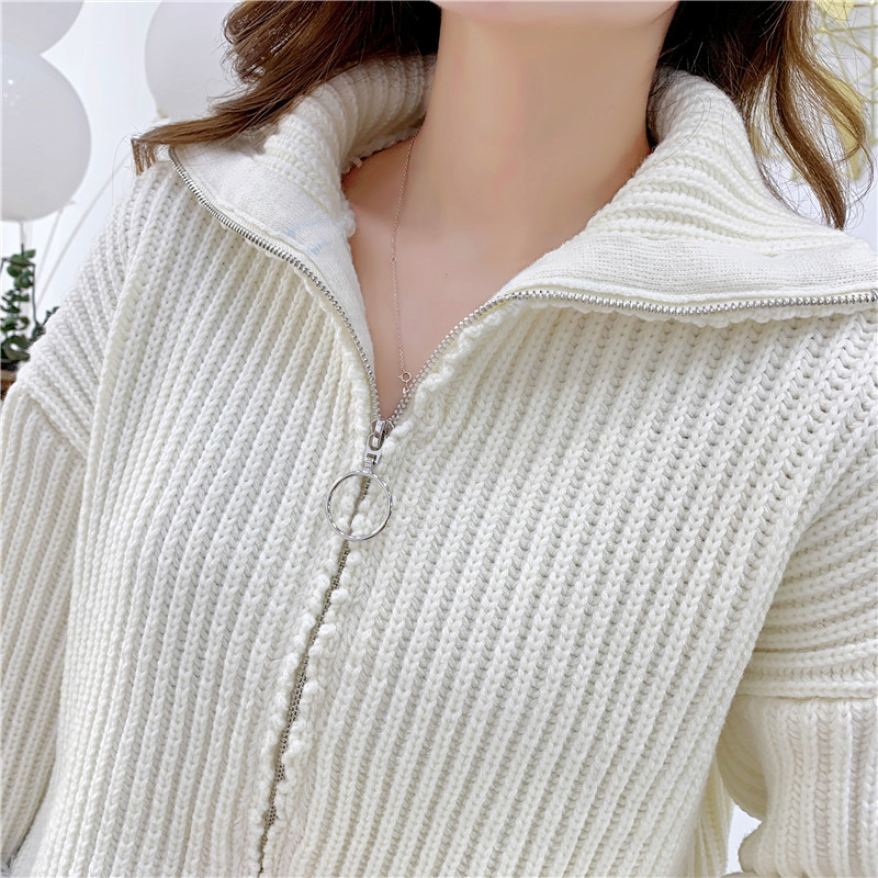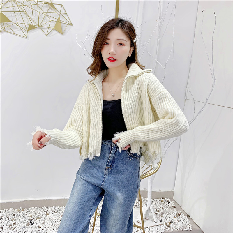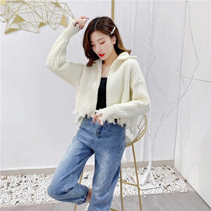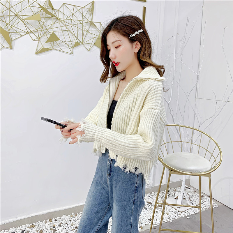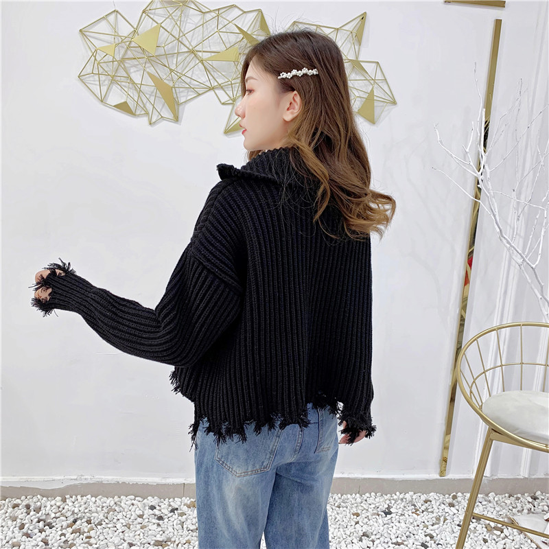 2019秋冬新款女裝寬松拉鏈毛衣短外套流蘇高領慵懶風針織開衫上衣1入