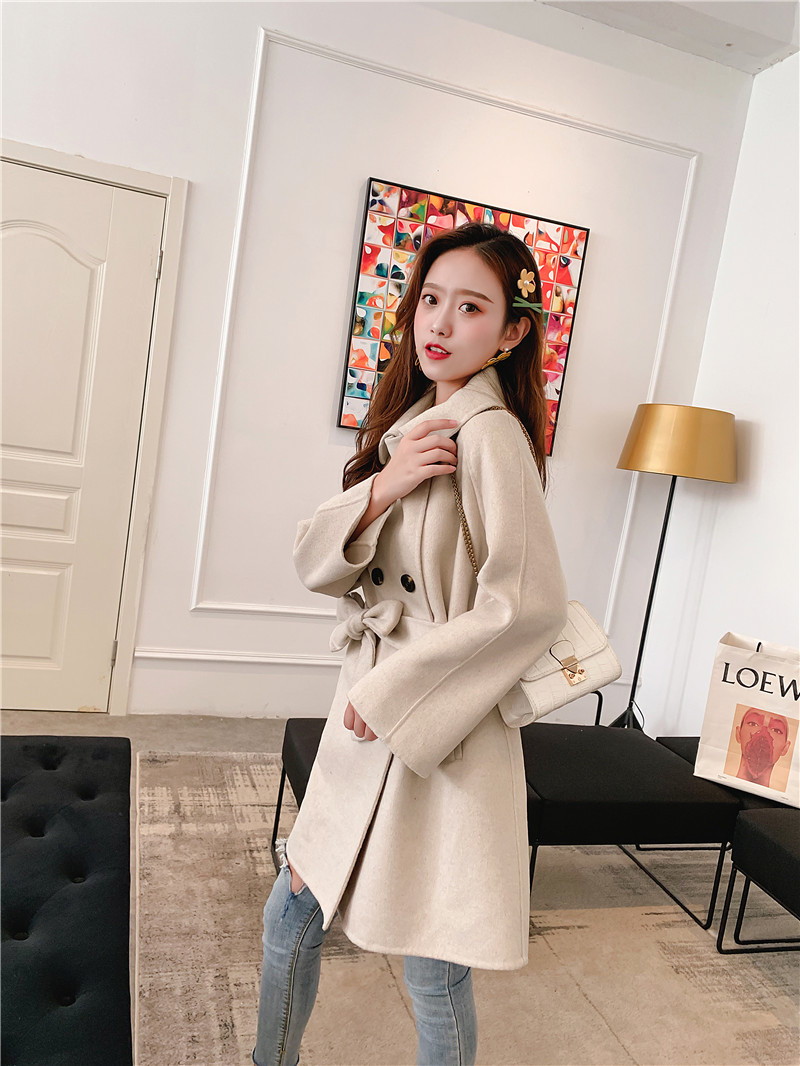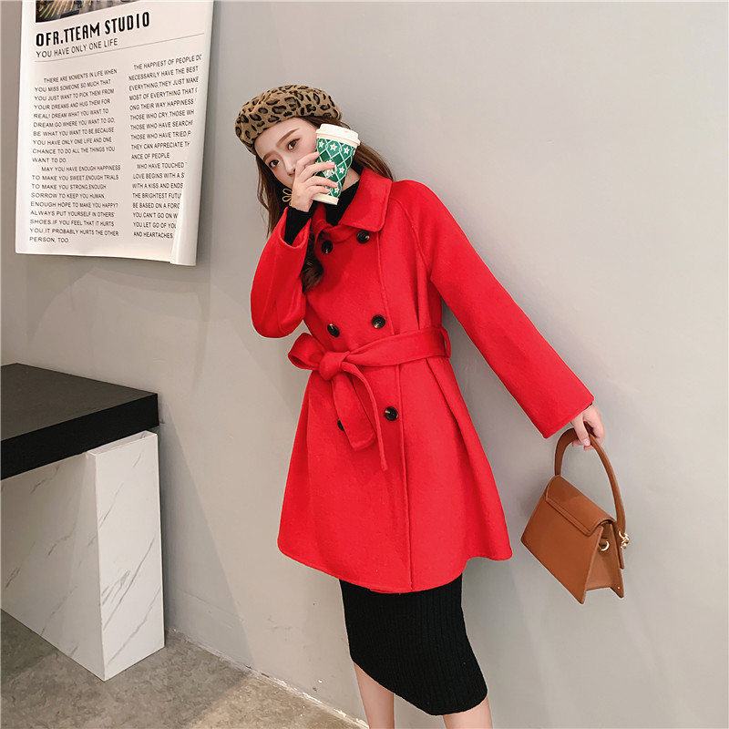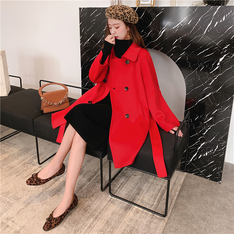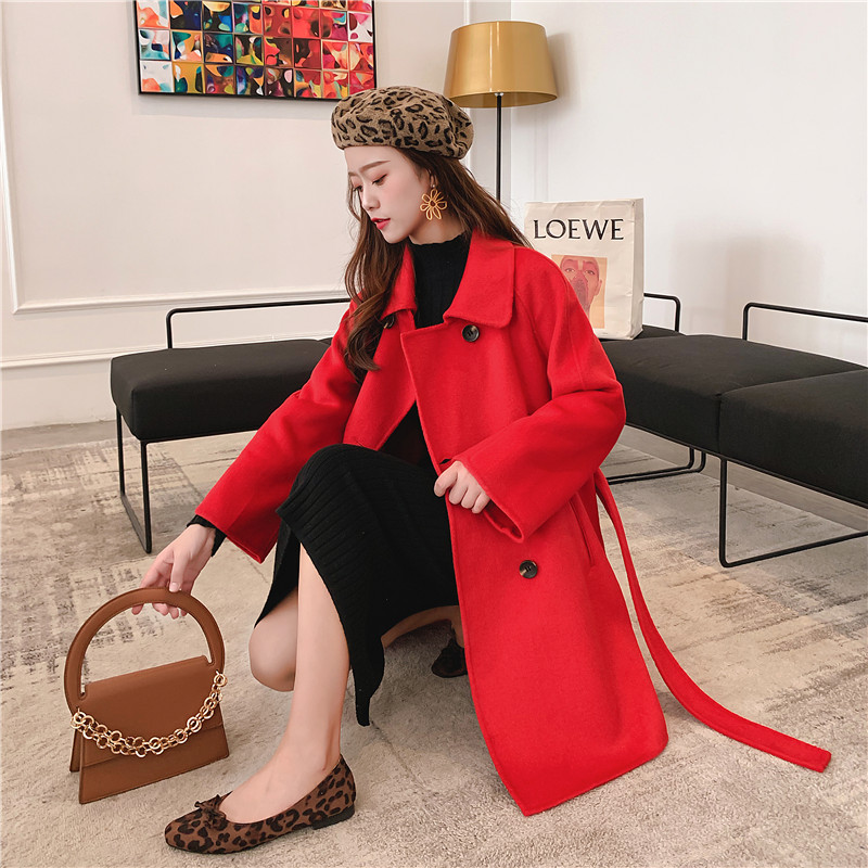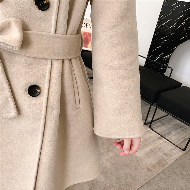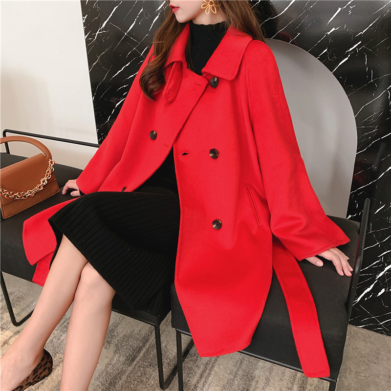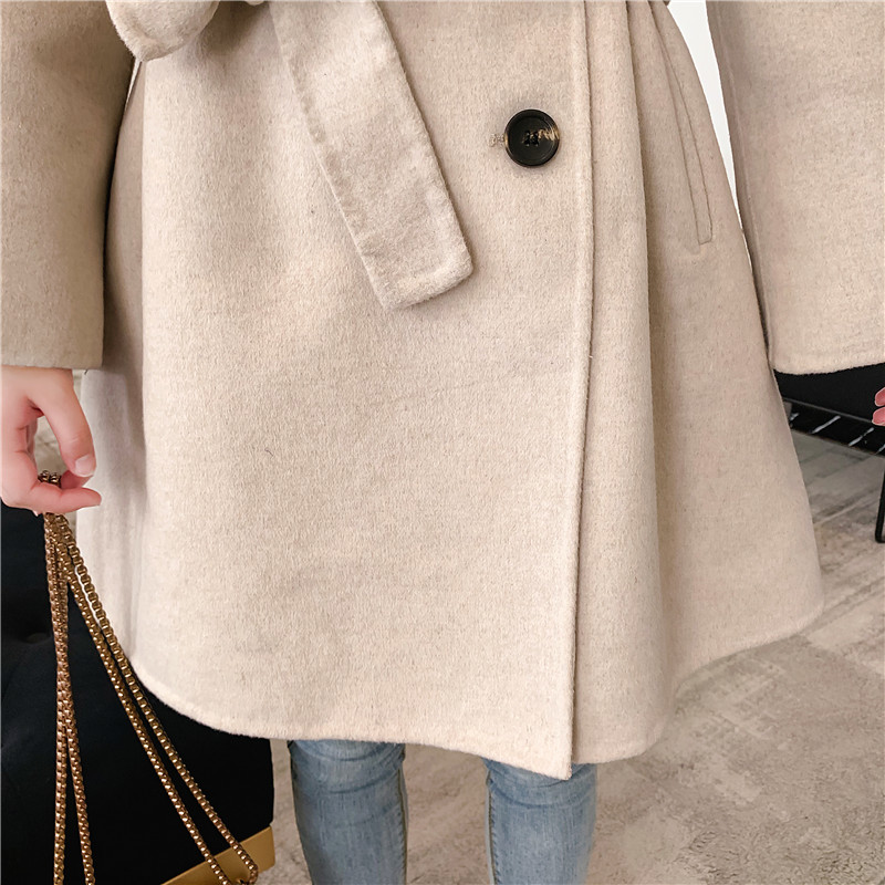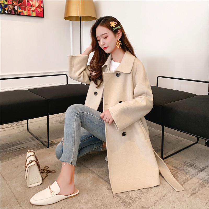 2019秋冬新款女中長款雙面毛呢大衣腰帶網紅收腰上衣羊絨開衫外套1入