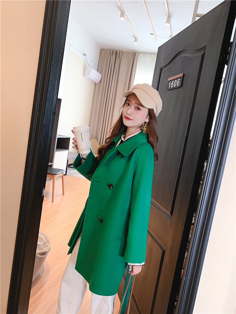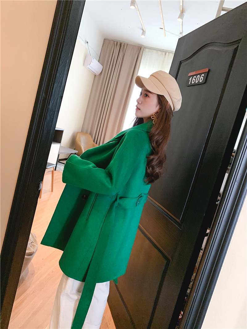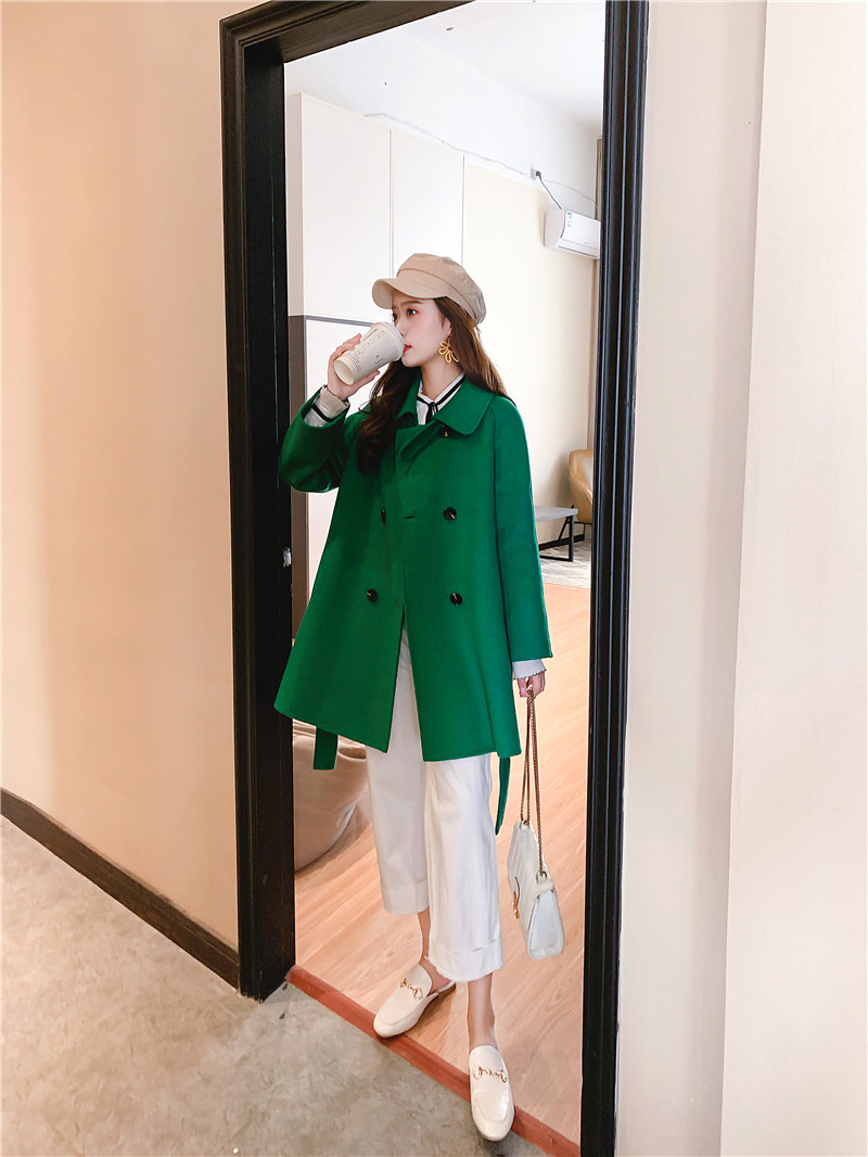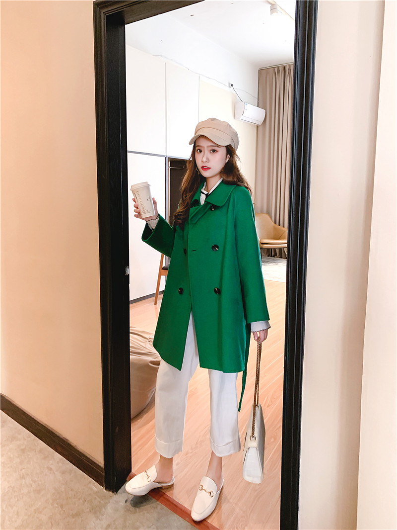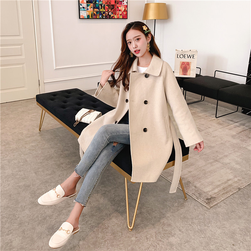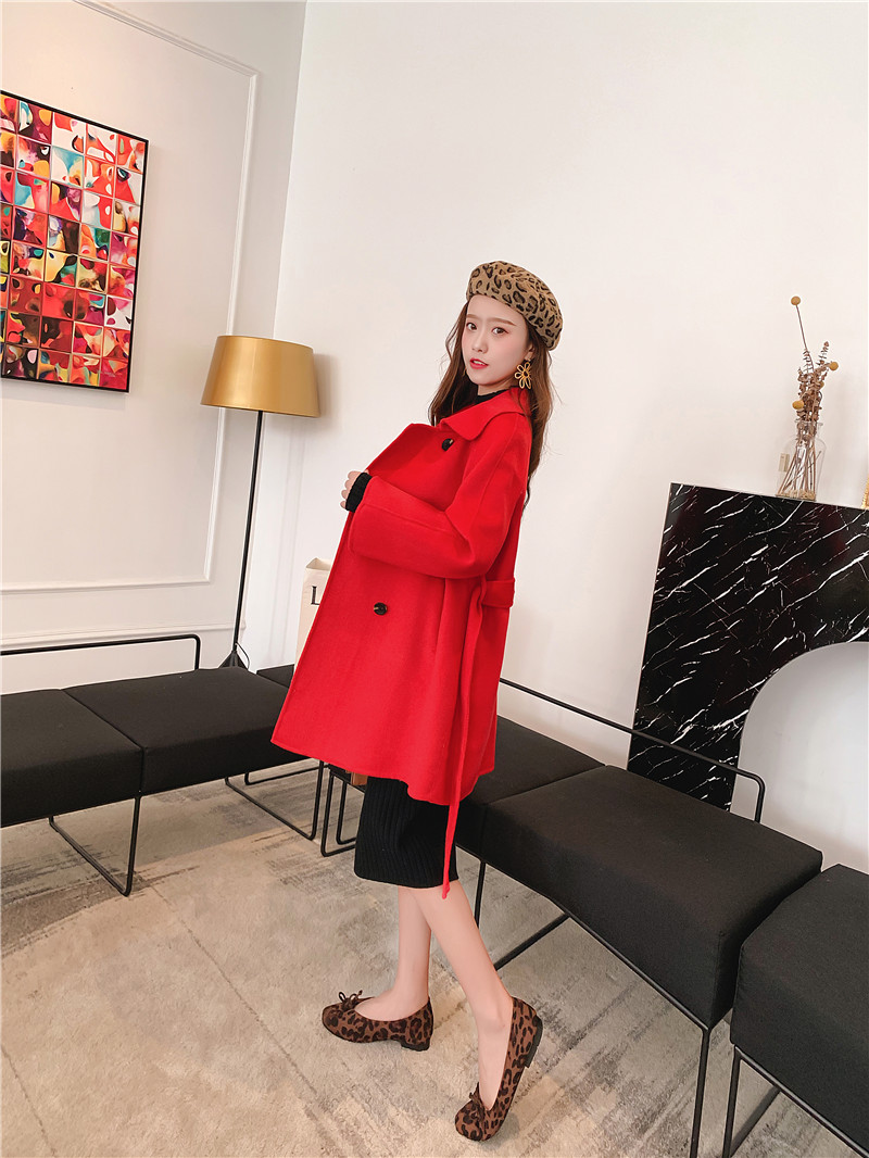 2019秋冬新款女中長款雙面毛呢大衣腰帶網紅收腰上衣羊絨開衫外套1入