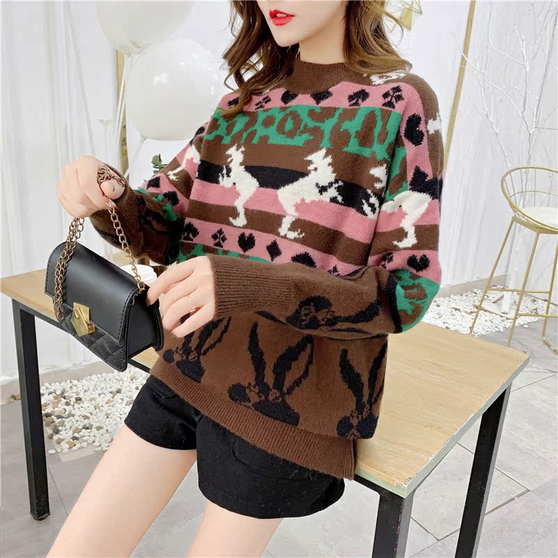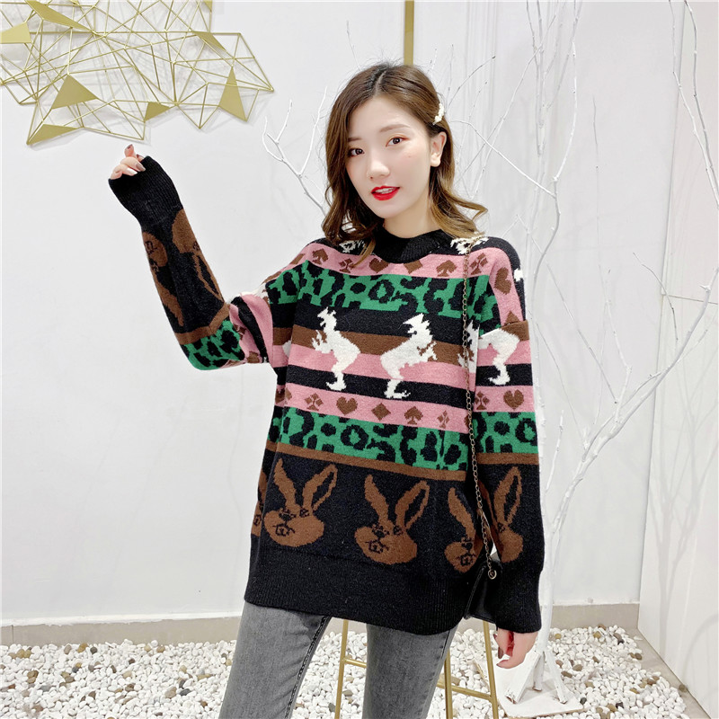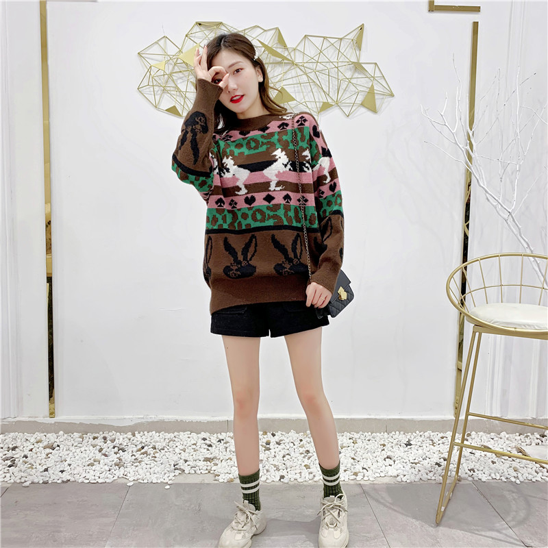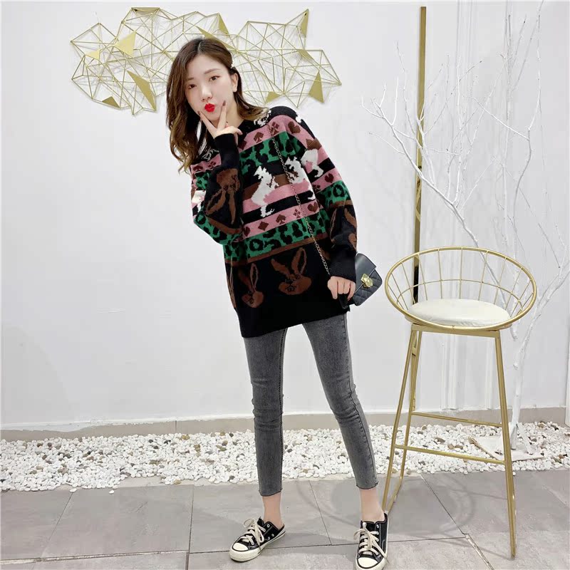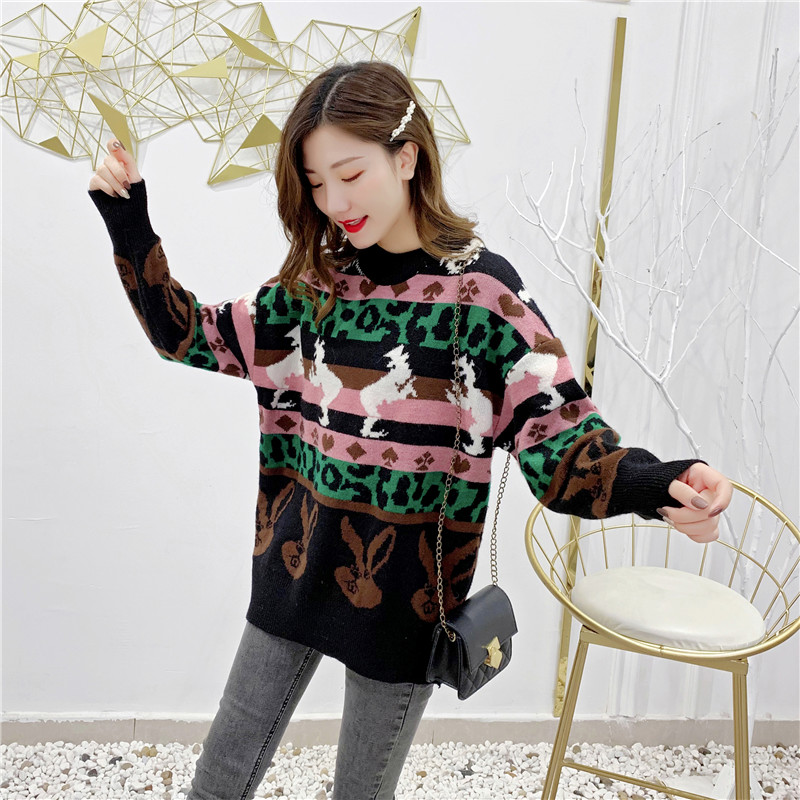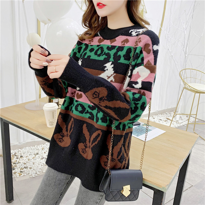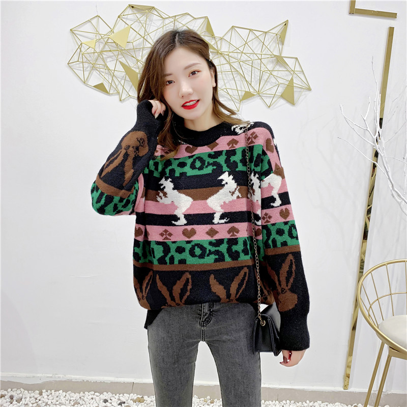 2019秋冬新款女寬松套頭毛衣撞色拼色提花學生慵懶針織打底衫上衣1入