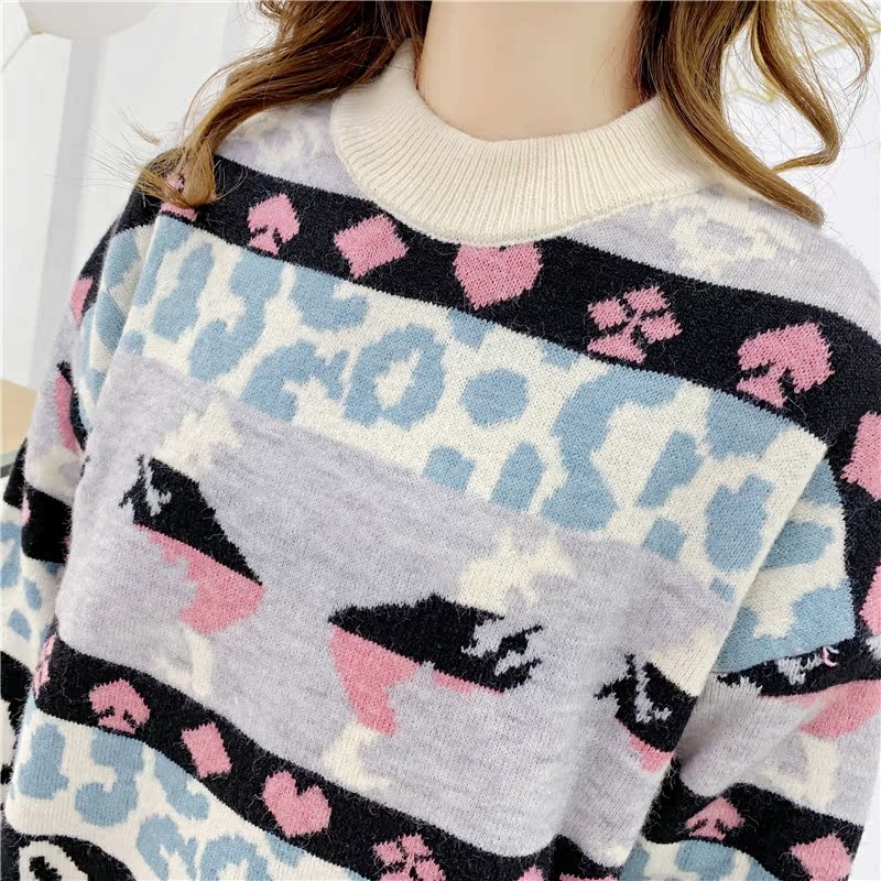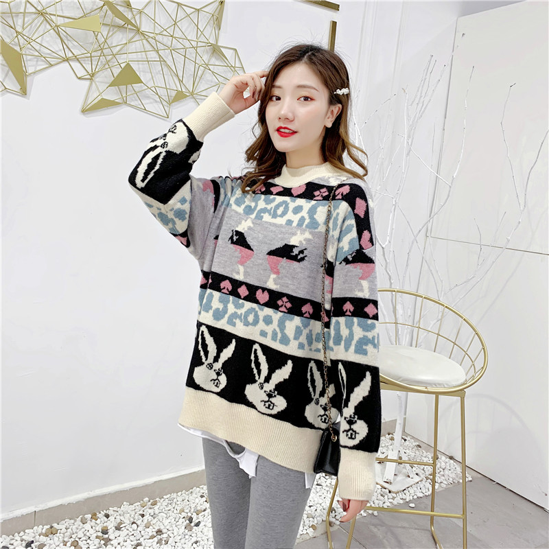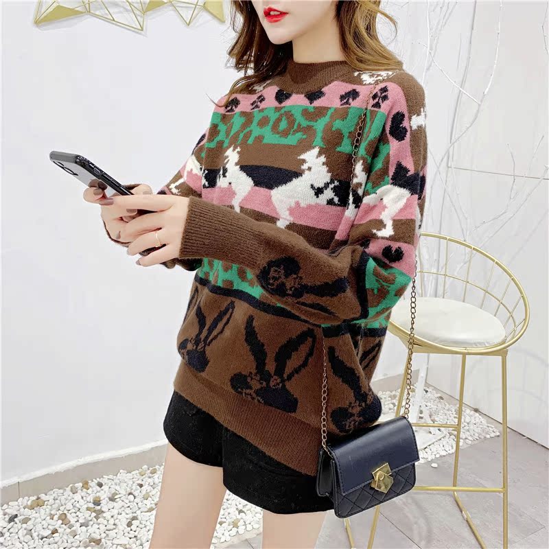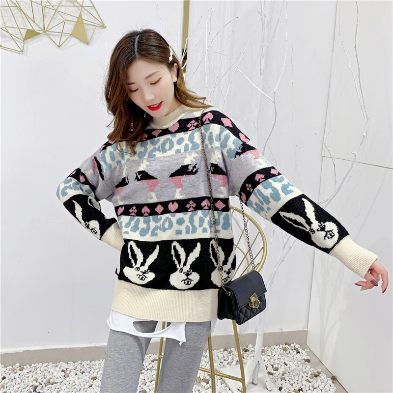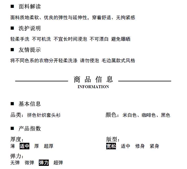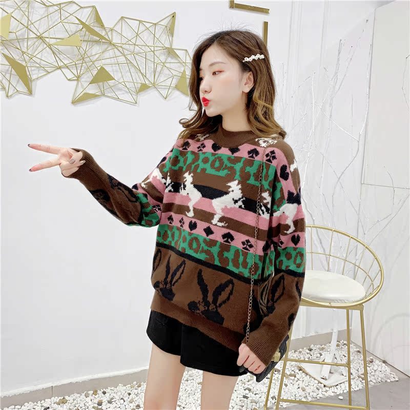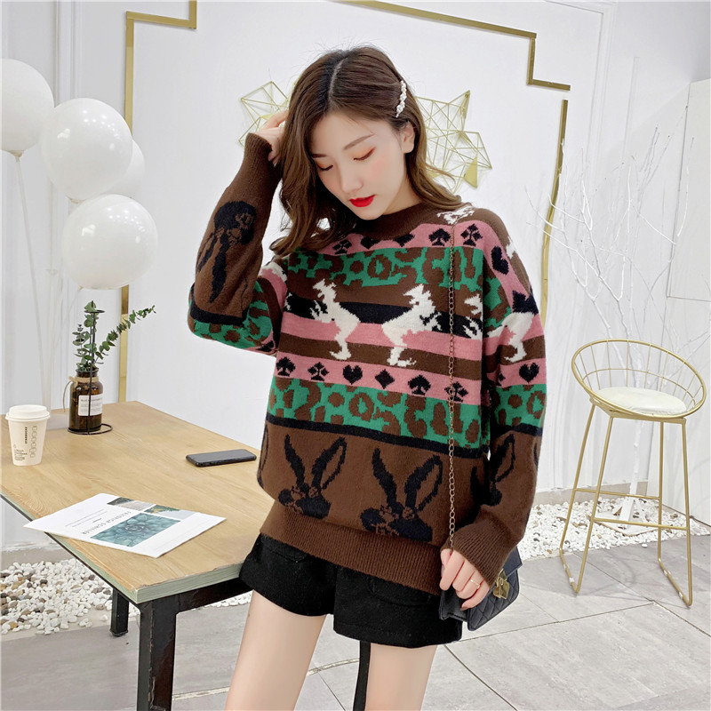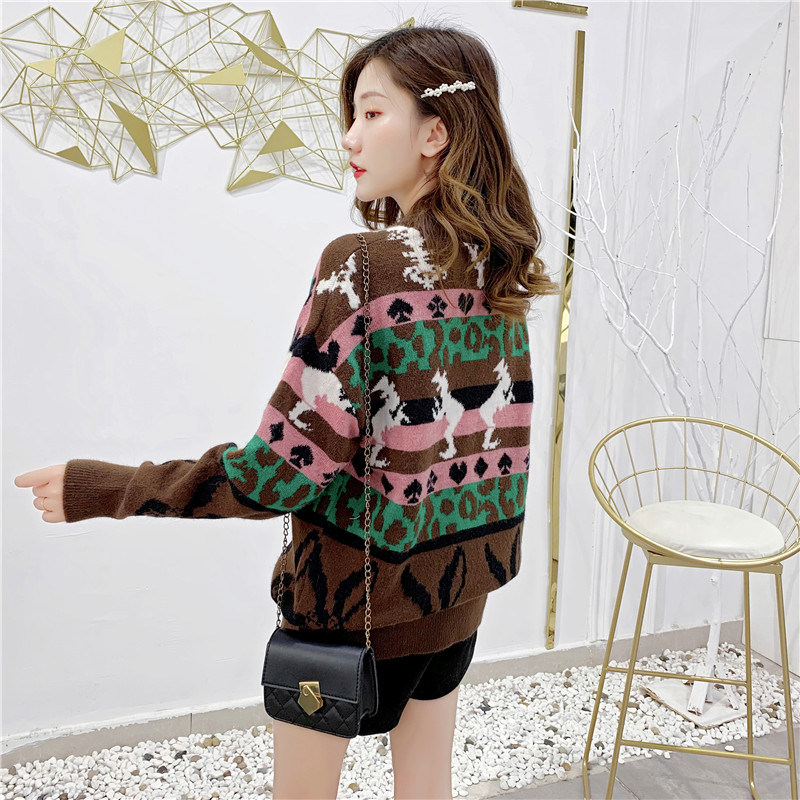 2019秋冬新款女寬松套頭毛衣撞色拼色提花學生慵懶針織打底衫上衣1入