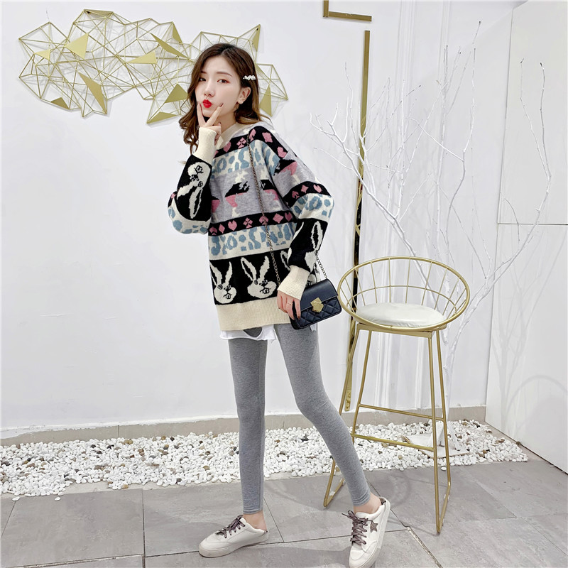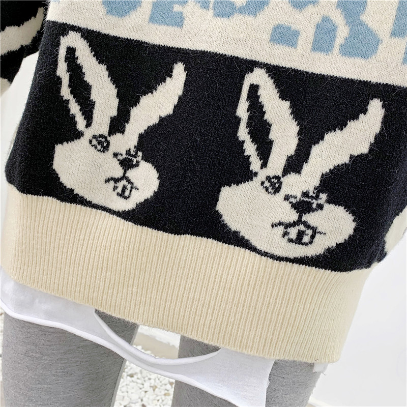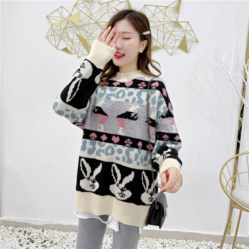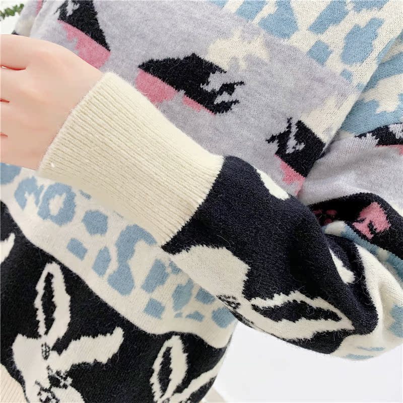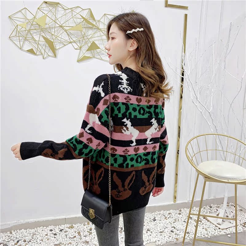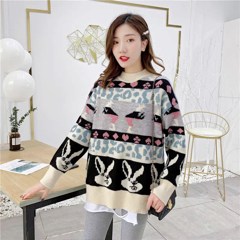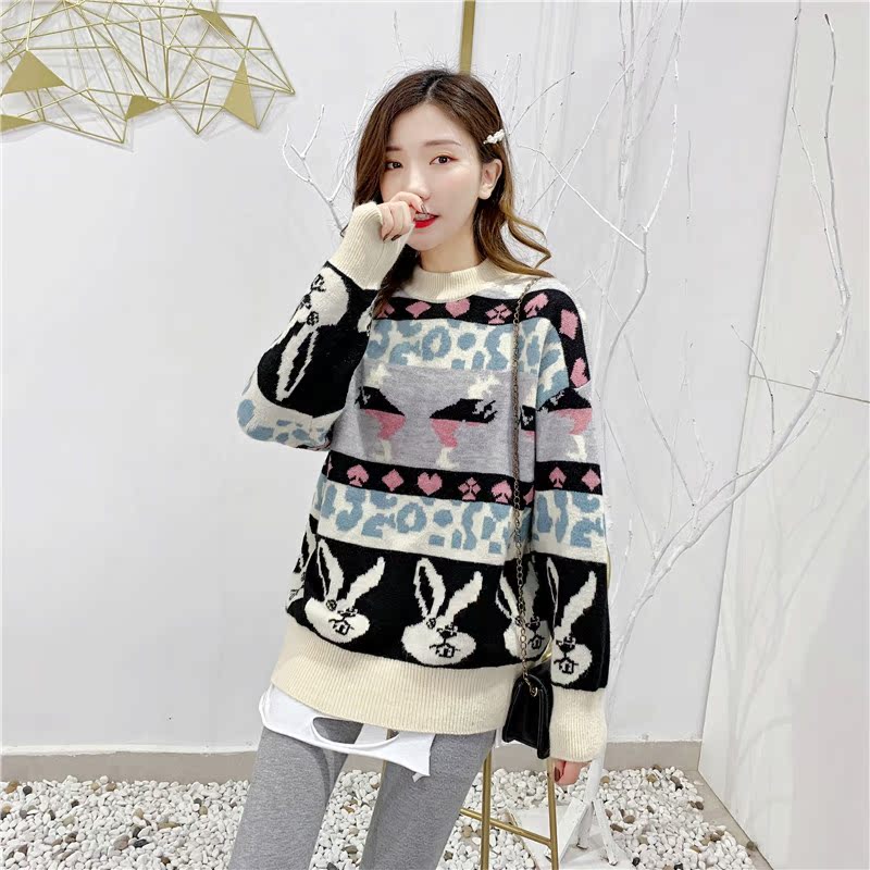2019秋冬新款女寬松套頭毛衣撞色拼色提花學生慵懶針織打底衫上衣1入