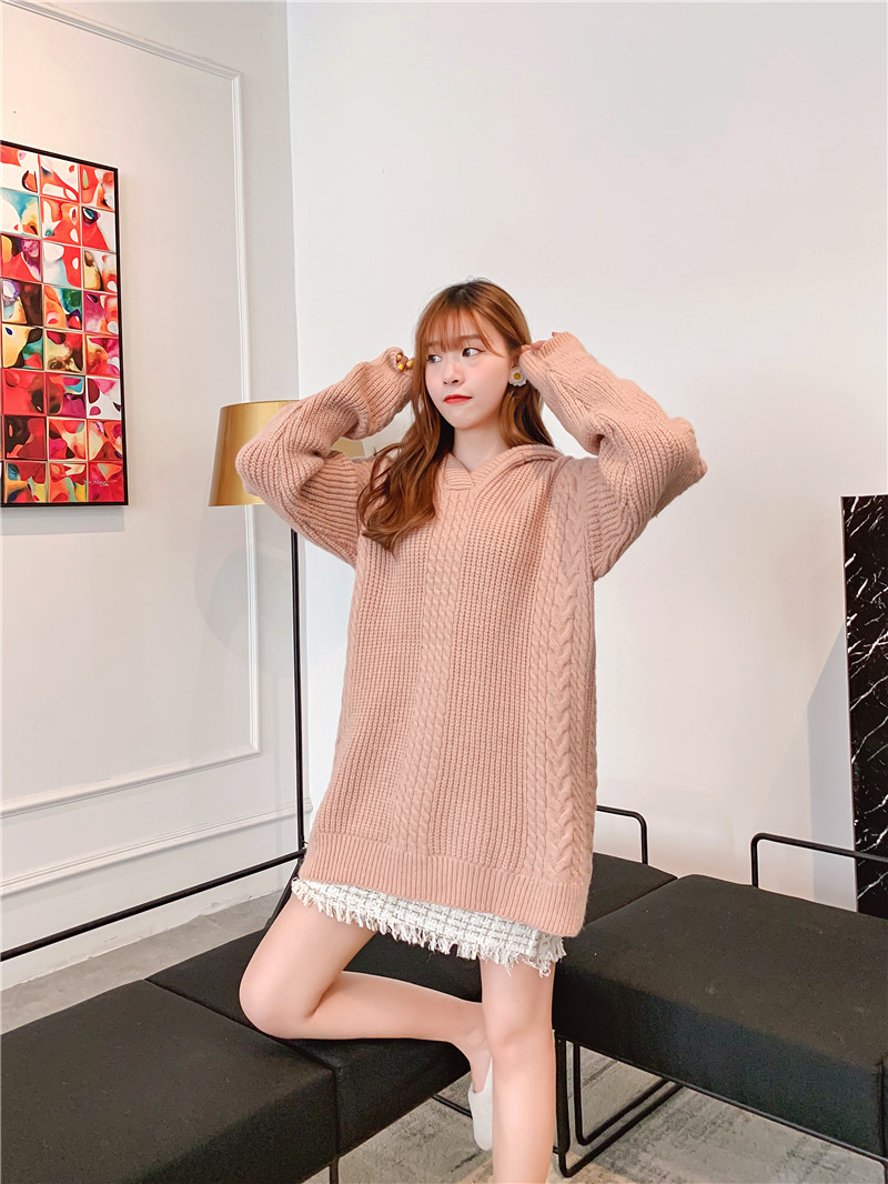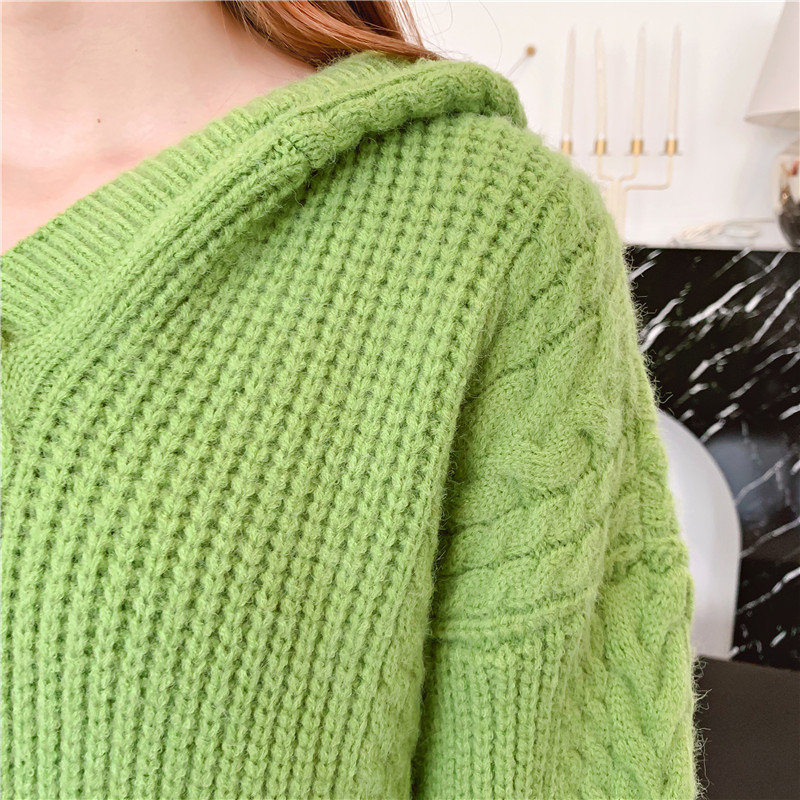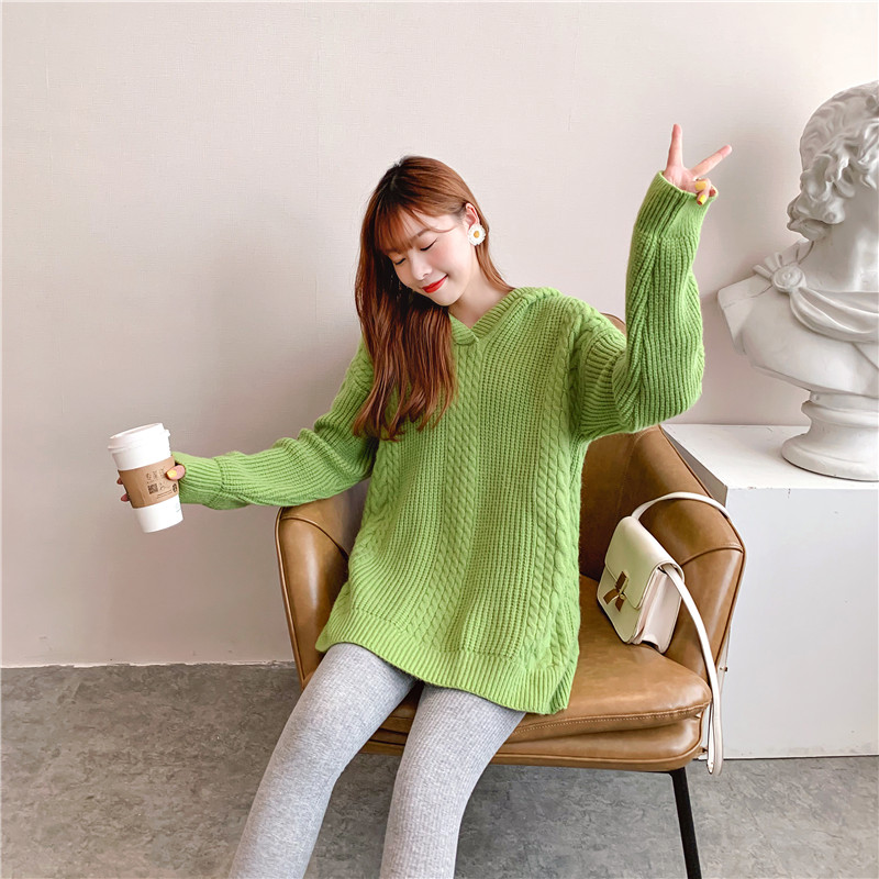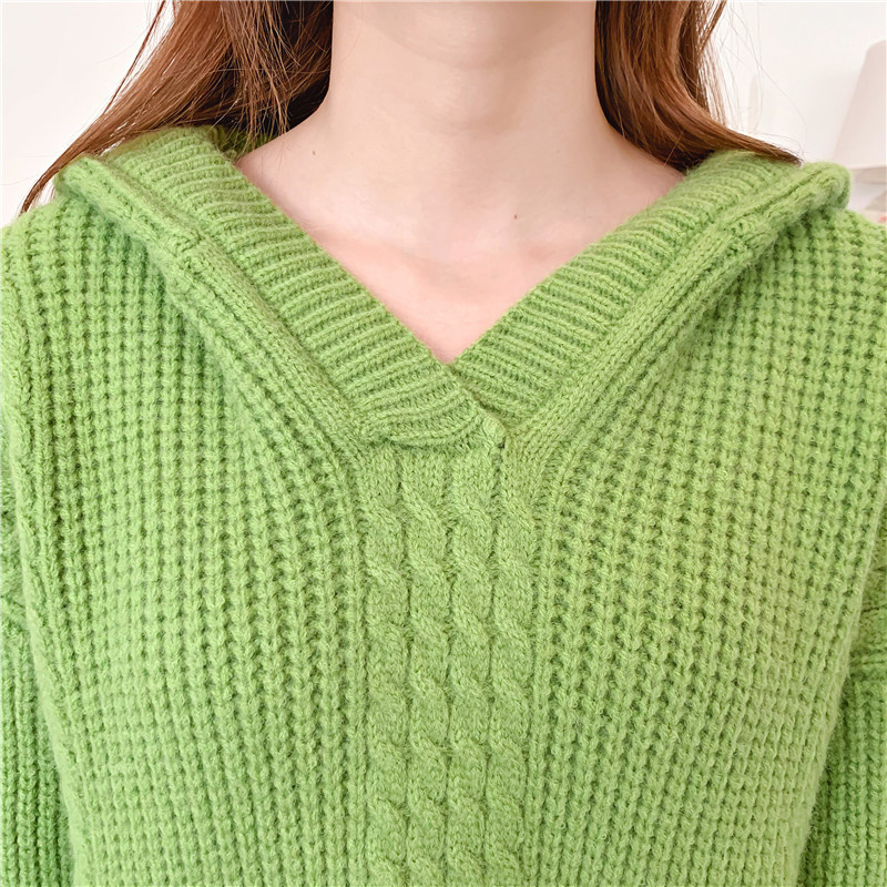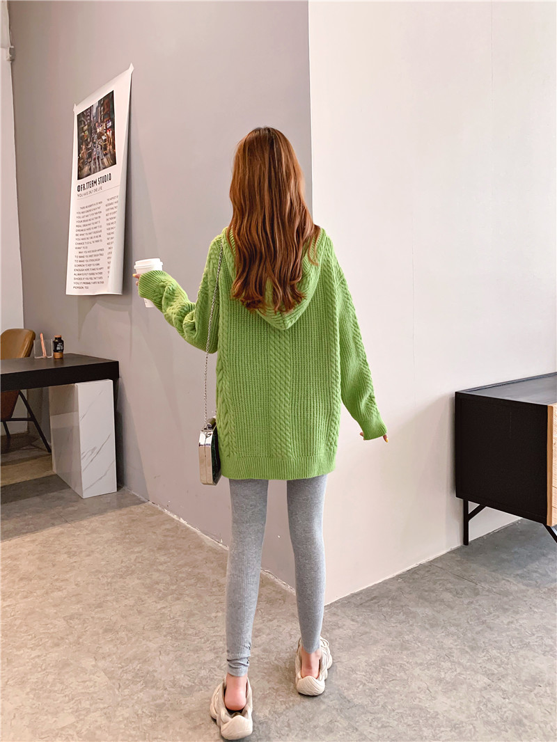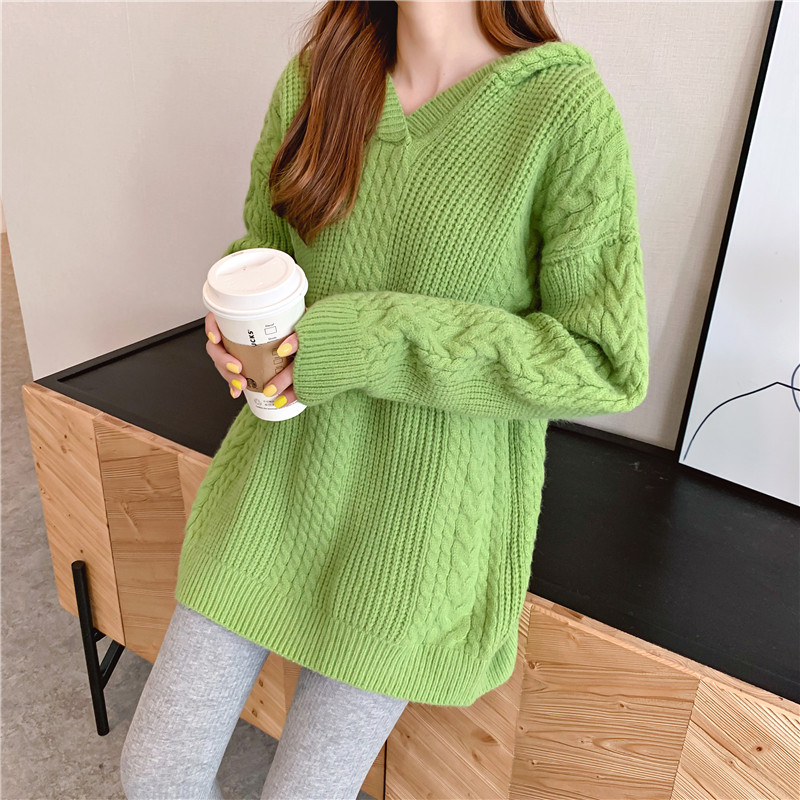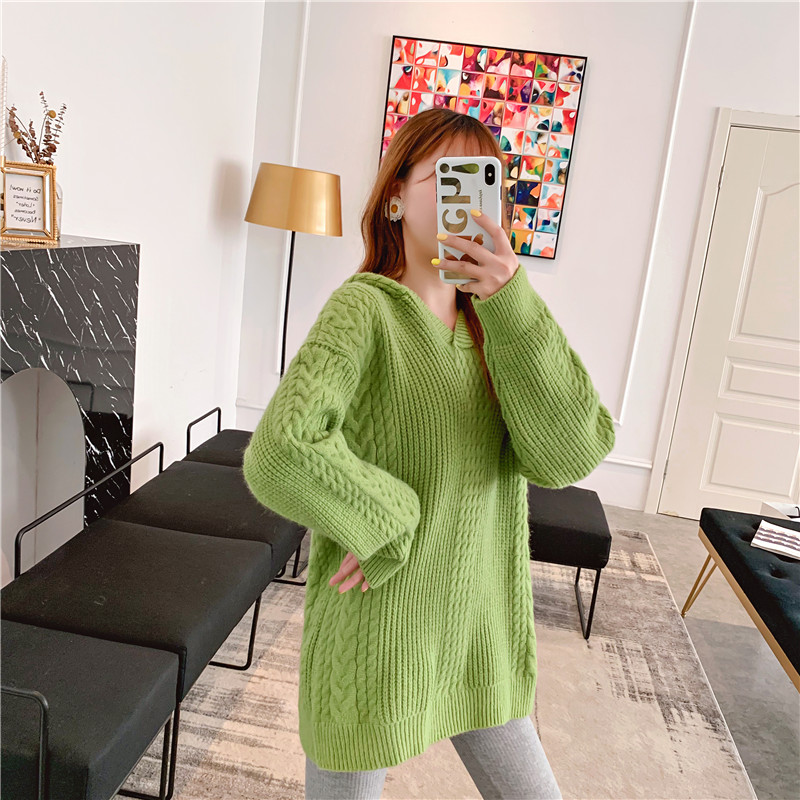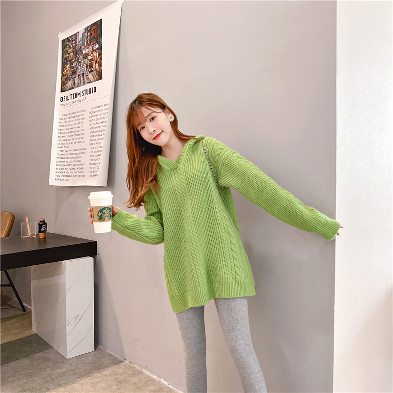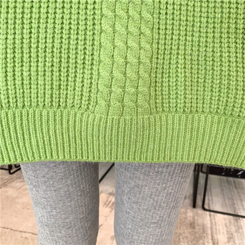 2019秋冬新款中長款連帽衛衣外套女慵懶套頭毛衣牛油果綠針織上衣1入