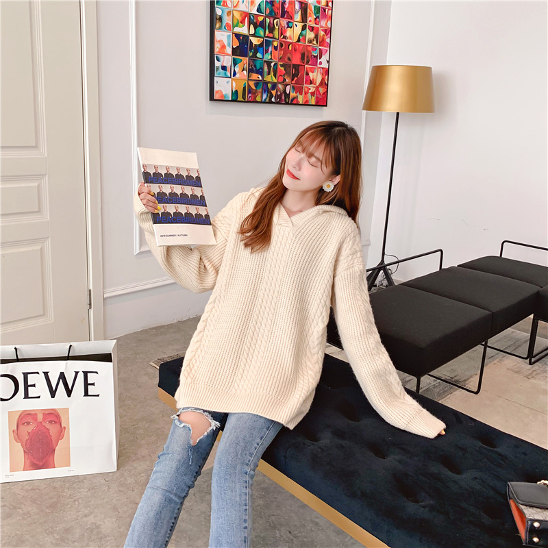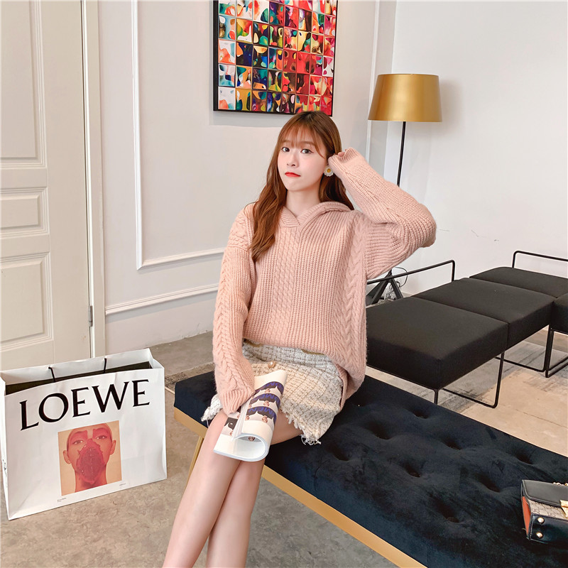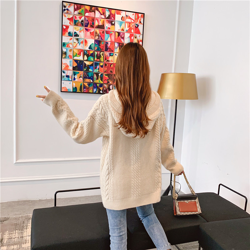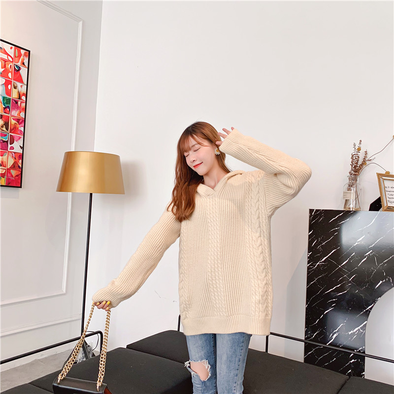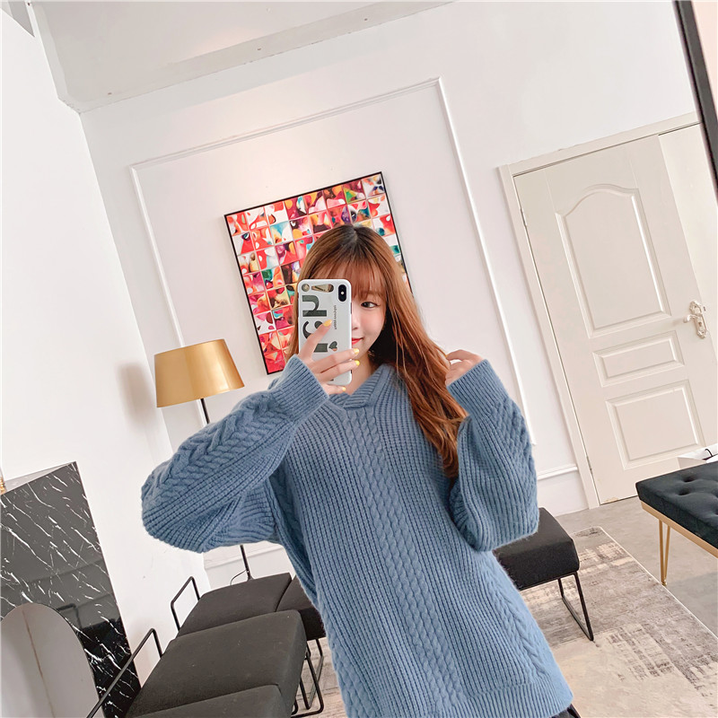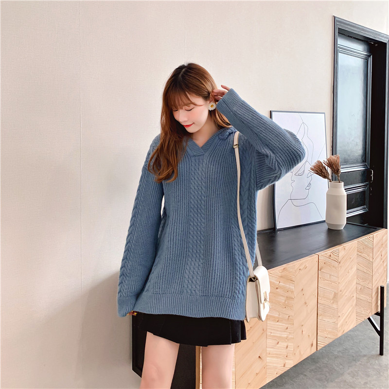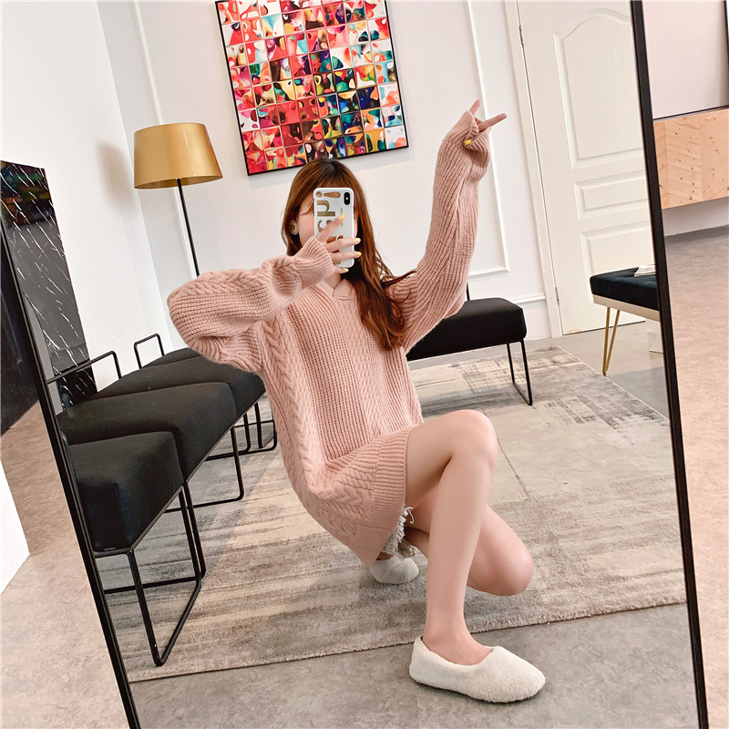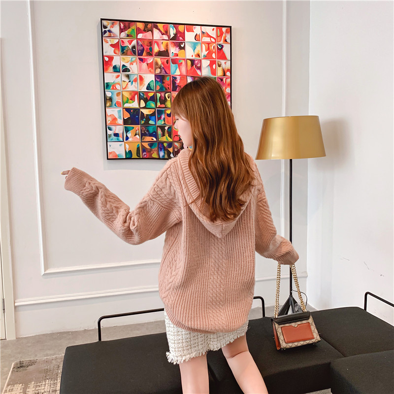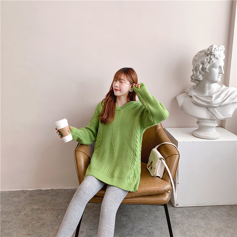 2019秋冬新款中長款連帽衛衣外套女慵懶套頭毛衣牛油果綠針織上衣1入