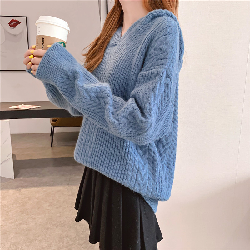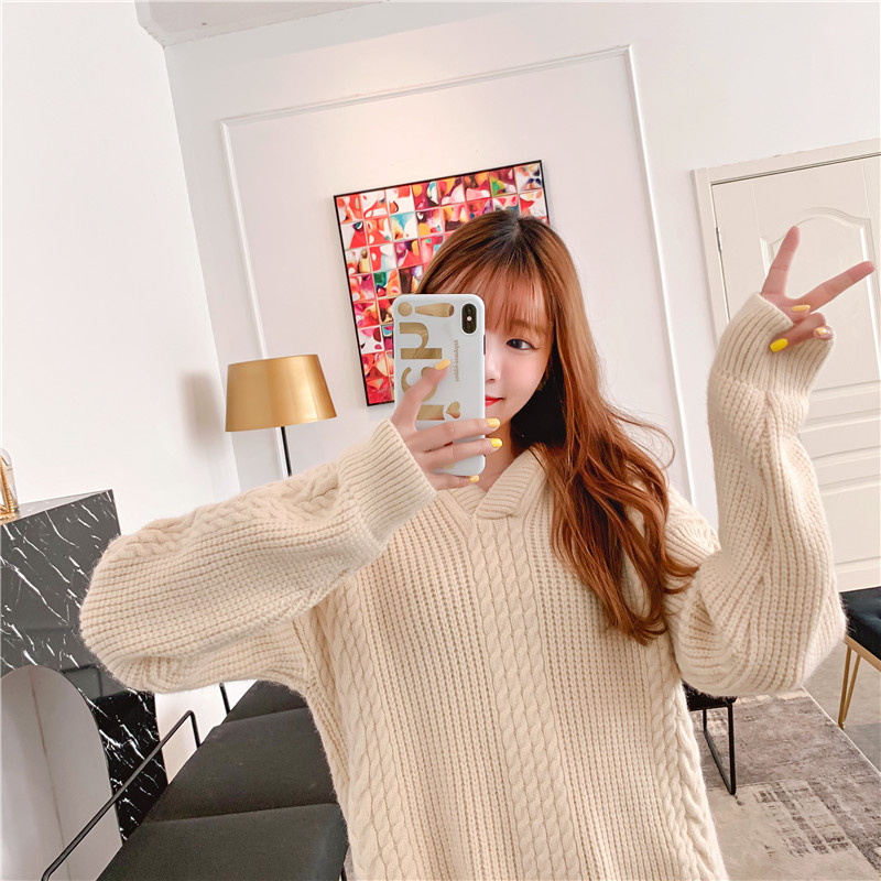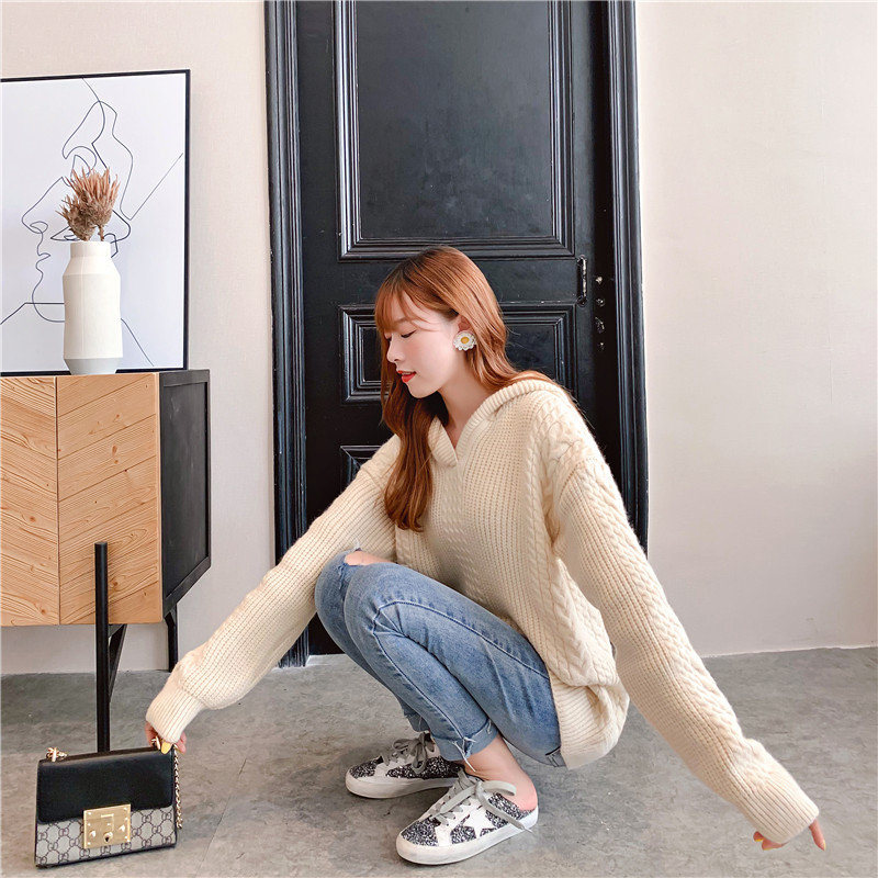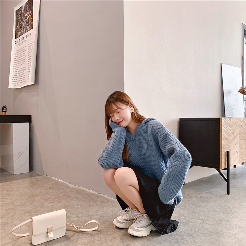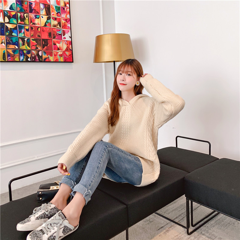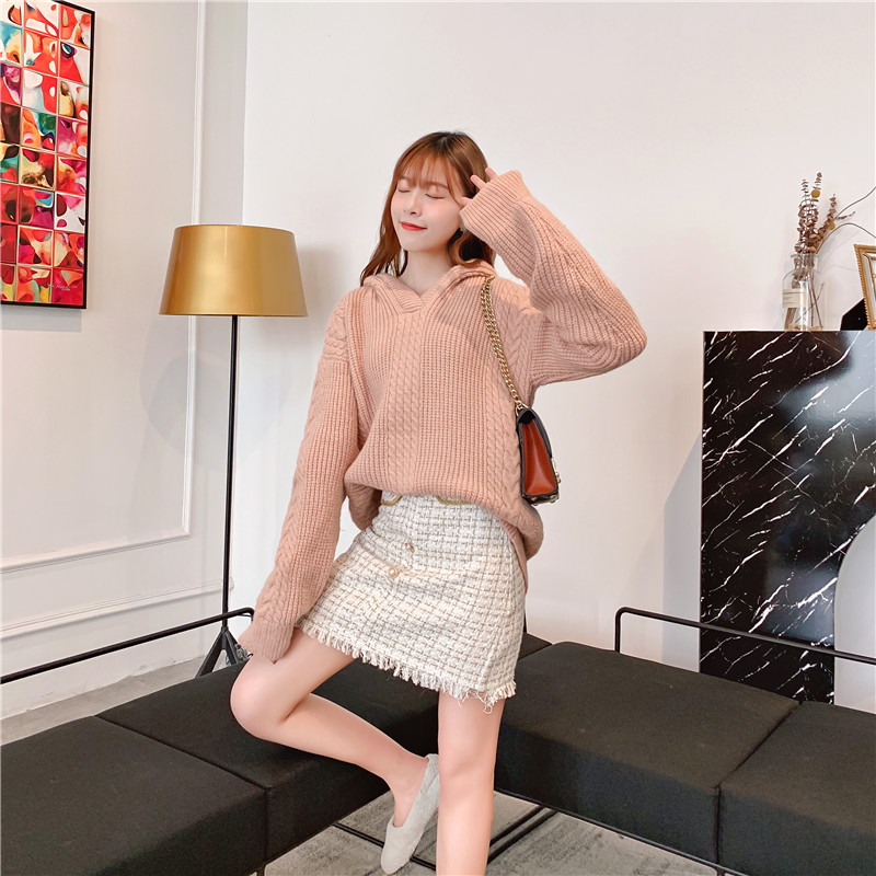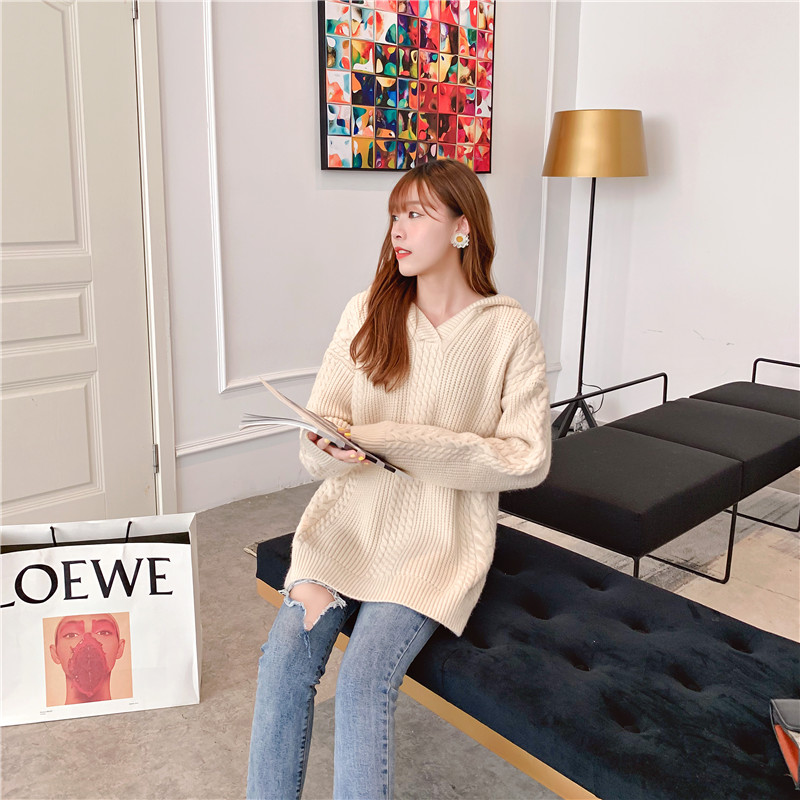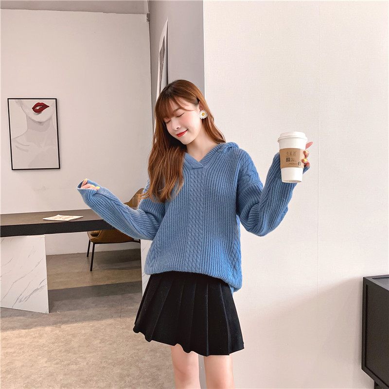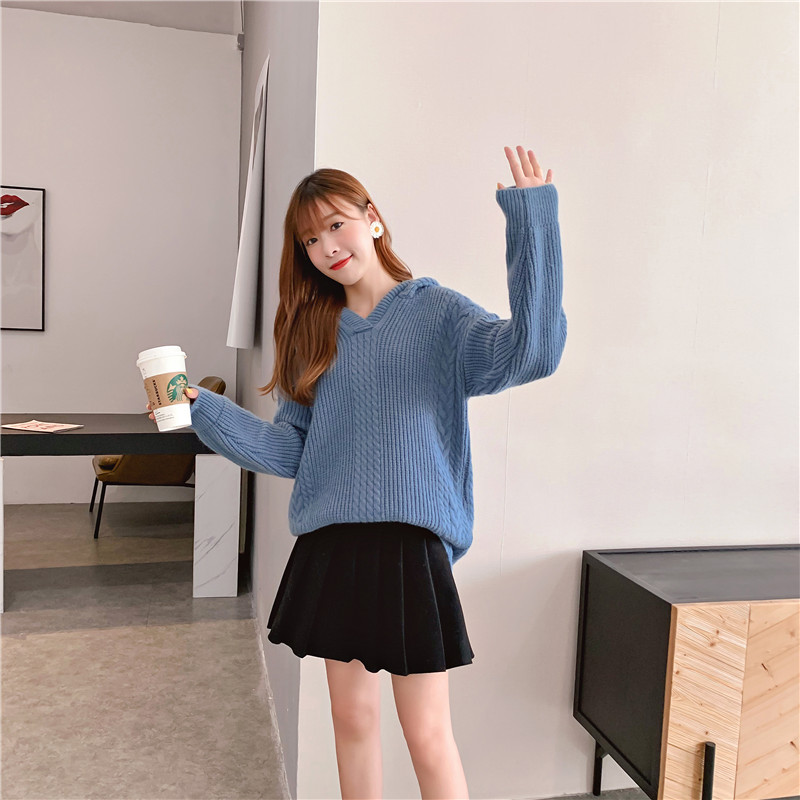 2019秋冬新款中長款連帽衛衣外套女慵懶套頭毛衣牛油果綠針織上衣1入