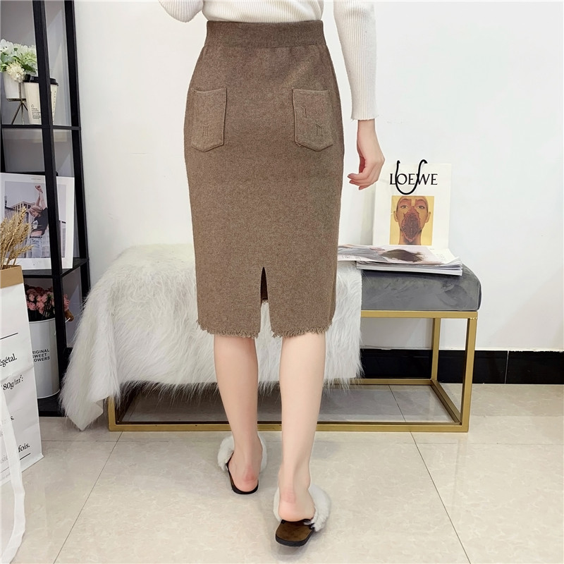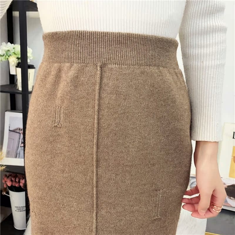 針織半身裙秋冬2019新款女包臀一步裙中長款開衩破洞口袋松緊腰裙1入